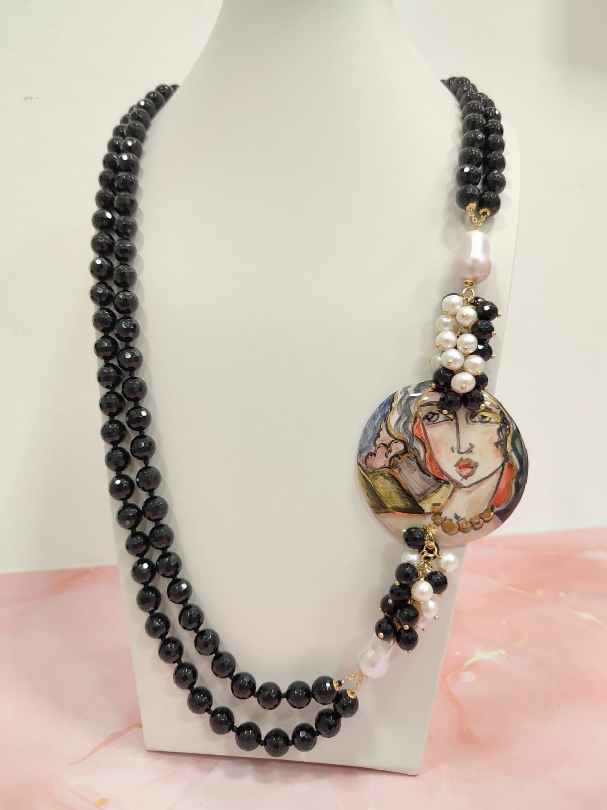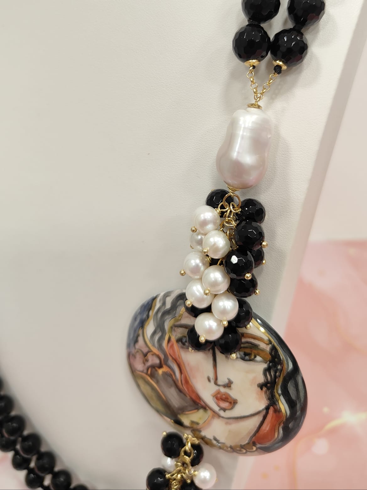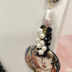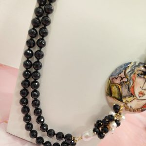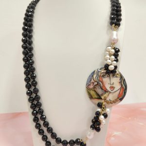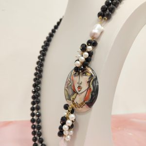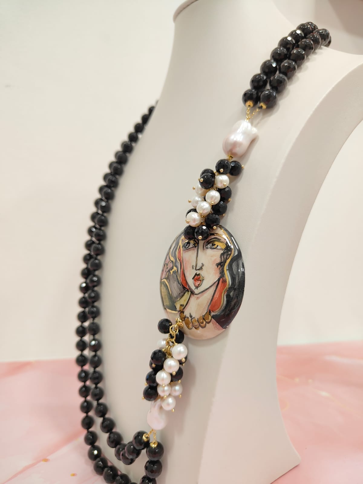 Il design si sviluppa su due fili di onice nero naturale sfaccettato, con sfere da 10 mm che riflettono la luce con discrezione. Al centro, il pendente in ceramica artistica diventa il fulcro narrativo della composizione: un volto di donna dipinto a mano, ricco di sfumature cromatiche e dettagli pittorici, che conferisce al gioiello un carattere unico e riconoscibile. Inoltre, la presenza delle perle barocche aggiunge movimento e luminosità, ammorbidendo l’intensità del nero.
