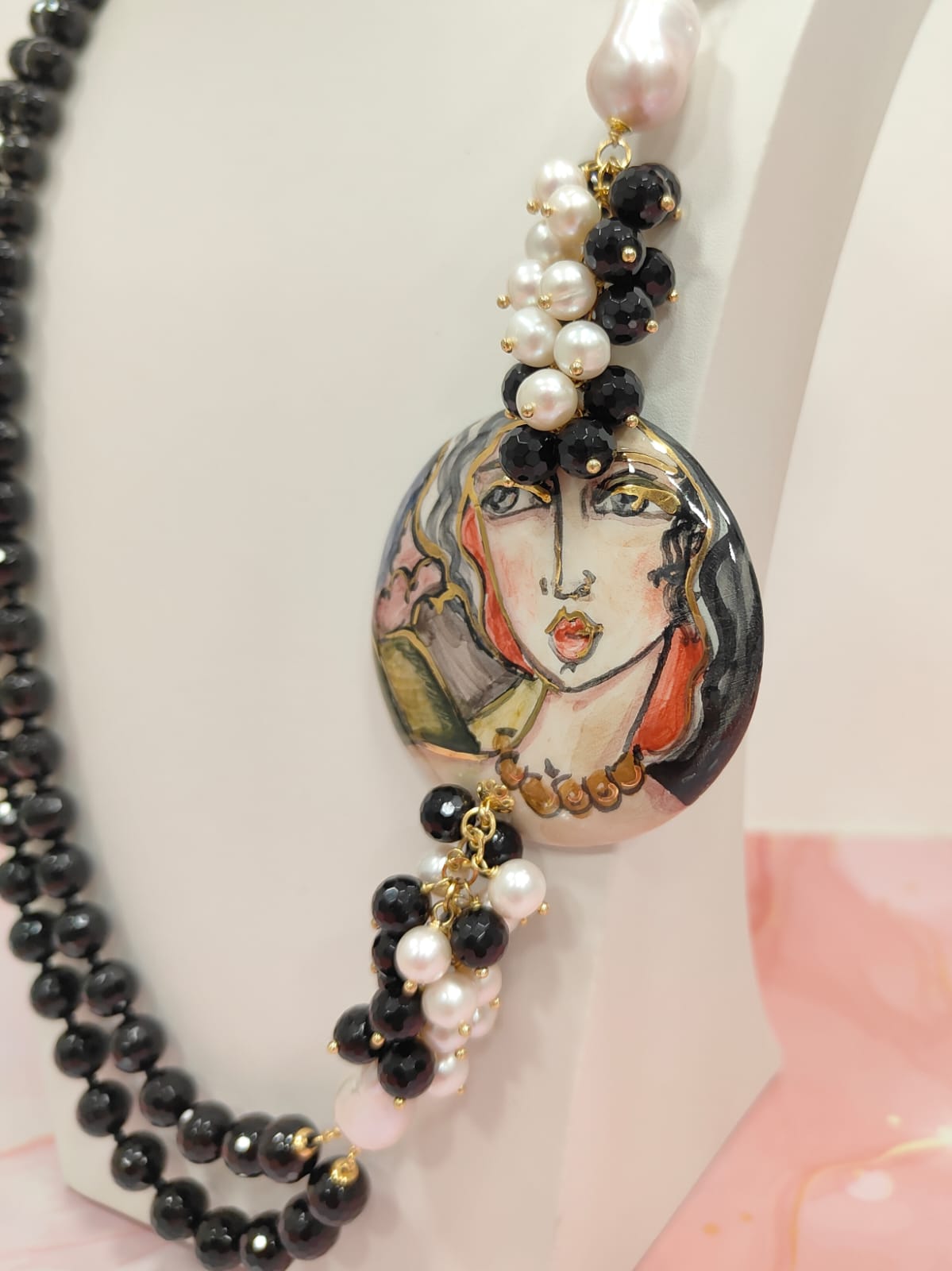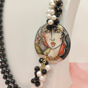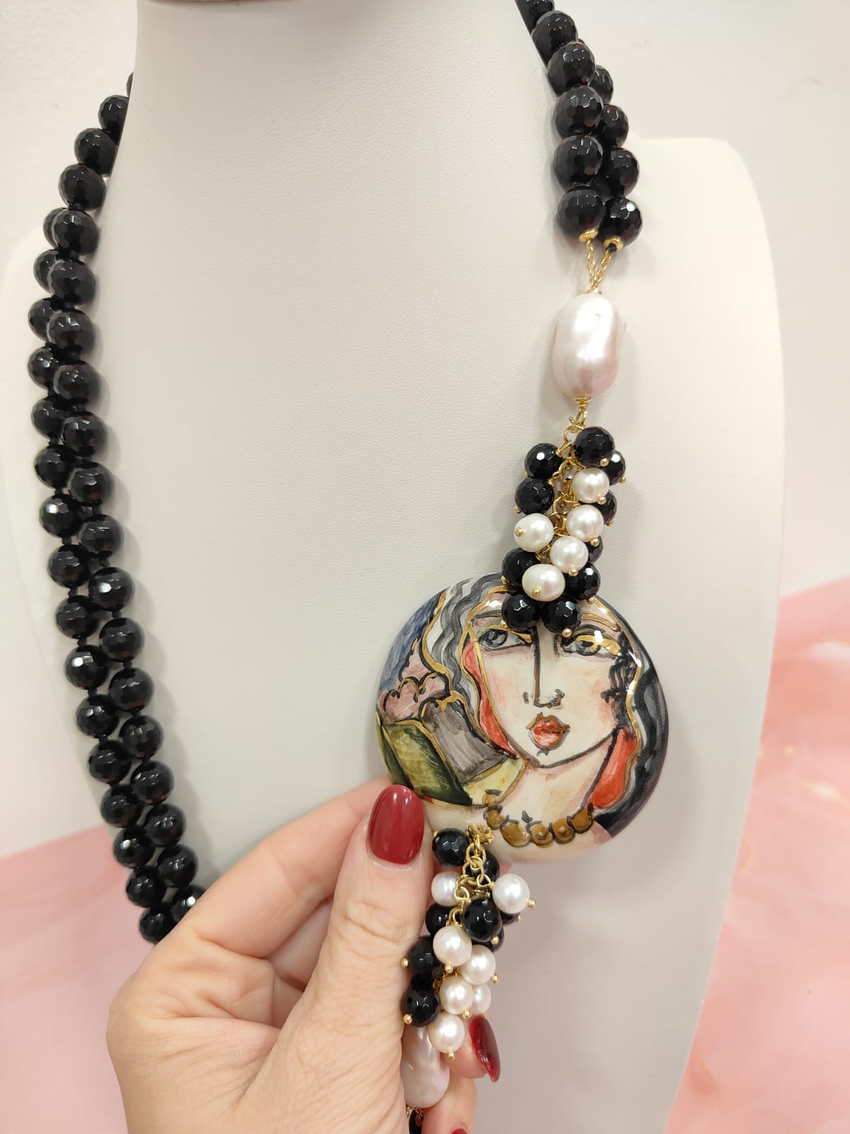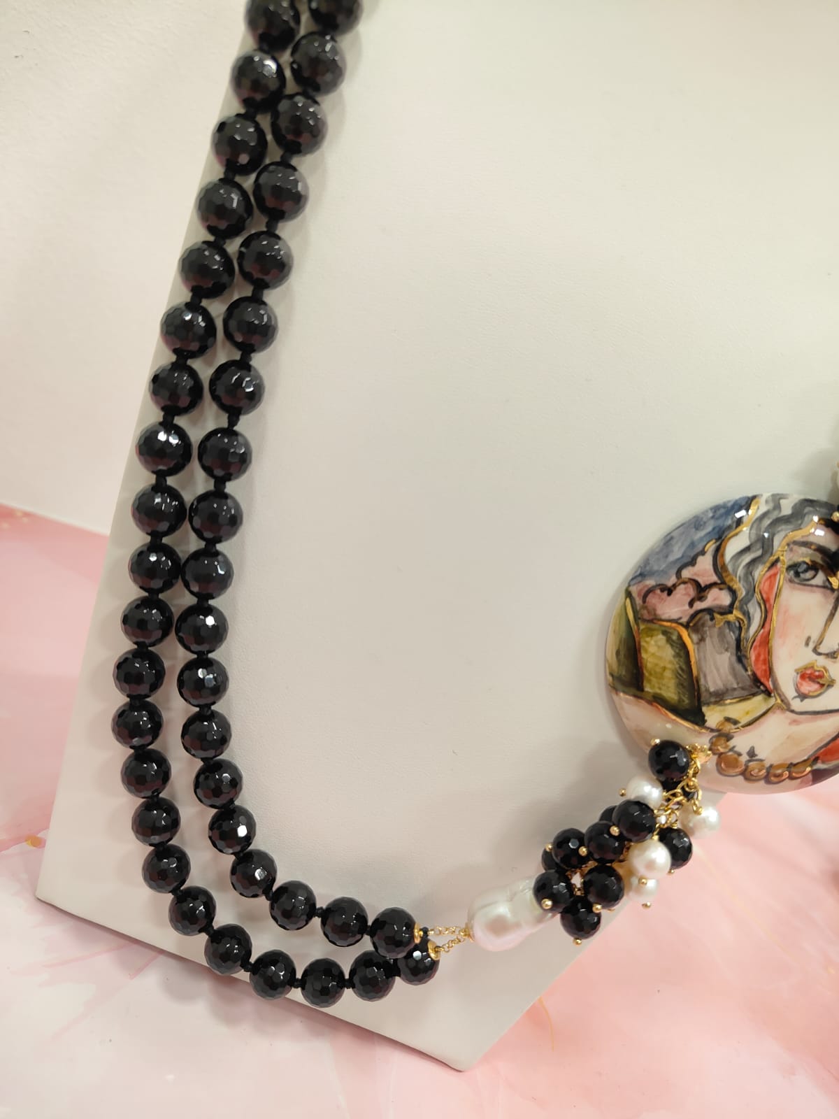 Il design si sviluppa su due fili di onice nero naturale sfaccettato, con sfere da 10 mm che riflettono la luce con discrezione. Al centro, il pendente in ceramica artistica diventa il fulcro narrativo della composizione: un volto di donna dipinto a mano, ricco di sfumature cromatiche e dettagli pittorici, che conferisce al gioiello un carattere unico e riconoscibile. Inoltre, la presenza delle perle barocche aggiunge movimento e luminosità, ammorbidendo l’intensità del nero.