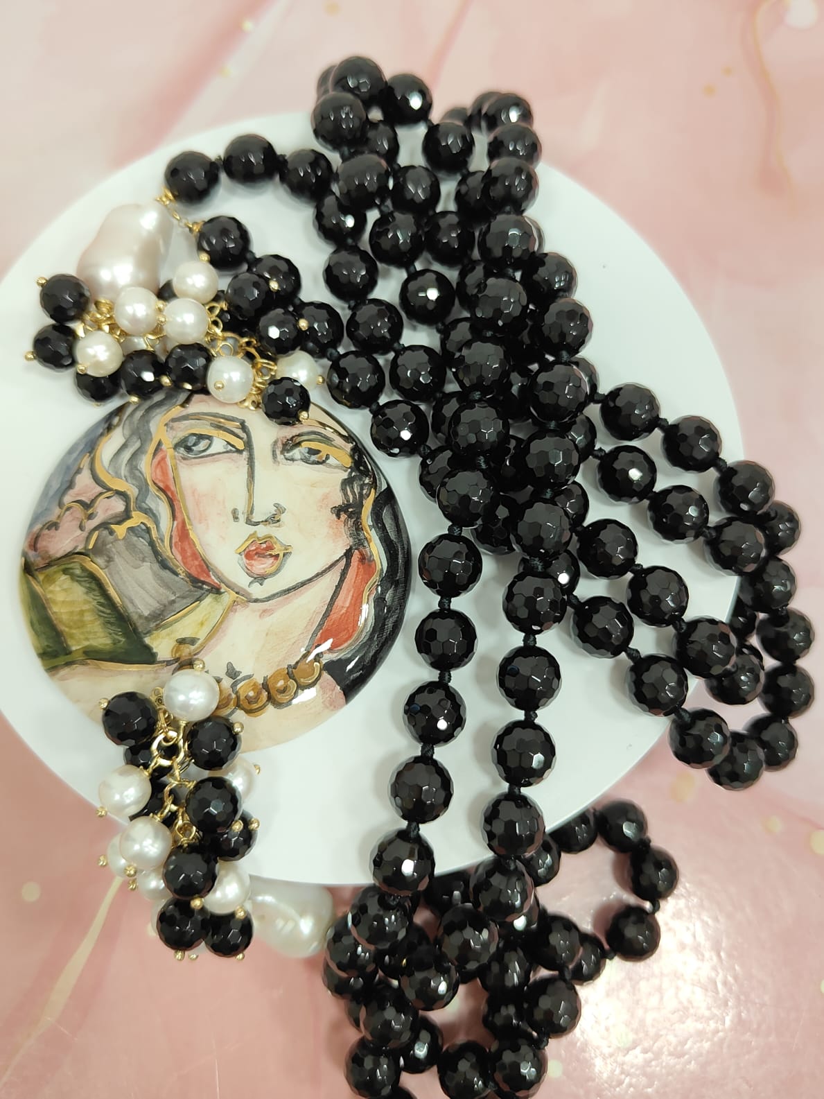 Materiali: onice nero naturale sfaccettato, ceramica dipinta a mano, perle barocche