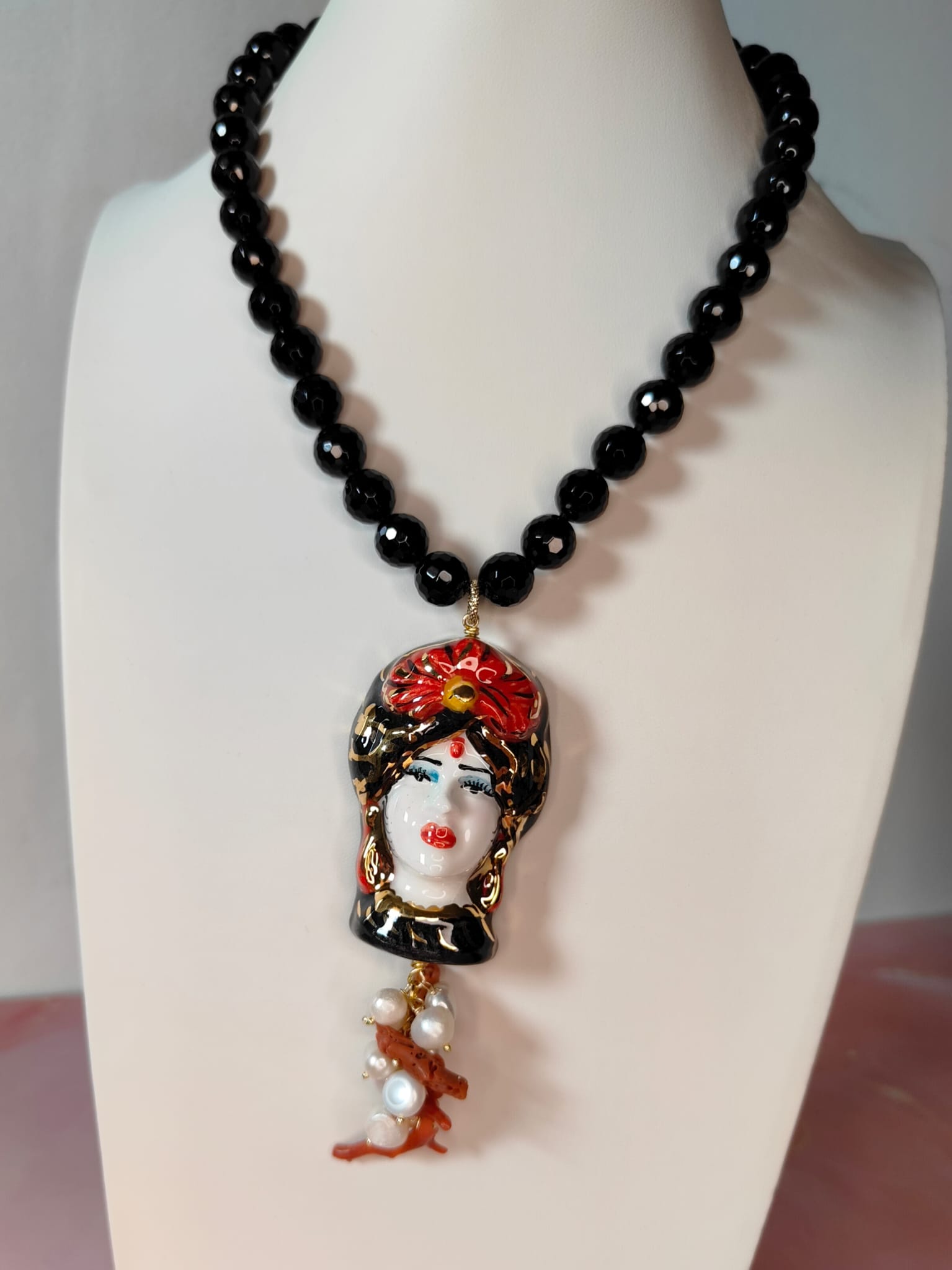 La collana onice nero e moro è pensata per donne che amano distinguersi con stile, indossando un gioiello simbolico e contemporaneo al tempo stesso. Perfetta per serate eleganti o per valorizzare un look semplice, è un tributo all’arte e alla cultura siciliana.