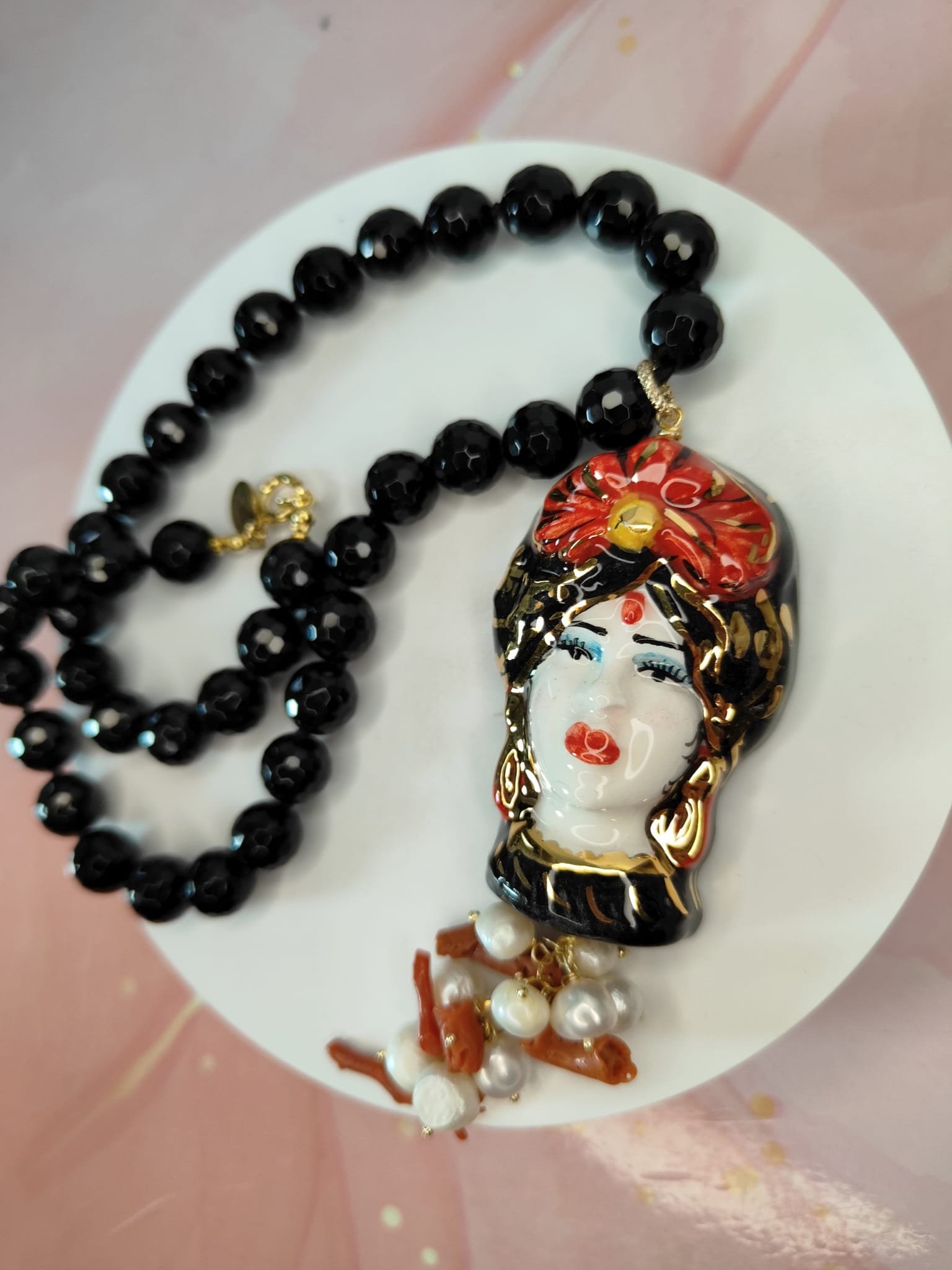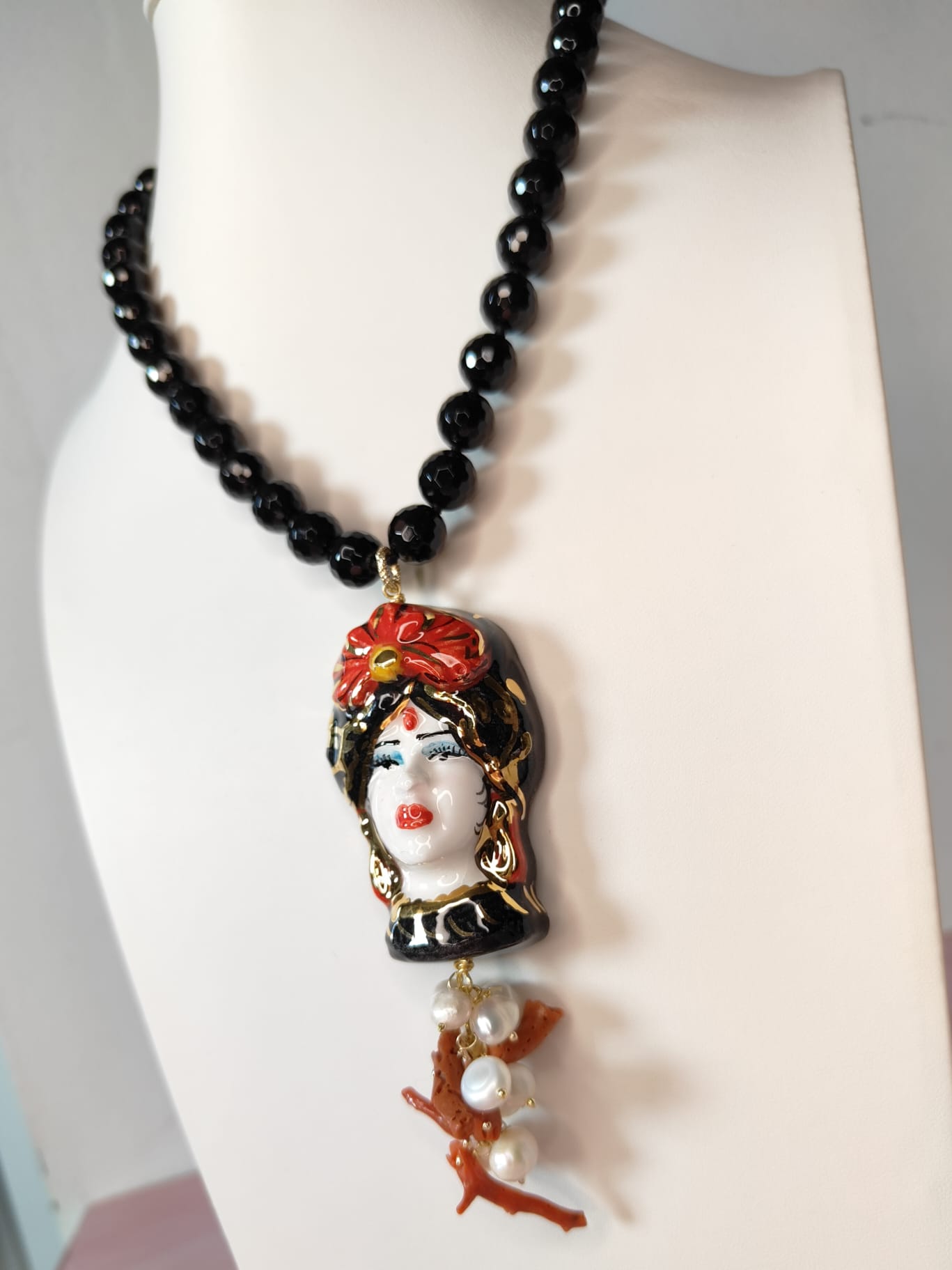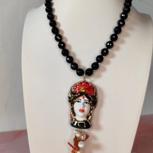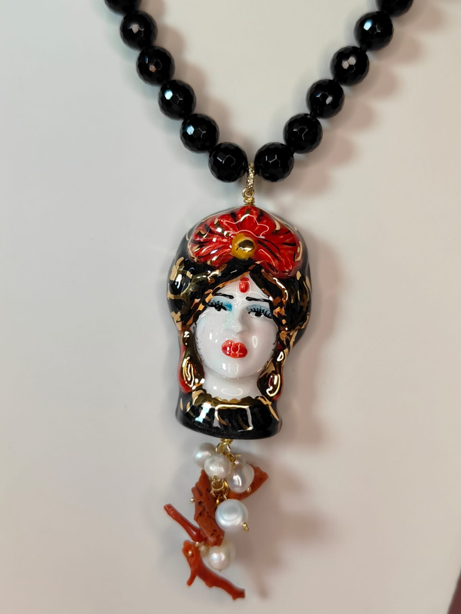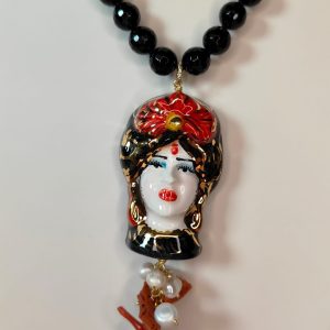Il pendente raffigura una testa di moro in ceramica di Caltagirone, interamente modellata e dipinta a mano. I dettagli dorati, le labbra rosse e il turbante in vivaci toni mediterranei rendono il volto espressivo e unico. Alla base del ciondolo, un affascinante grappolo di perle e corallo grezzo naturale aggiunge movimento e luminosità, richiamando i colori del mare e della terra di Sicilia.
