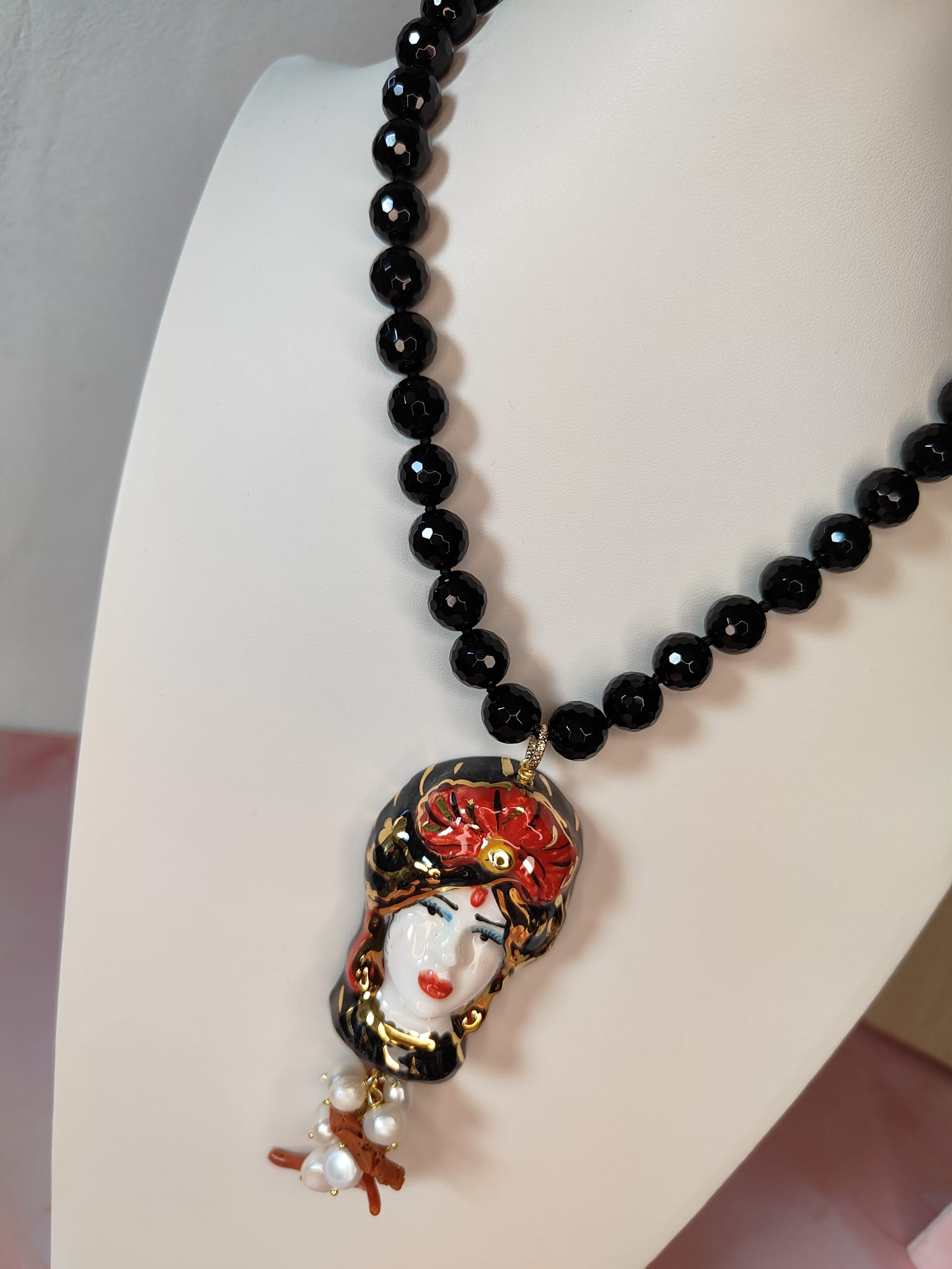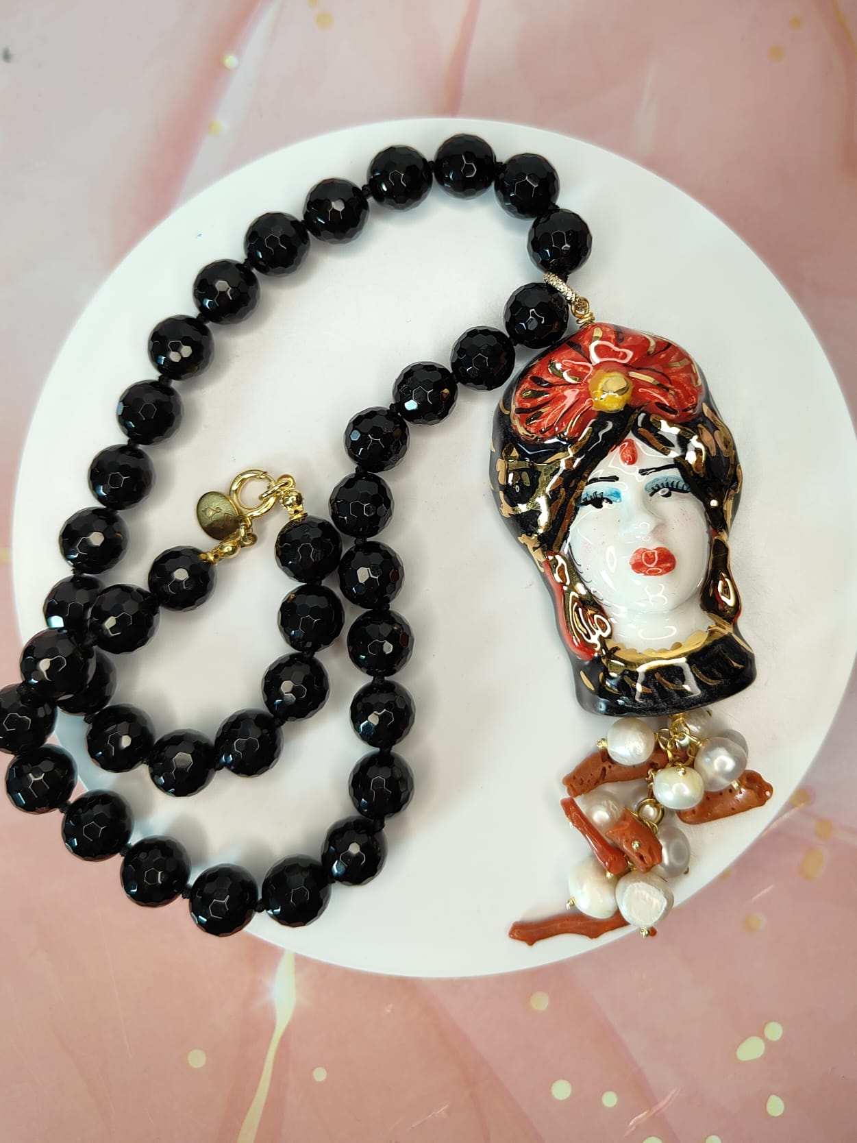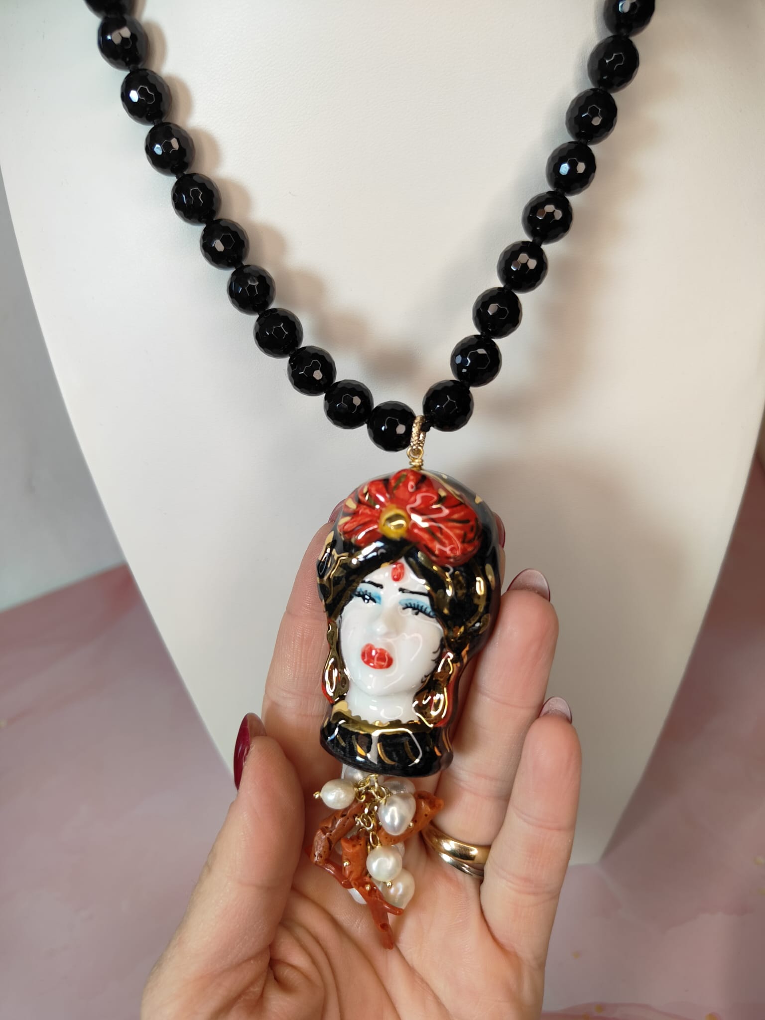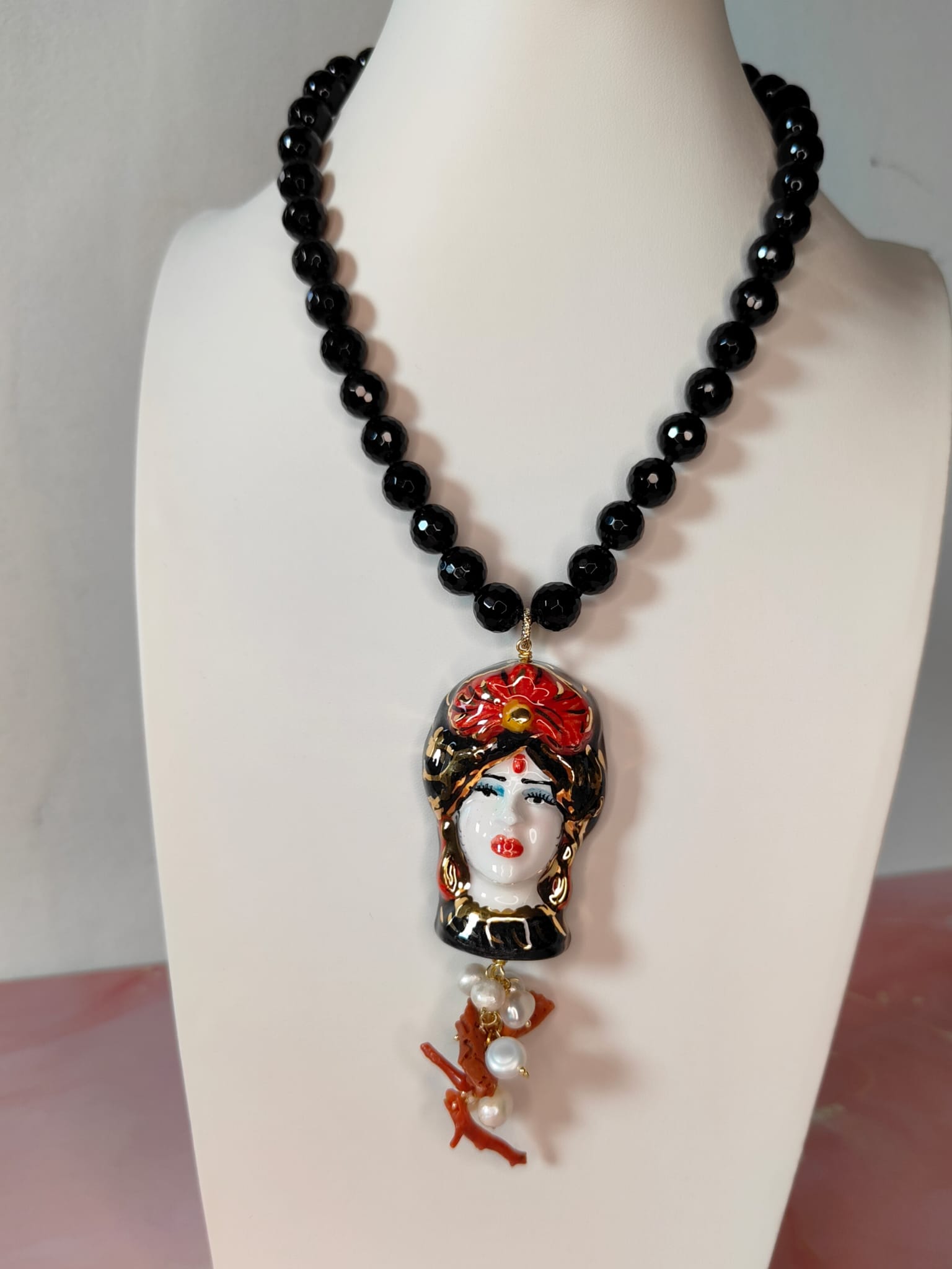 Il pendente raffigura una testa di moro in ceramica di Caltagirone, interamente modellata e dipinta a mano. I dettagli dorati, le labbra rosse e il turbante in vivaci toni mediterranei rendono il volto espressivo e unico. Alla base del ciondolo, un affascinante grappolo di perle e corallo grezzo naturale aggiunge movimento e luminosità, richiamando i colori del mare e della terra di Sicilia.