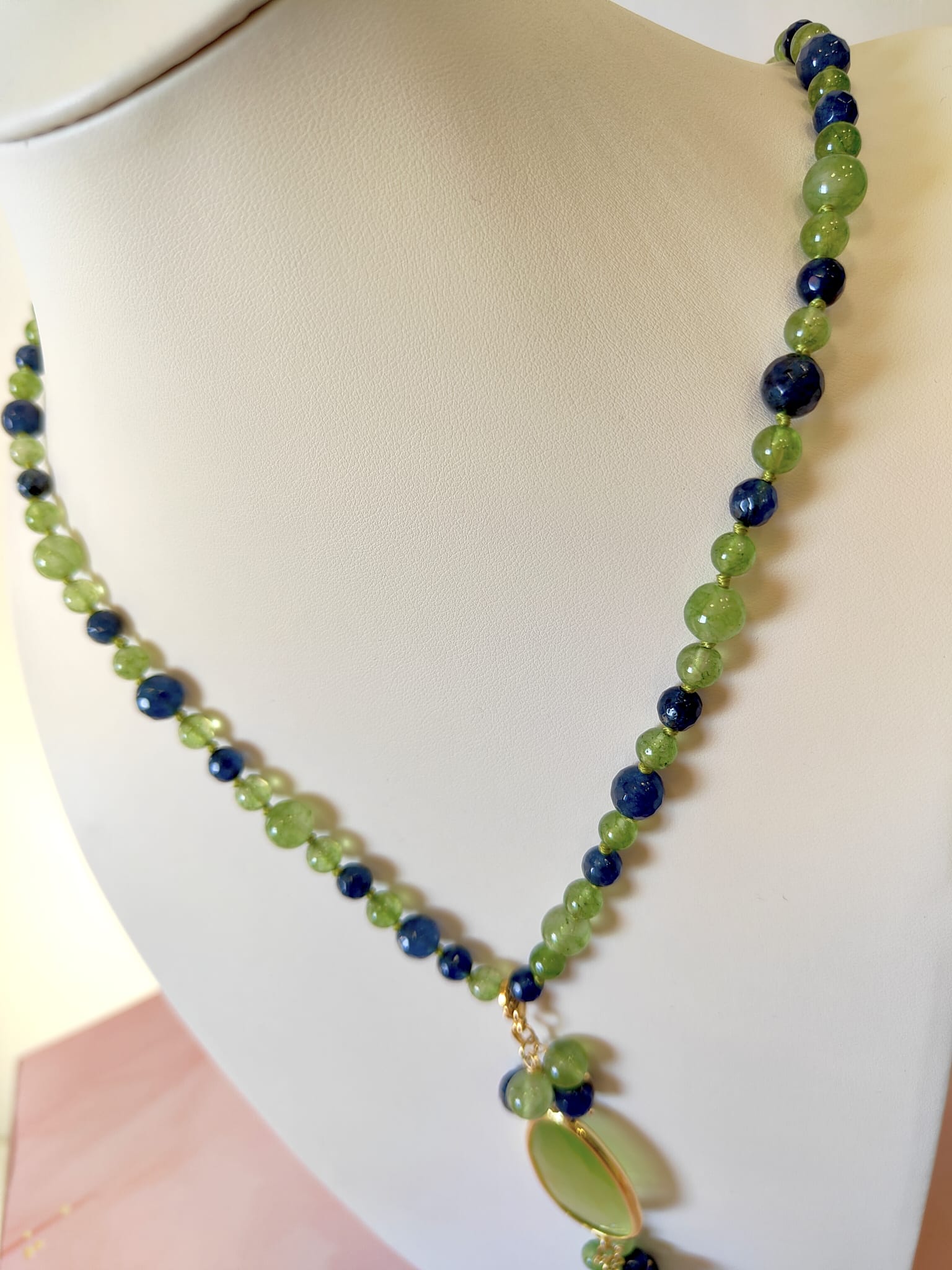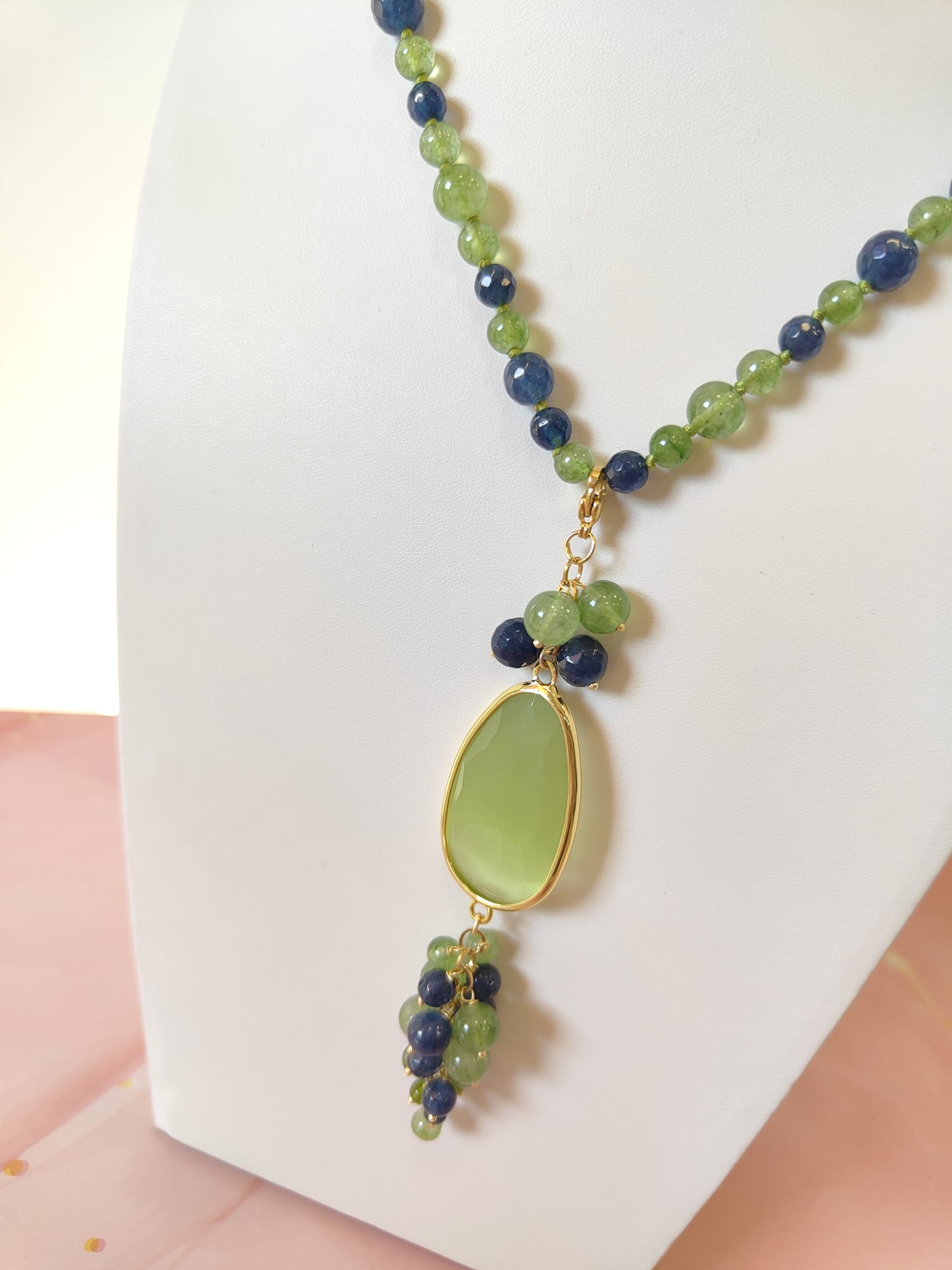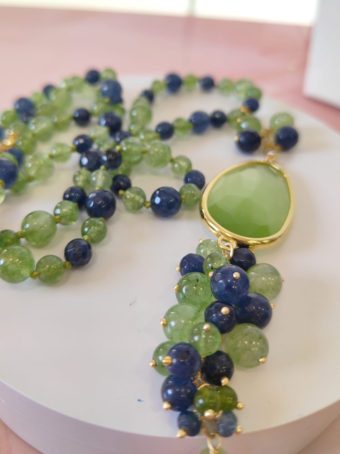 La collana peridoto agata è una creazione artigianale luminosa e raffinata, progettata per offrire non solo bellezza ma anche grande versatilità. Le sfere in peridoto naturale, dal verde fresco e brillante, si alternano alle sfere in agata blu leggermente trasparente, creando un equilibrio cromatico elegante e armonioso. Il risultato è un gioiello che illumina il décolleté con discrezione, adattandosi facilmente a stili e occasioni diverse.