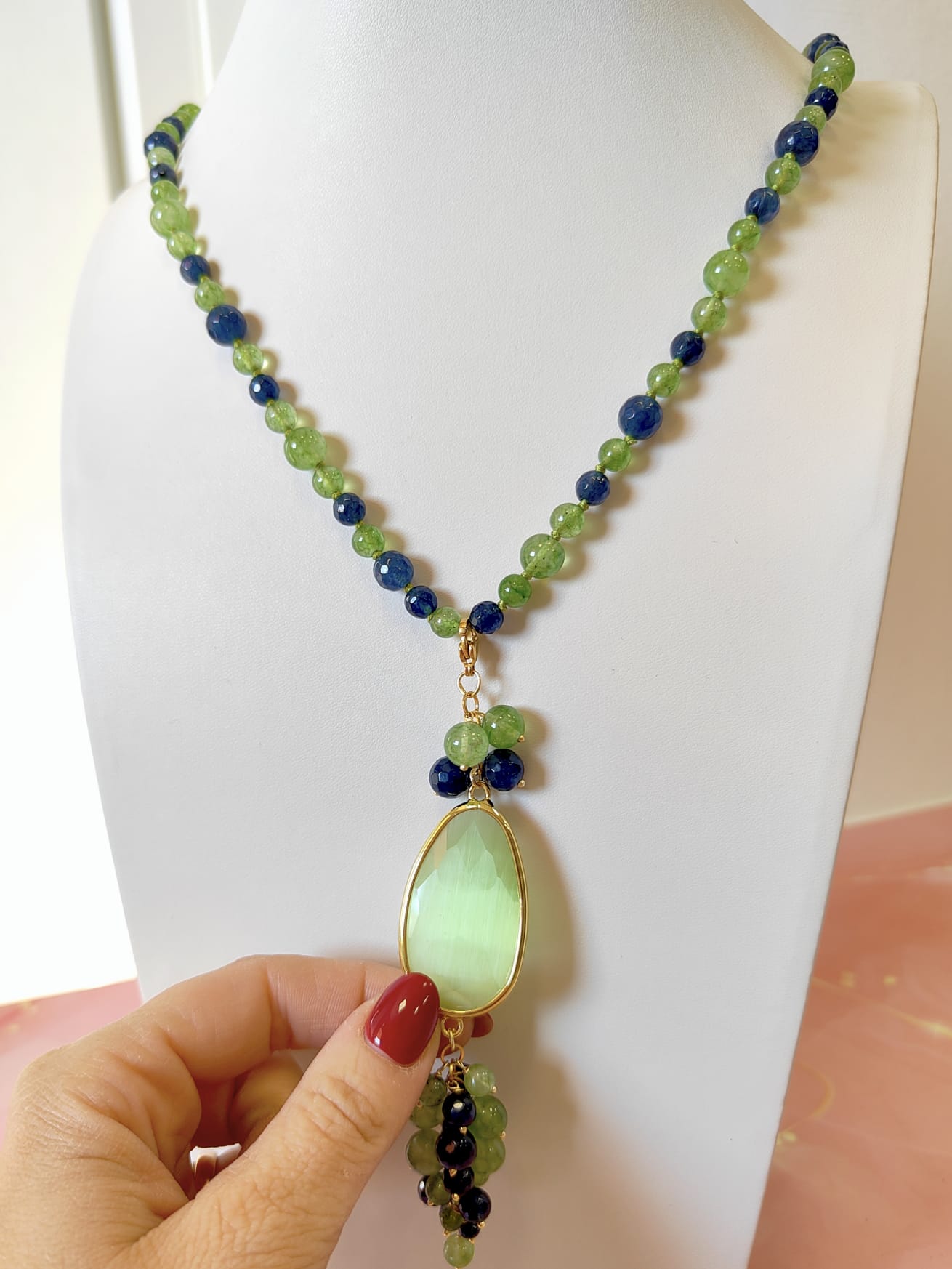 Elemento centrale della composizione è il lungo ciondolo in occhio di gatto, caratterizzato dal tipico effetto setoso che cattura la luce e dona movimento. La sua presenza valorizza l’intera collana, trasformandola in un accessorio di forte personalità ma sempre equilibrato.