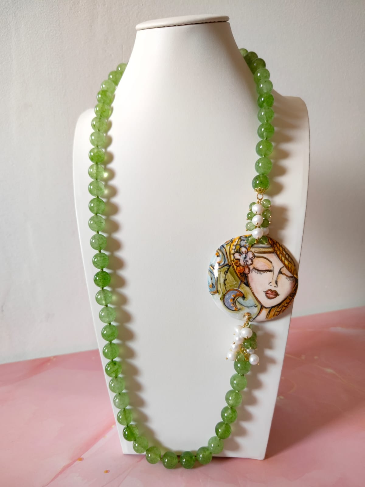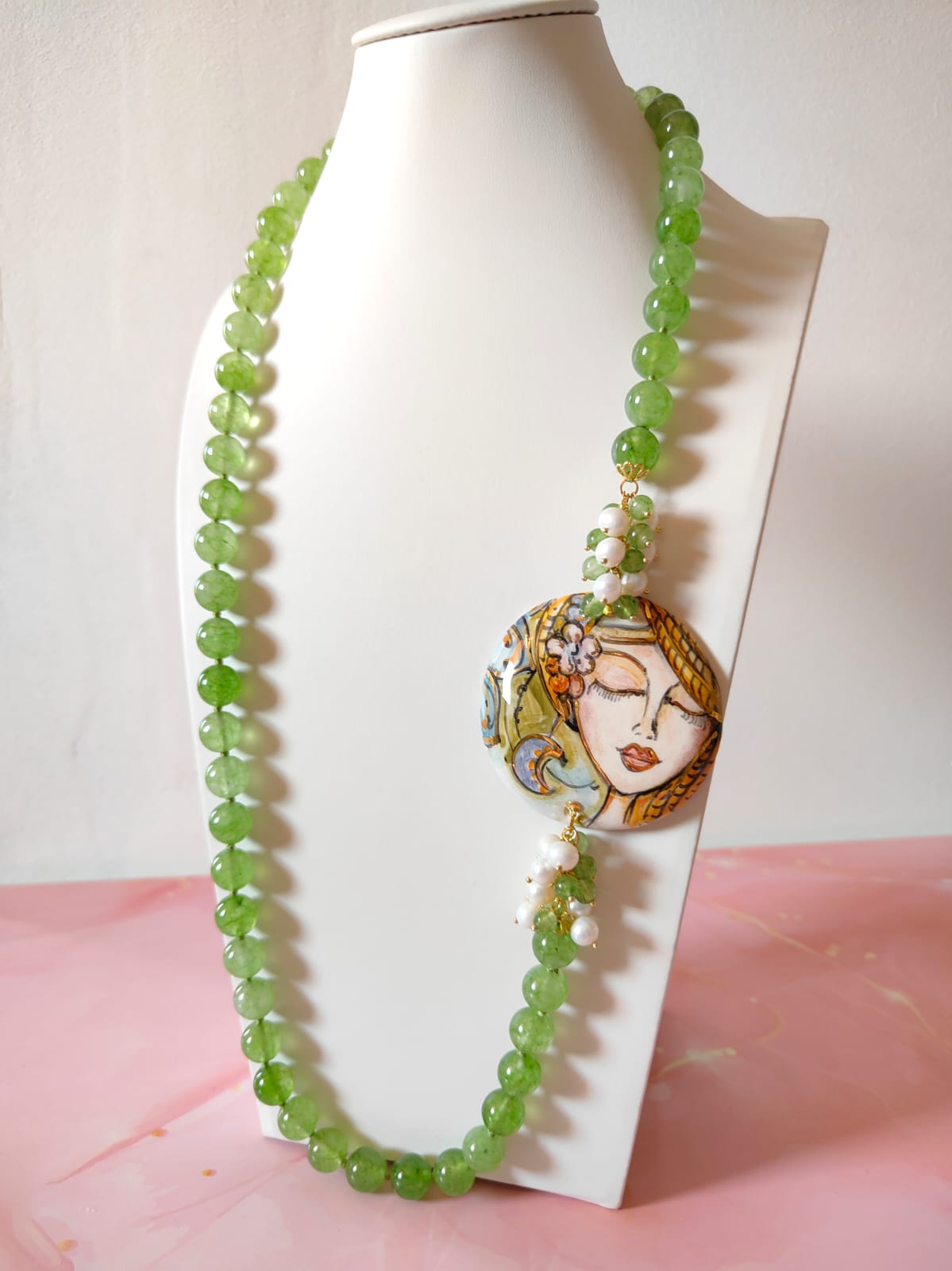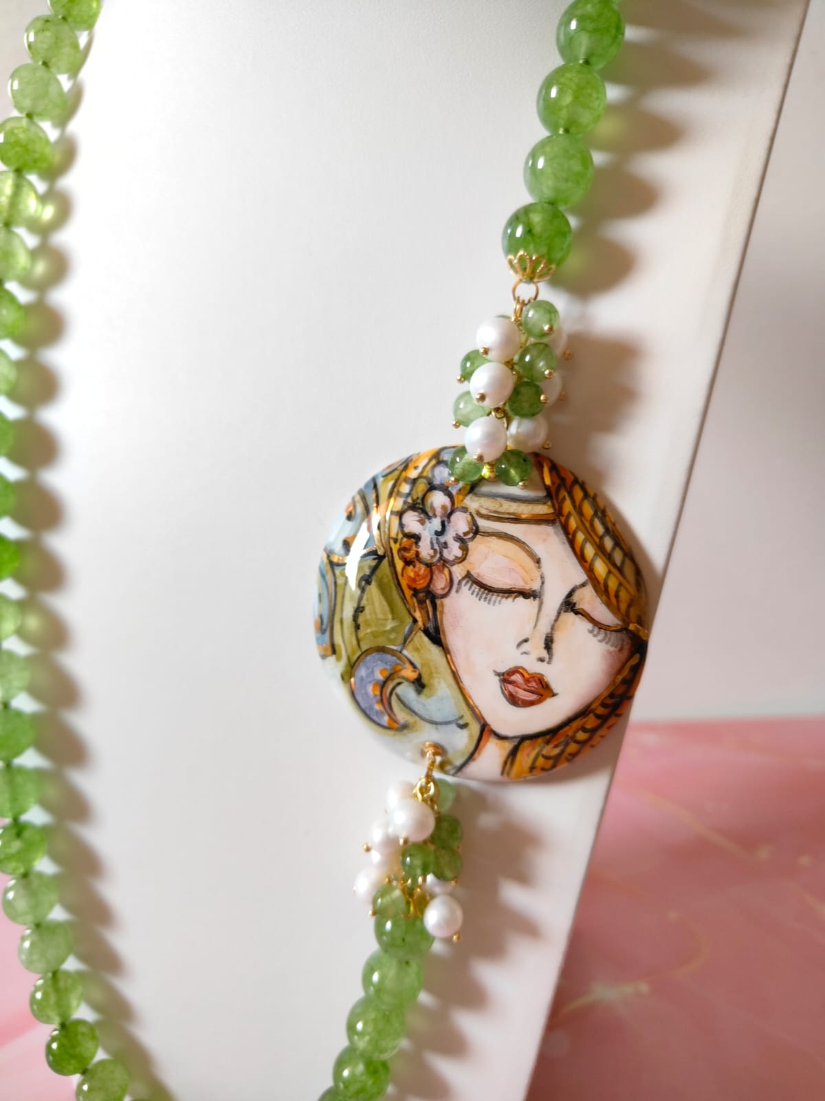 Il punto focale è il grande ciondolo in ceramica di Caltagirone, finemente dipinto a mano: un volto delicato, poetico, femminile. Ogni pennellata racconta un frammento di Sicilia: le sue tradizioni, il suo calore, la sua bellezza antica. Da questo elemento centrale scendono grappoli composti da piccole perle d’acqua dolce e ulteriori pietre di peridoto, che aggiungono movimento, tridimensionalità e brillantezza.
