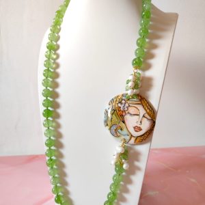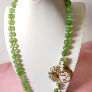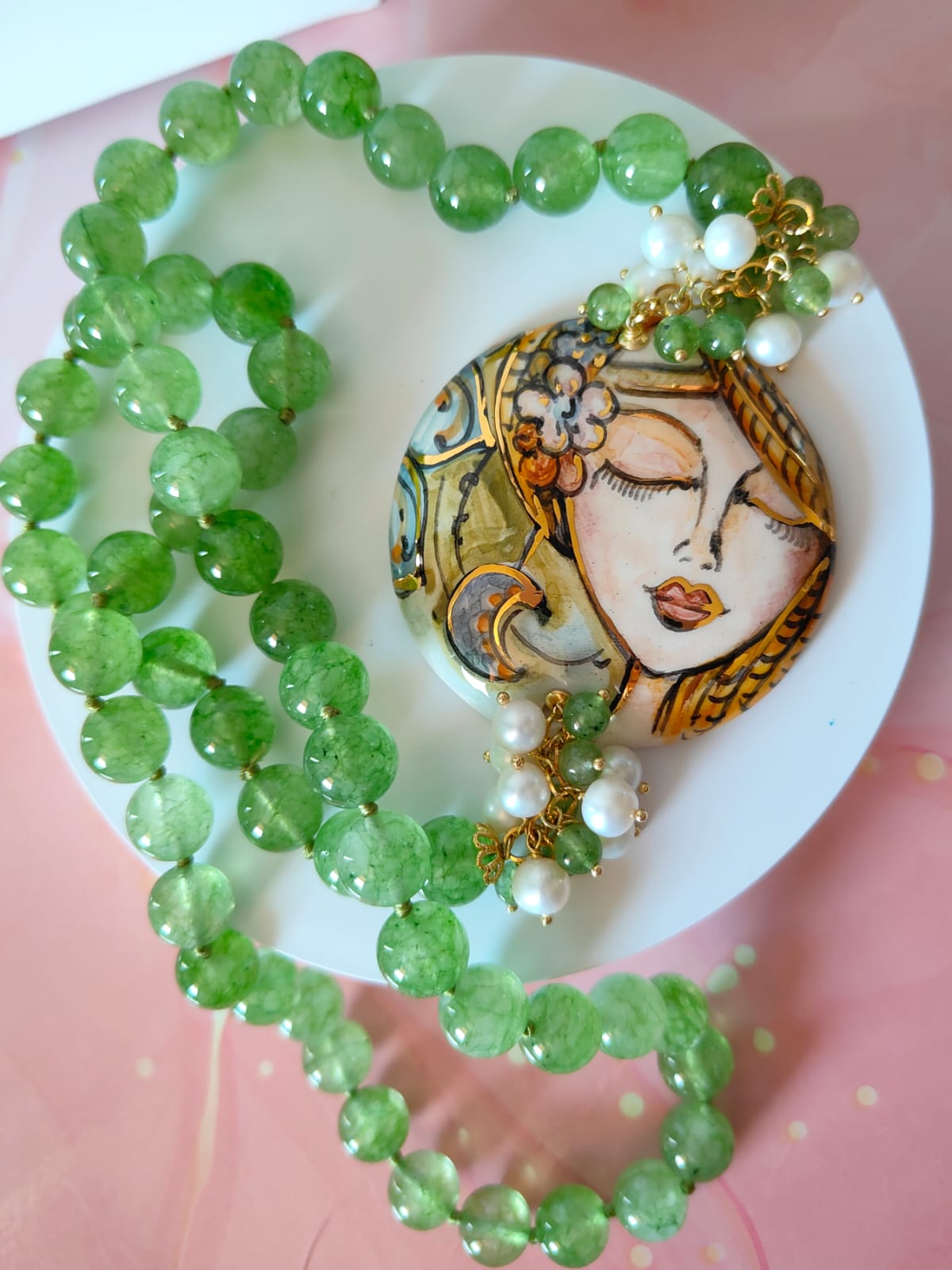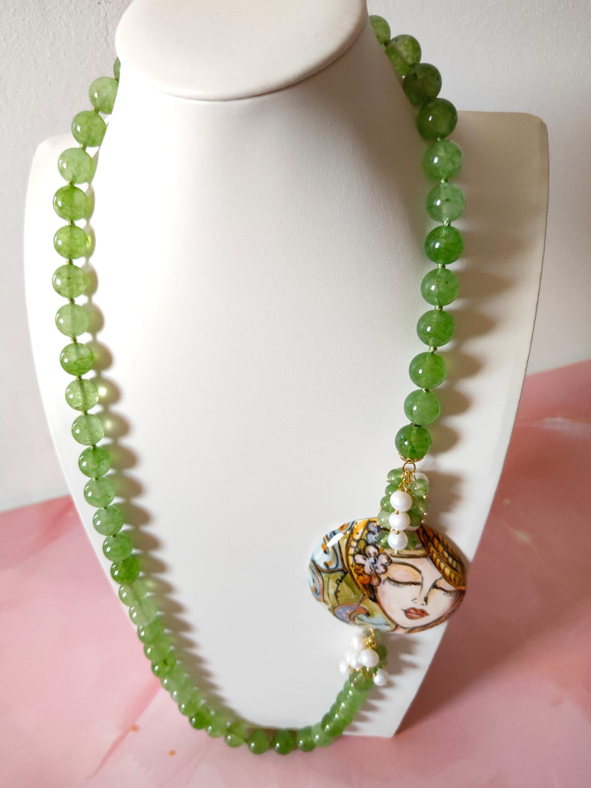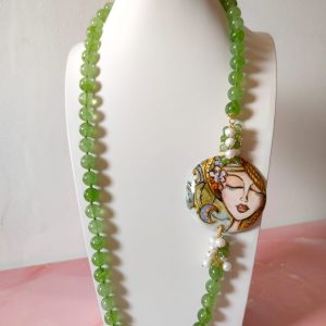 Il punto focale è il grande ciondolo in ceramica di Caltagirone, finemente dipinto a mano: un volto delicato, poetico, femminile. Ogni pennellata racconta un frammento di Sicilia: le sue tradizioni, il suo calore, la sua bellezza antica. Da questo elemento centrale scendono grappoli composti da piccole perle d’acqua dolce e ulteriori pietre di peridoto, che aggiungono movimento, tridimensionalità e brillantezza.