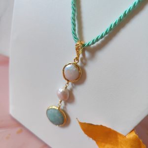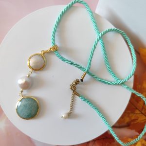 La collana perla e amazzonite con cordoncino verde acqua non è soltanto un accessorio, ma una piccola opera d’arte da indossare. Il contrasto tra i toni delicati della perla e la vivacità dell’amazzonite si fonde con il calore dell’incastonatura dorata, creando un gioiello che trasmette unicità e carattere.
