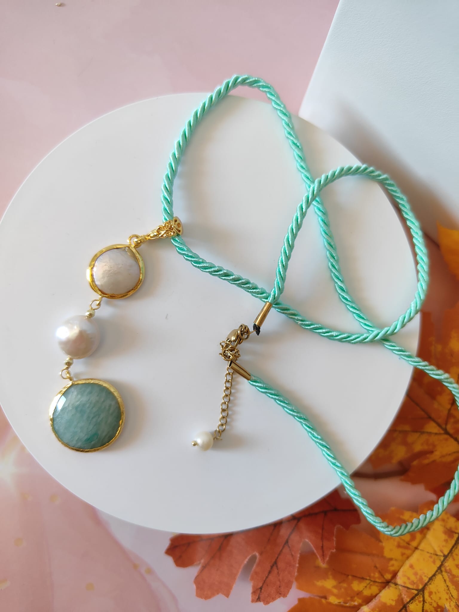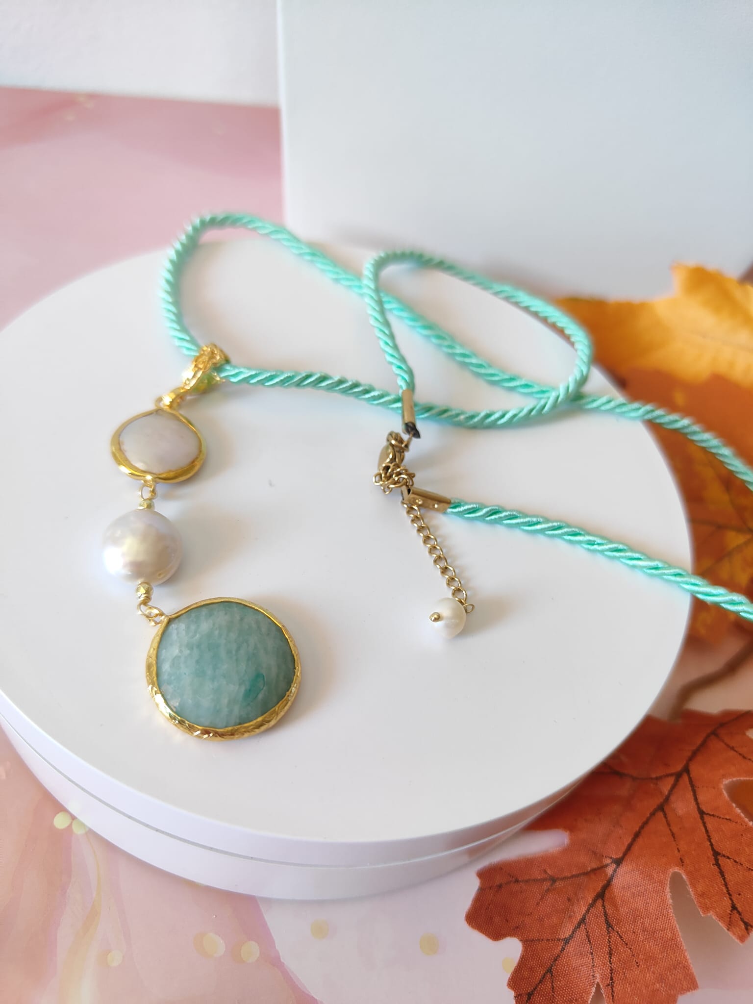 La collana perla e amazzonite con cordoncino verde acqua è un gioiello esclusivo e raffinato, pensato per chi desidera indossare un pezzo unico, realizzato interamente a mano. Ogni dettaglio racconta la bellezza dei materiali naturali e la cura della tradizione artigianale, trasformando questo accessorio in un simbolo di stile personale.