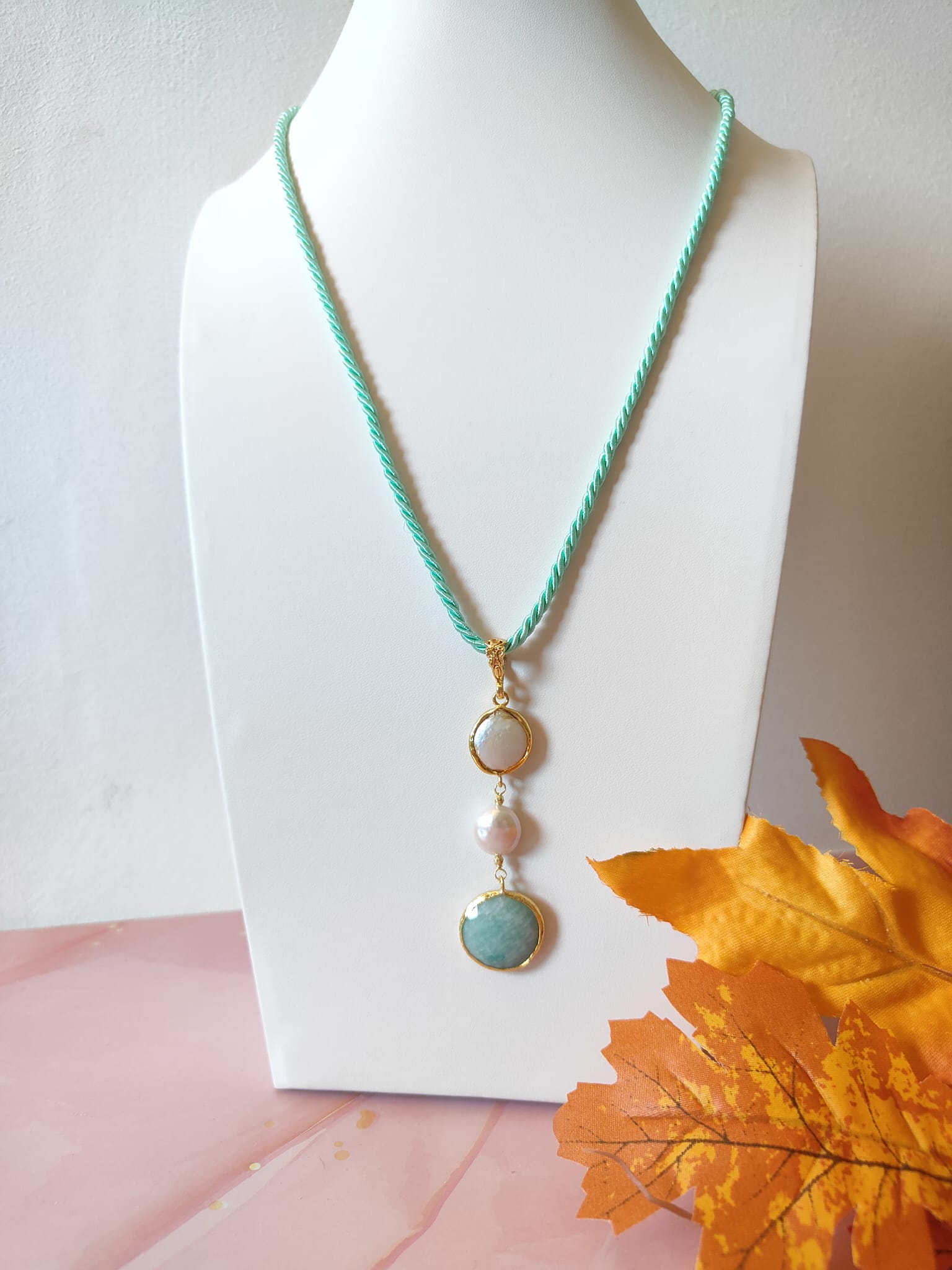 Materiali: cordoncino verde acqua, perla naturale, amazzonite, acciaio dorato