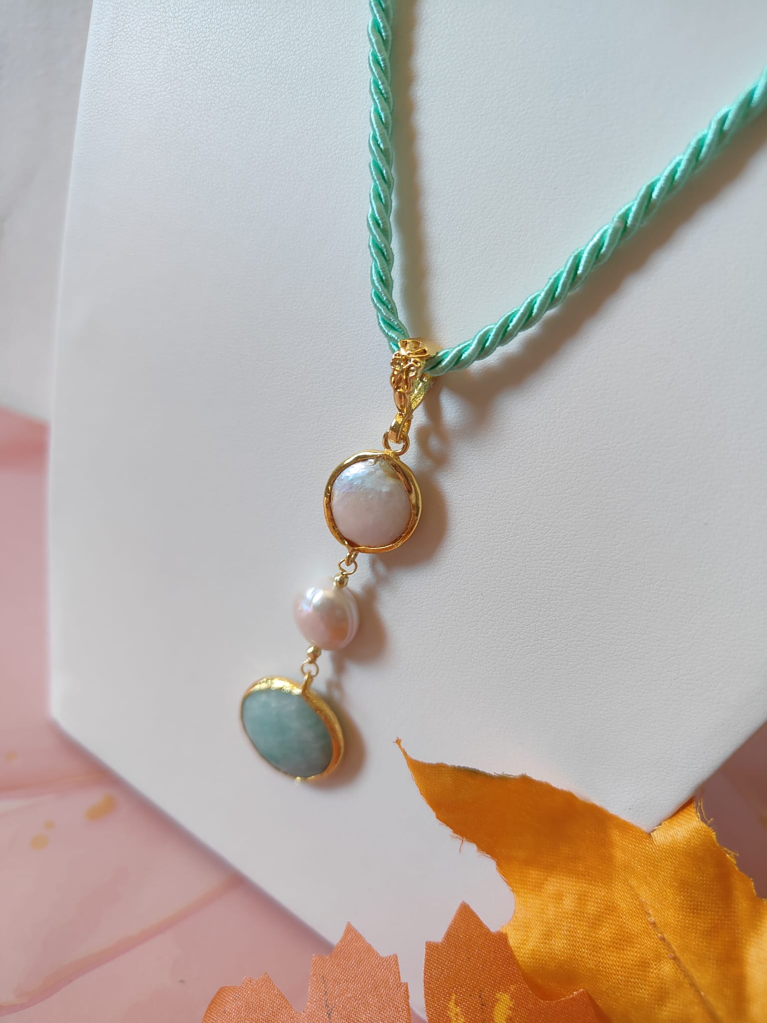 Il pendente, vero protagonista, è composto da tre elementi armoniosi: una gemma chiara incastonata in finitura dorata, una perla naturale dal fascino senza tempo e un disco di amazzonite, pietra dalle intense sfumature verde-azzurre, che simboleggia calma e armonia interiore. L’abbinamento tra perla e pietra naturale crea un equilibrio sofisticato, rendendo questa collana perfetta sia per le occasioni importanti che per dare luce agli outfit quotidiani.