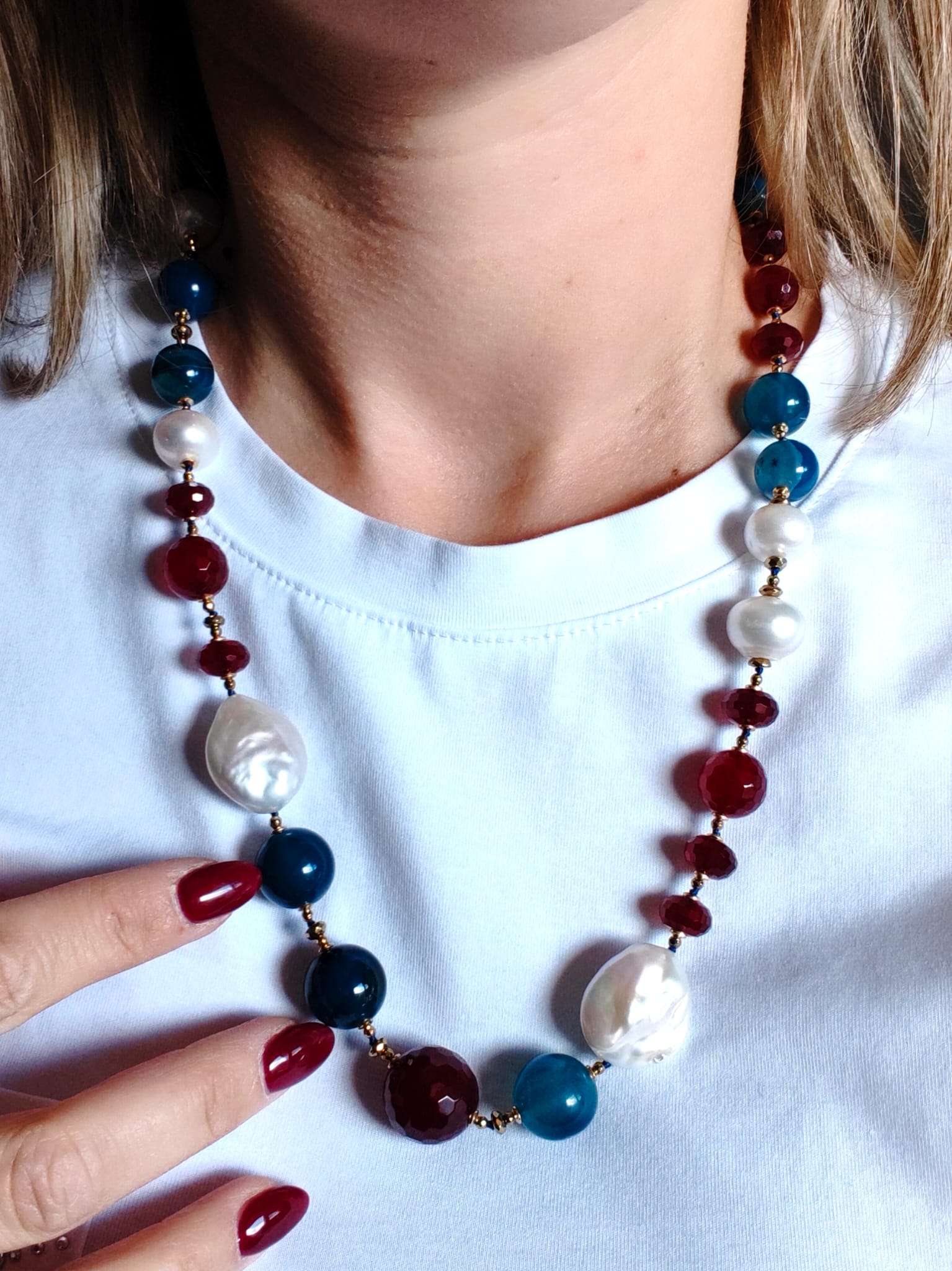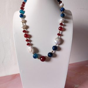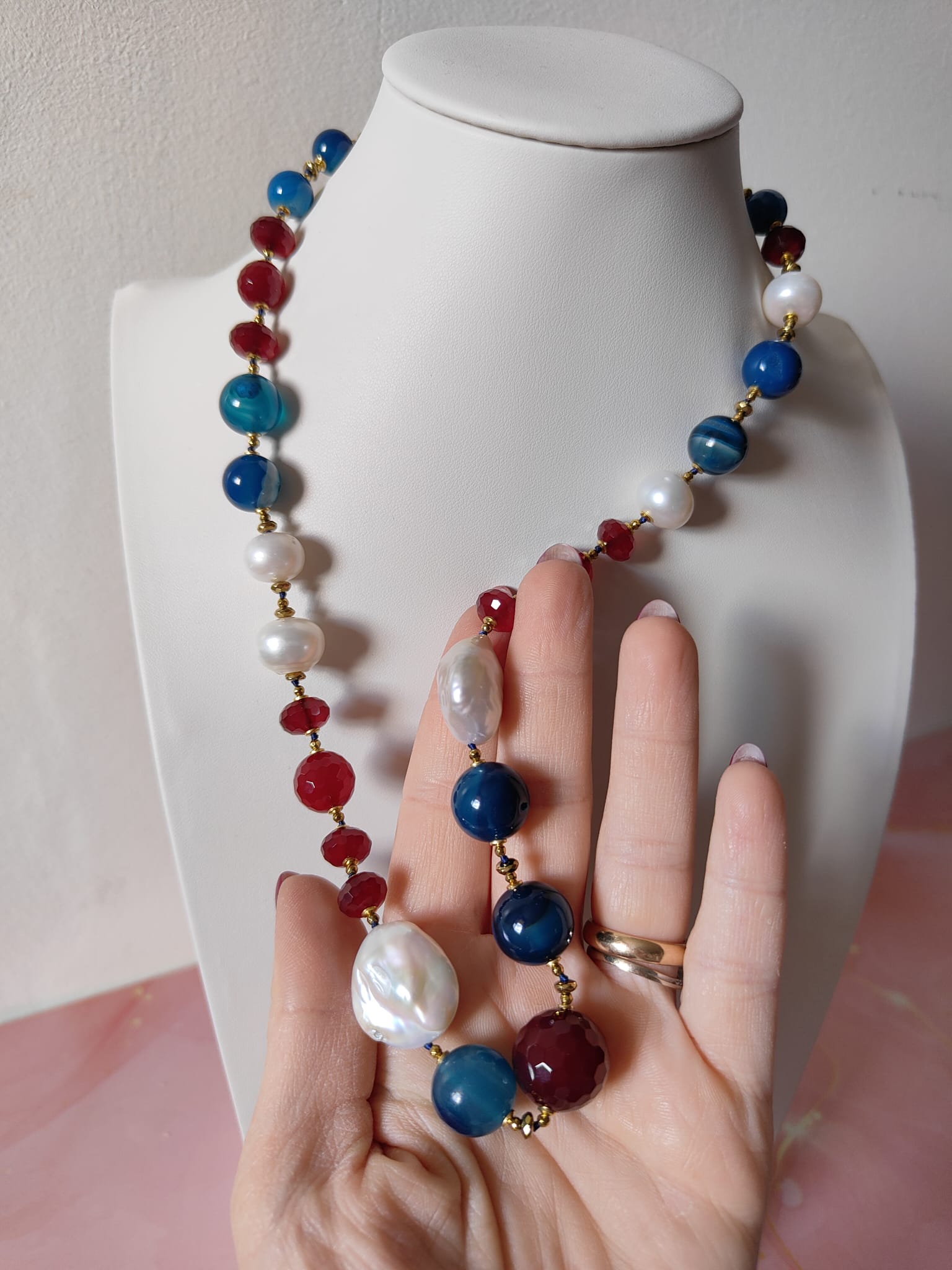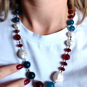 La collana perle agata blu è una creazione che unisce eleganza e armonia cromatica in un gioiello dallo stile unico. Ogni pietra è scelta con cura per valorizzare il contrasto tra le delicate sfumature delle perle naturali e i toni intensi dell’agata, nelle sue versioni borgogna e blu profondo.