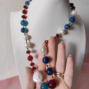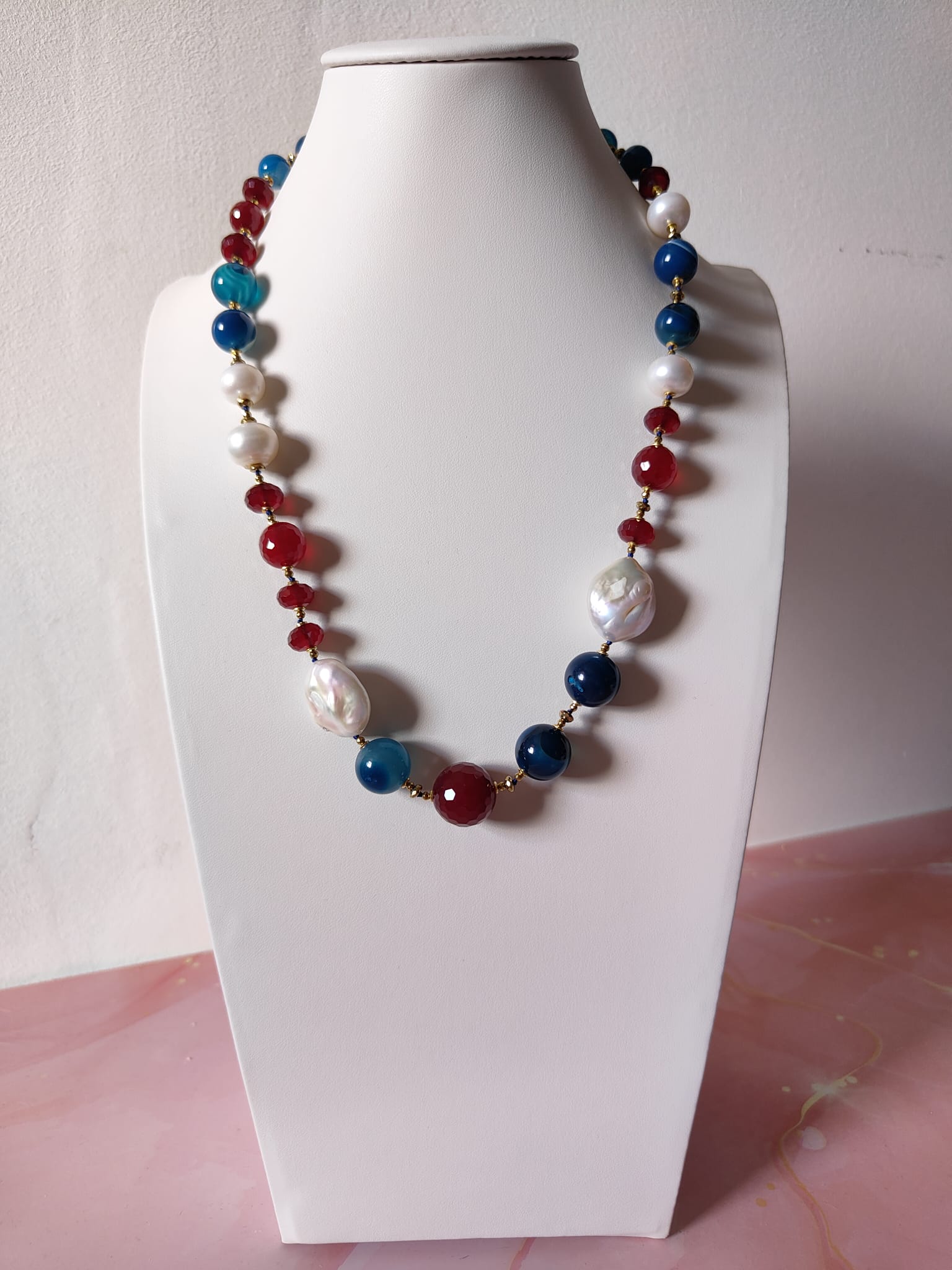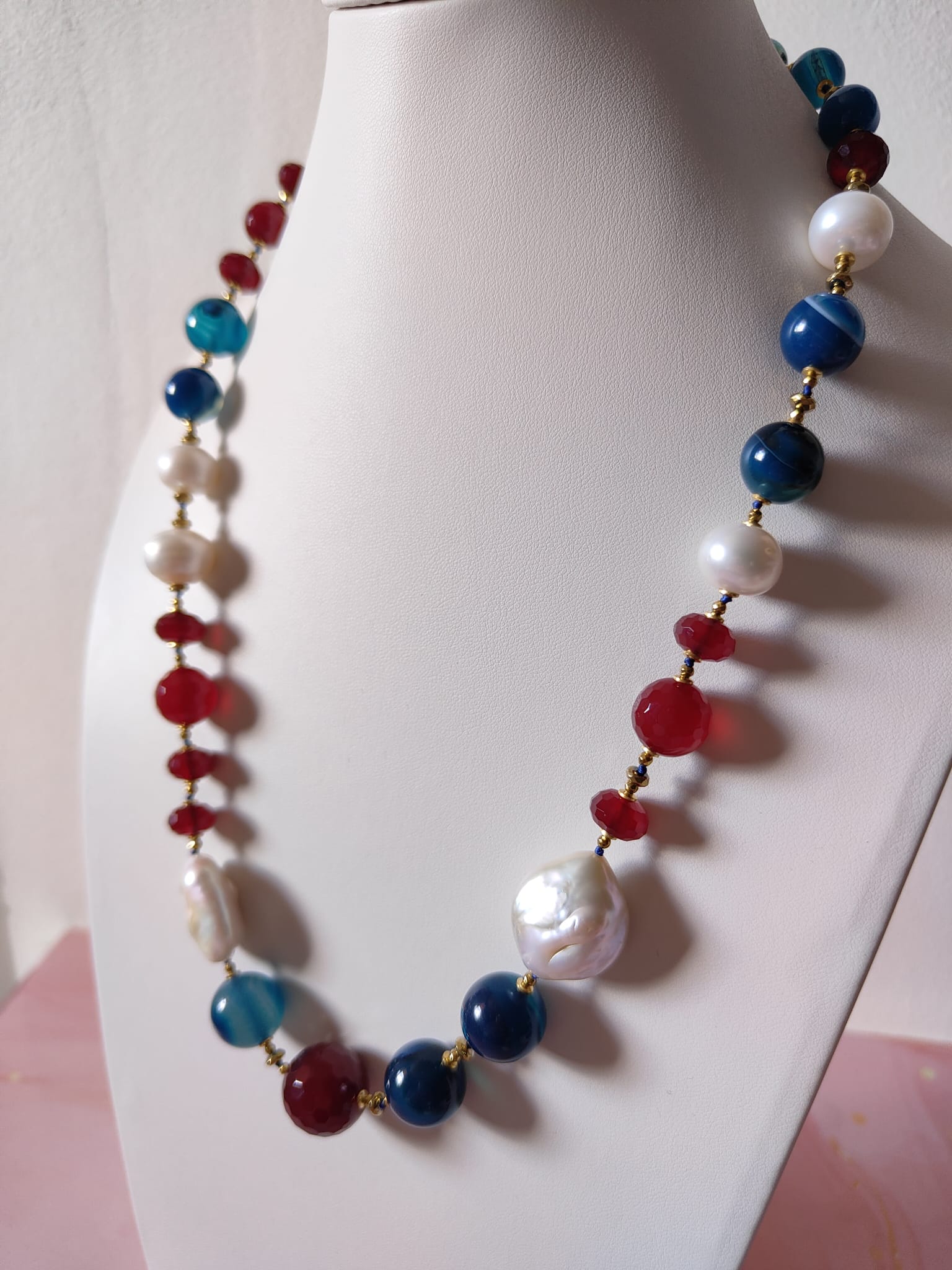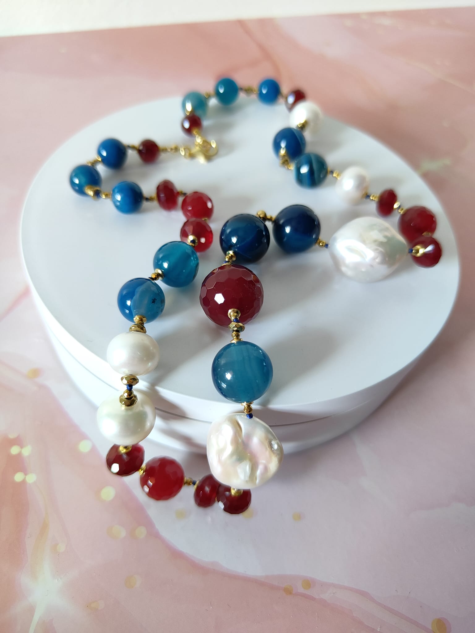 La collana perle agata blu è una creazione che unisce eleganza e armonia cromatica in un gioiello dallo stile unico. Ogni pietra è scelta con cura per valorizzare il contrasto tra le delicate sfumature delle perle naturali e i toni intensi dell’agata, nelle sue versioni borgogna e blu profondo.
