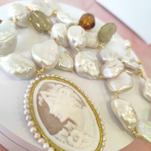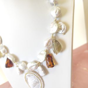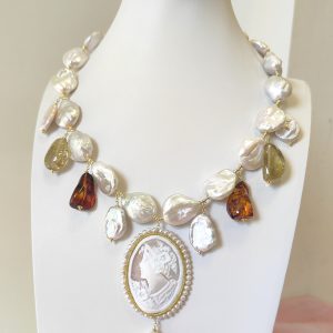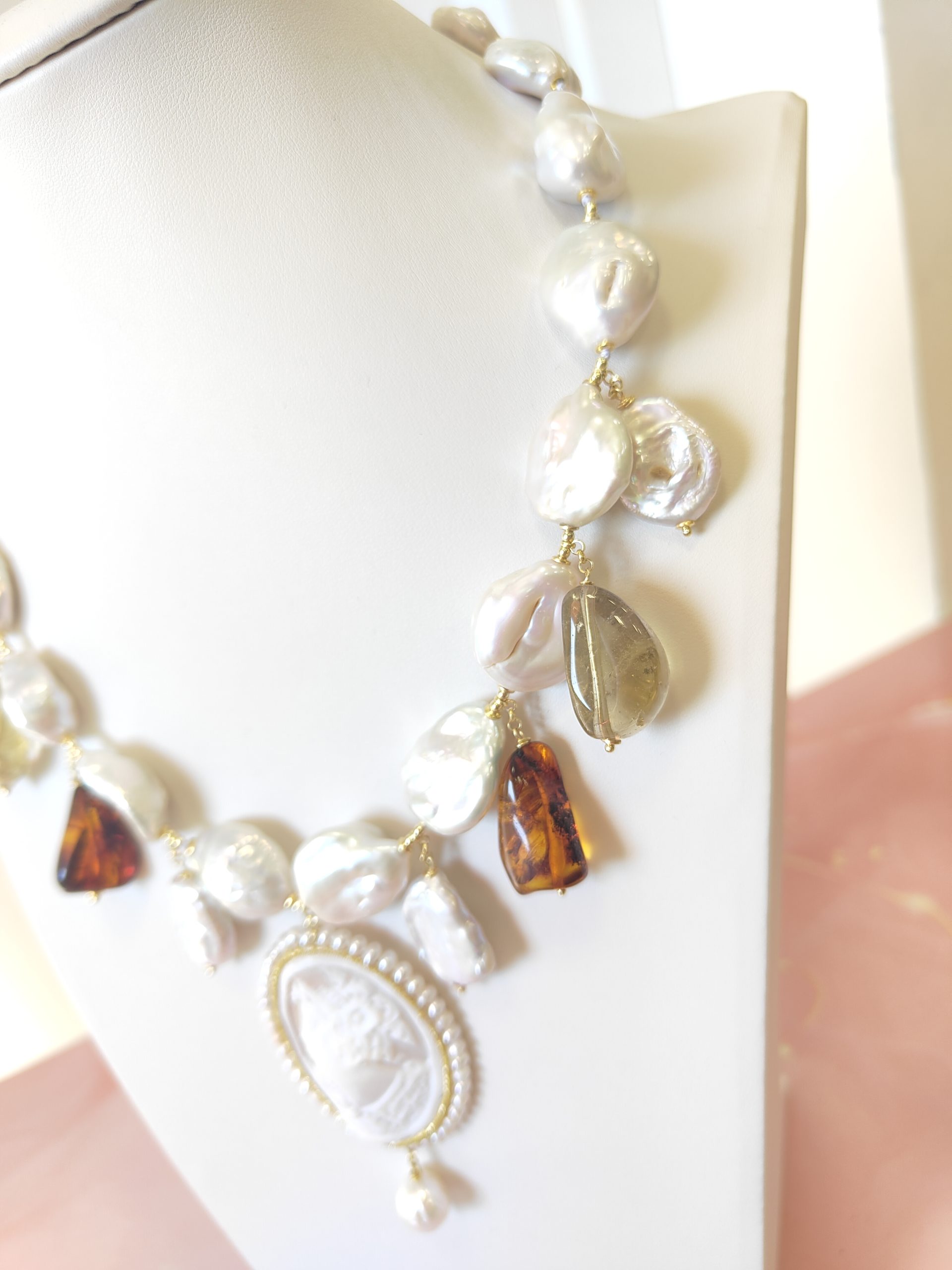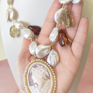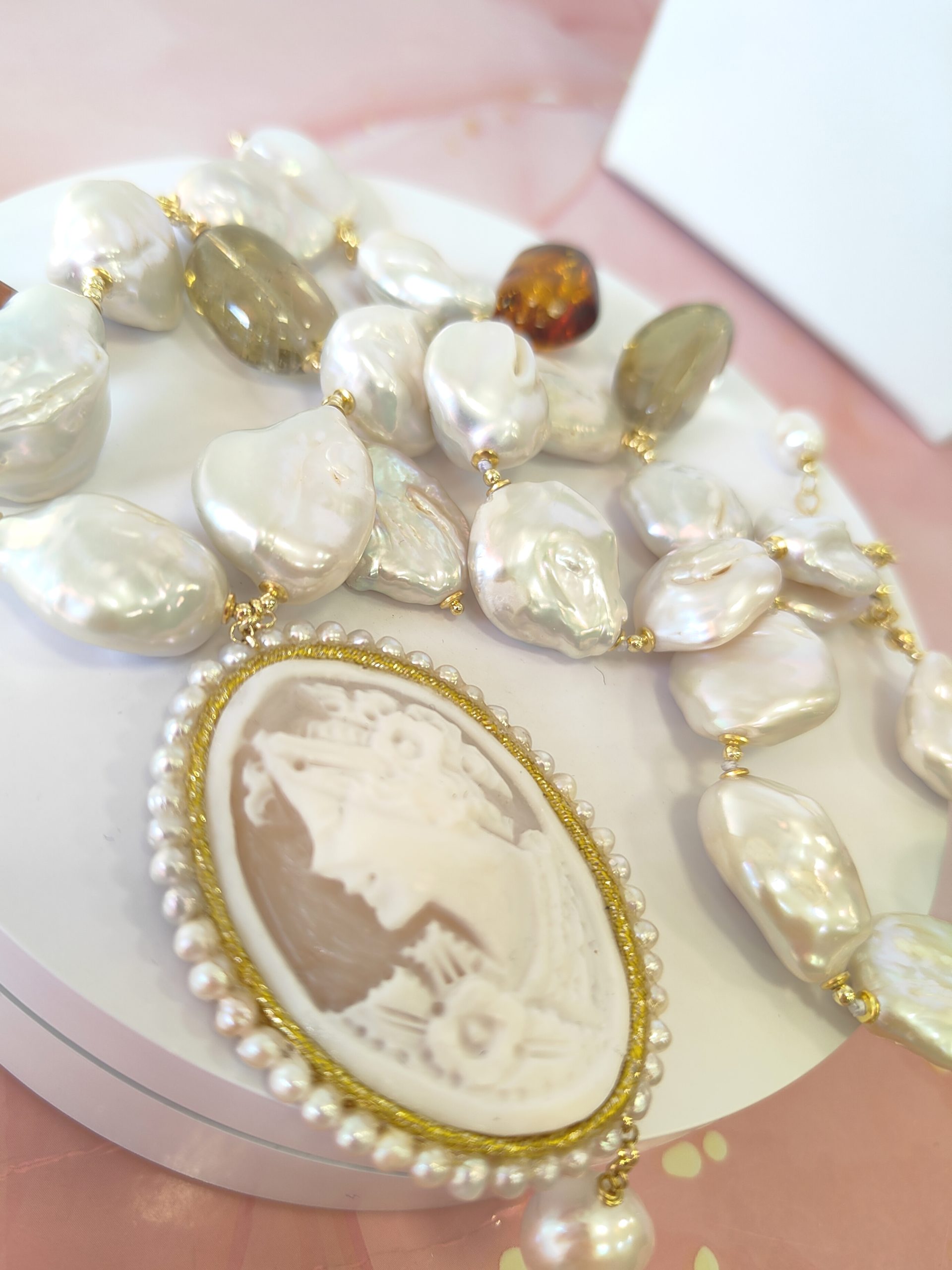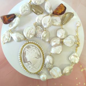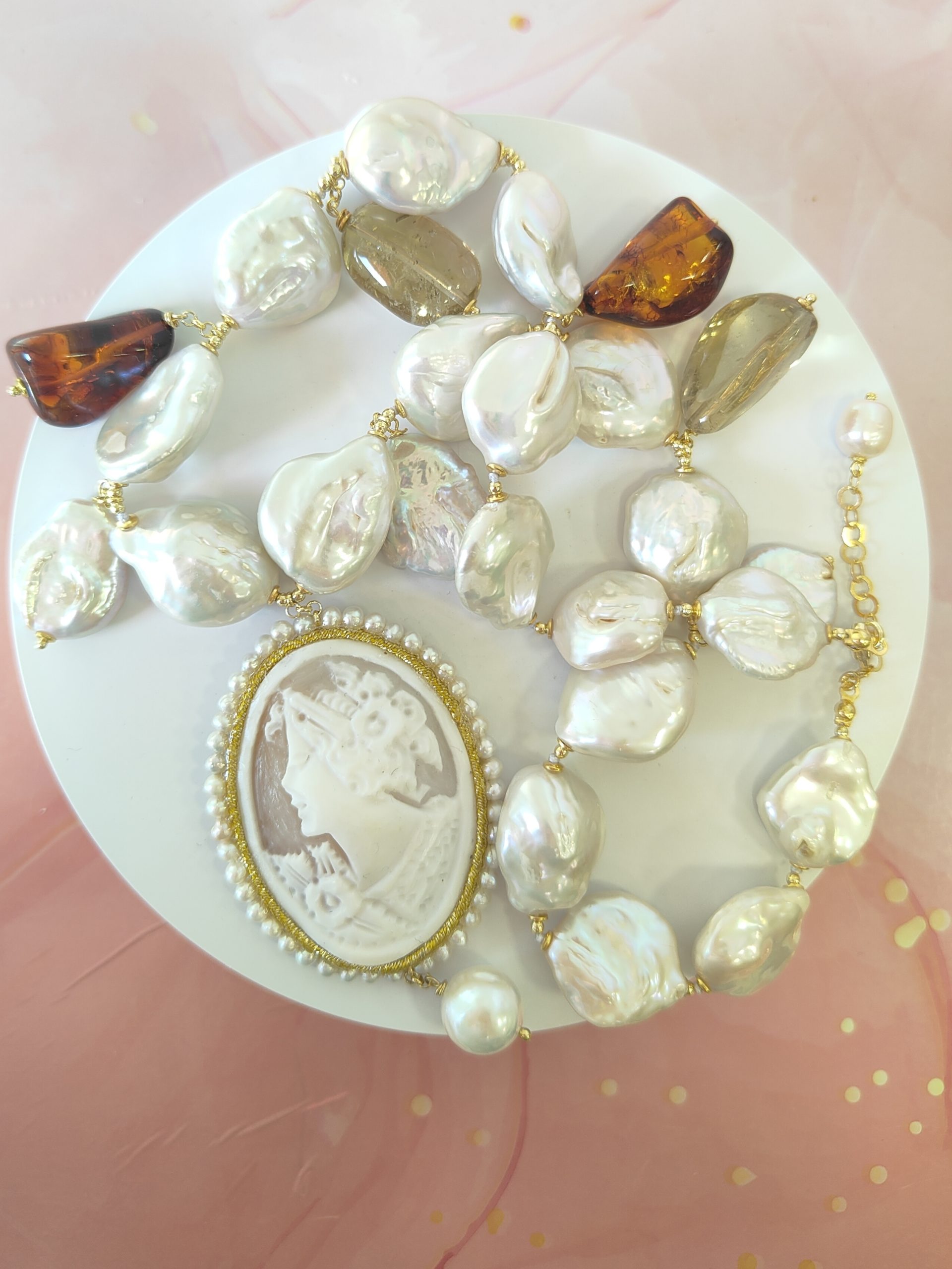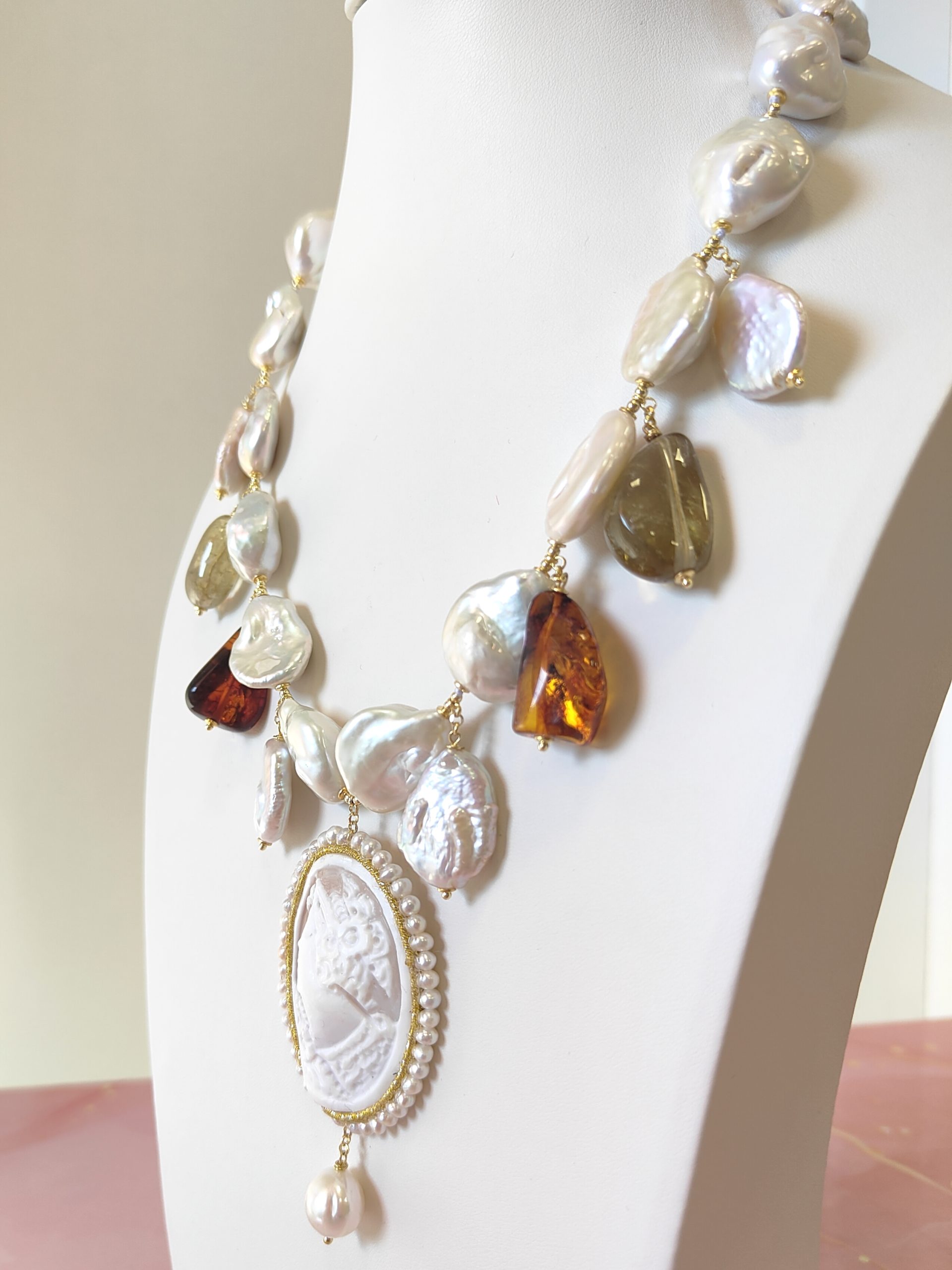 Materiali: perle naturali barocche, ambra baltica naturale, quarzo fumé naturale, cammeo inciso, argento 925 placcato oro