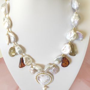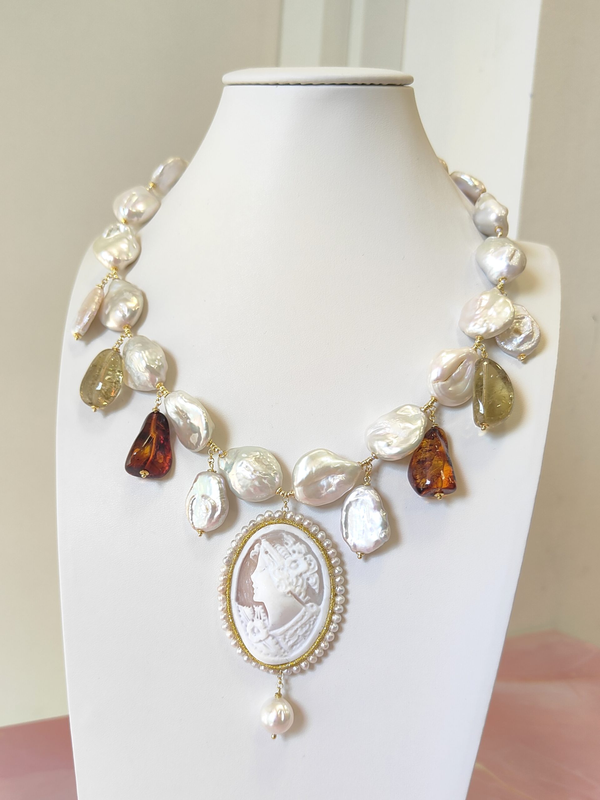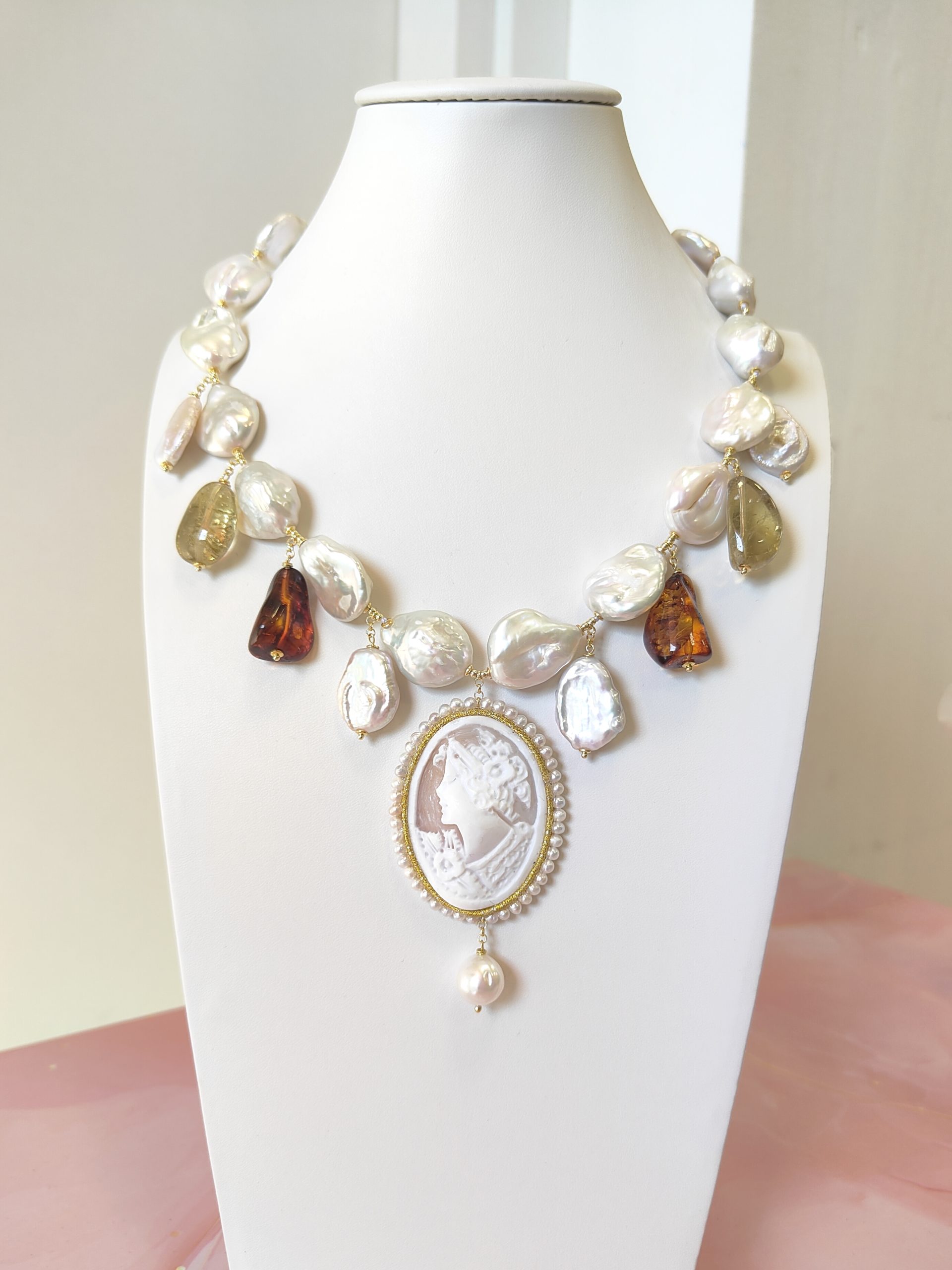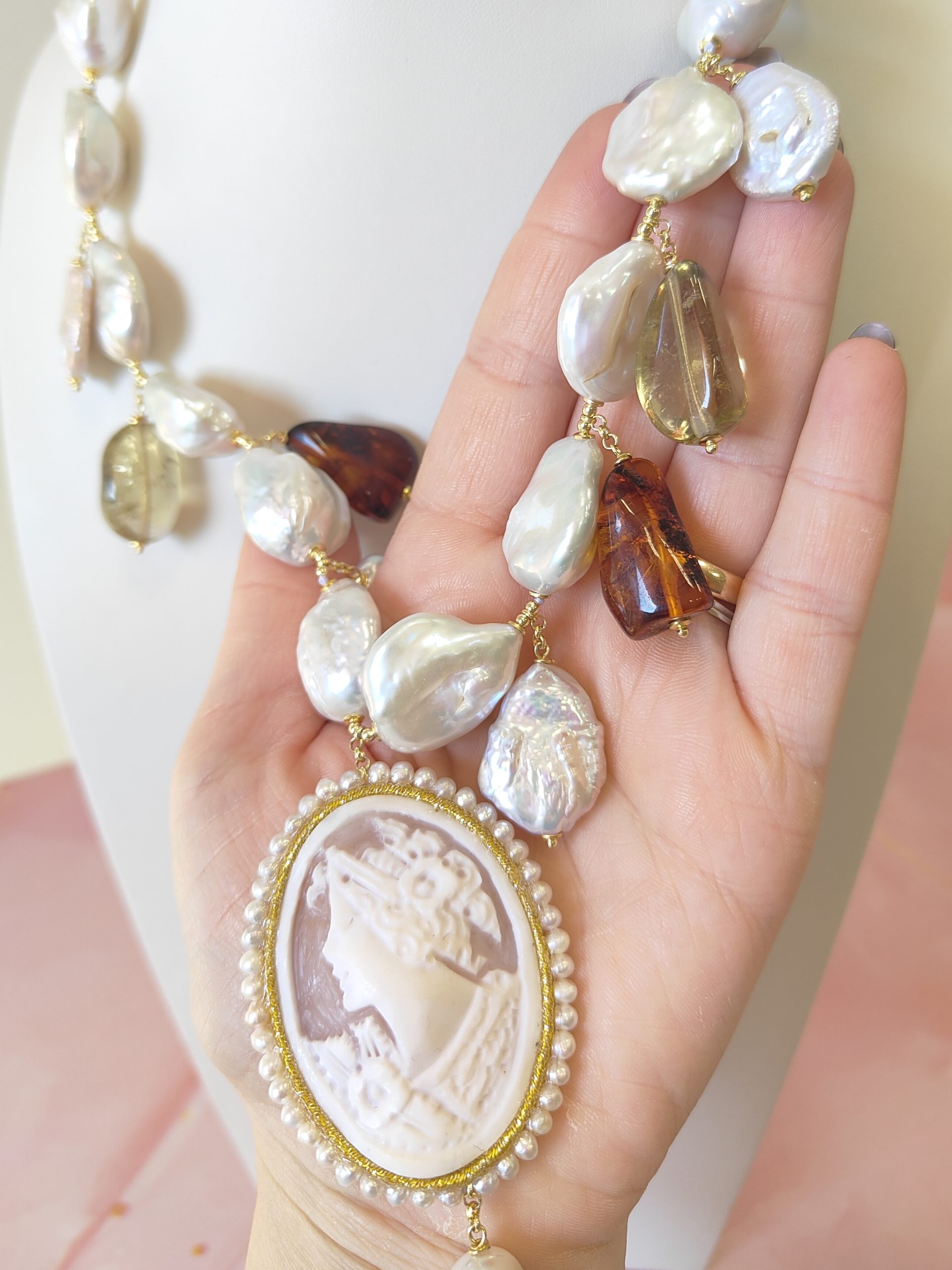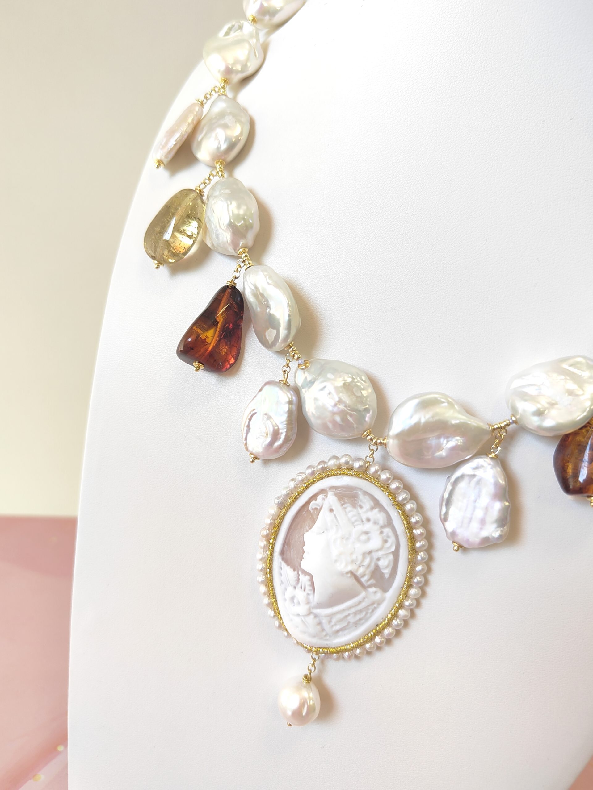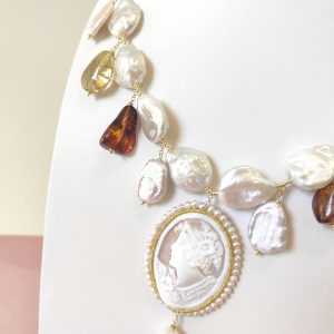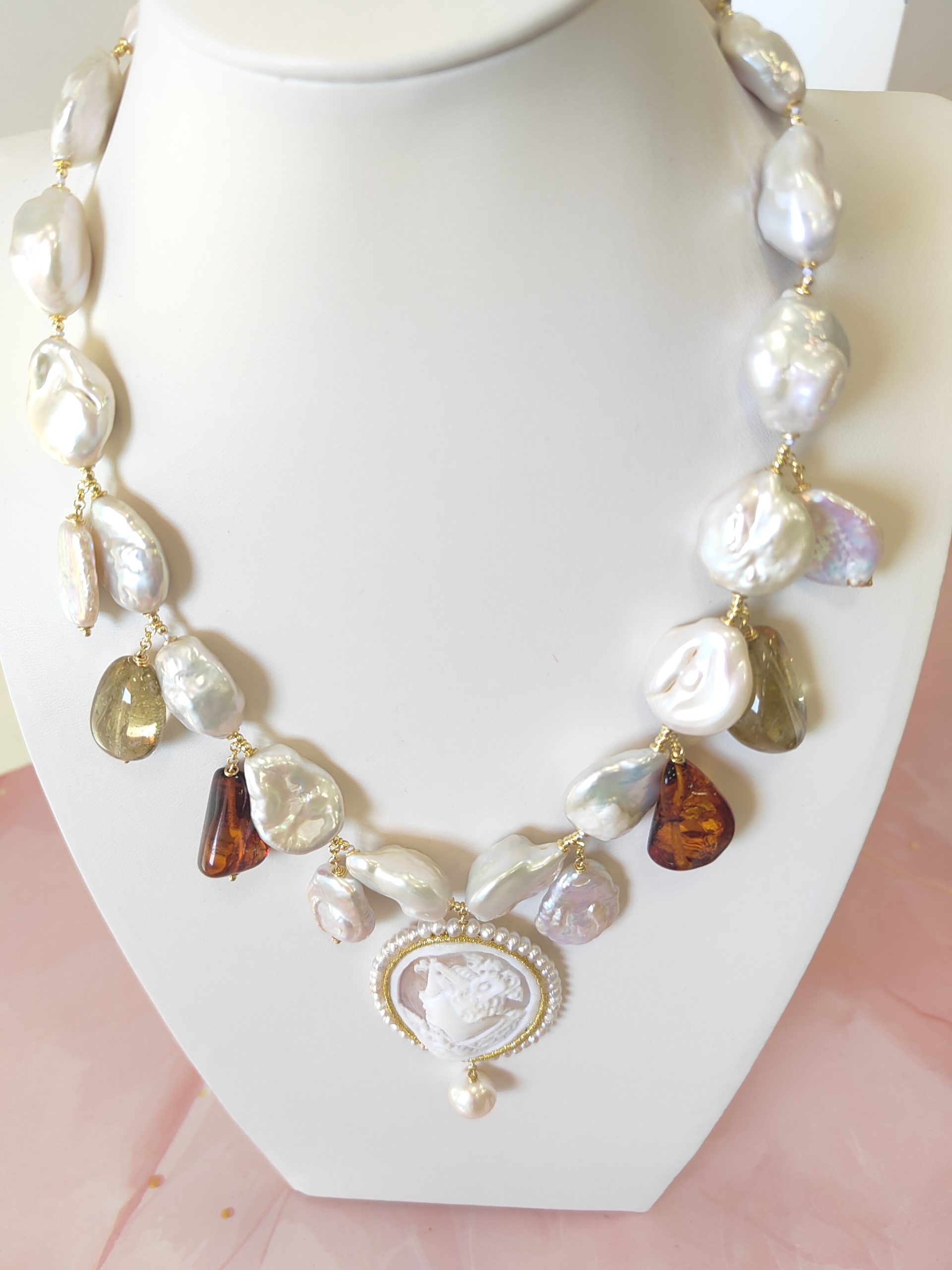 Materiali: perle naturali barocche, ambra baltica naturale, quarzo fumé naturale, cammeo inciso, argento 925 placcato oro