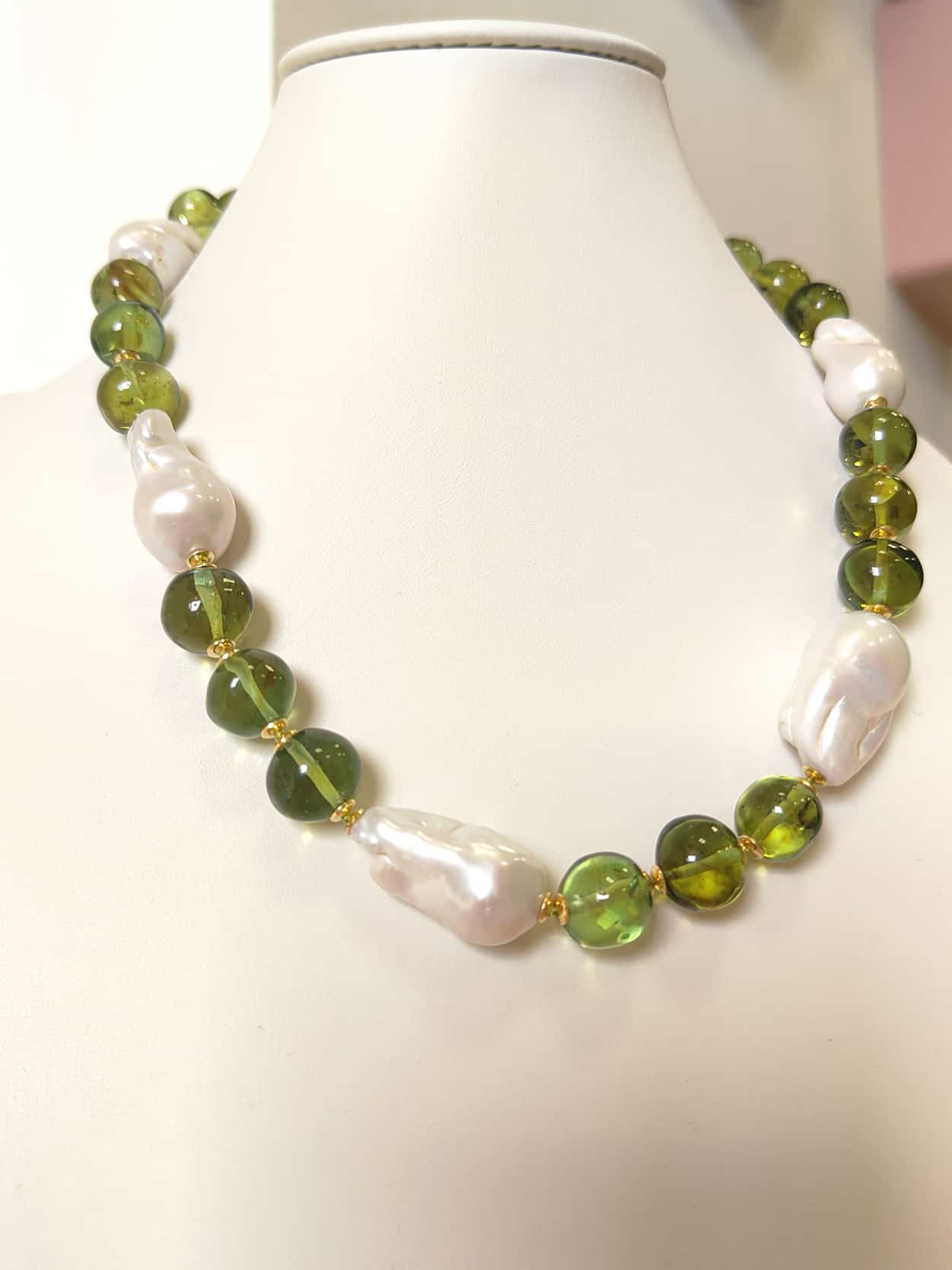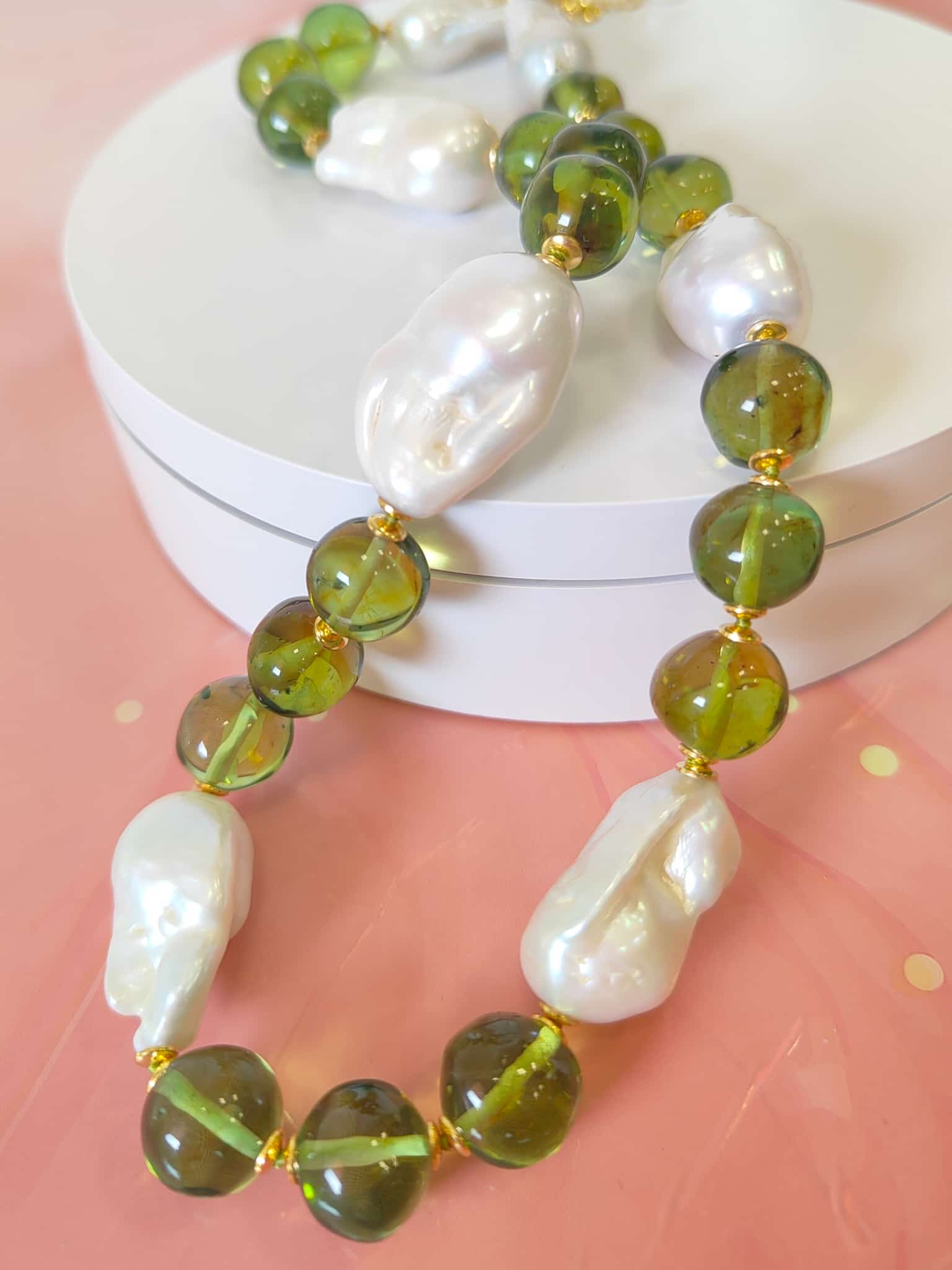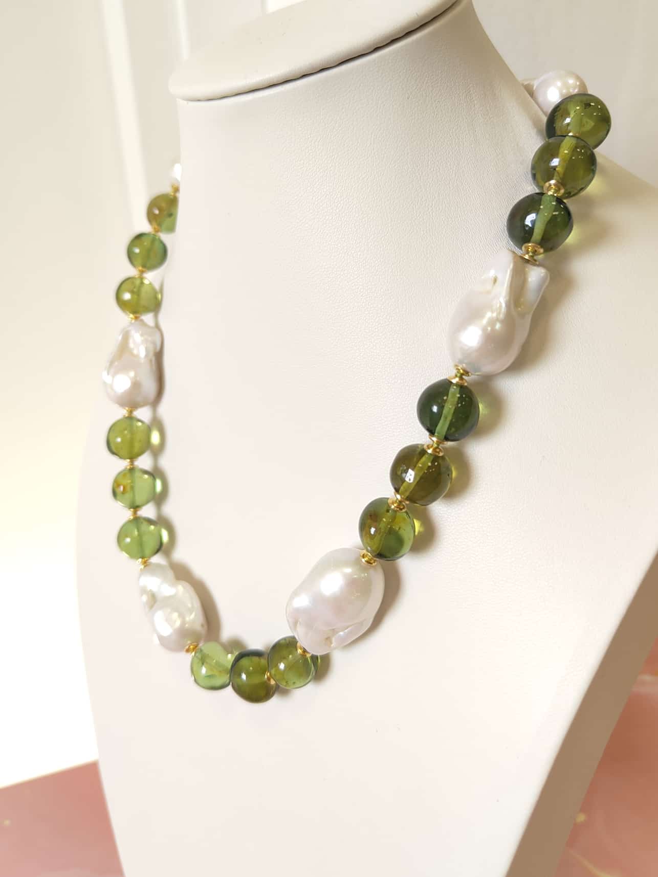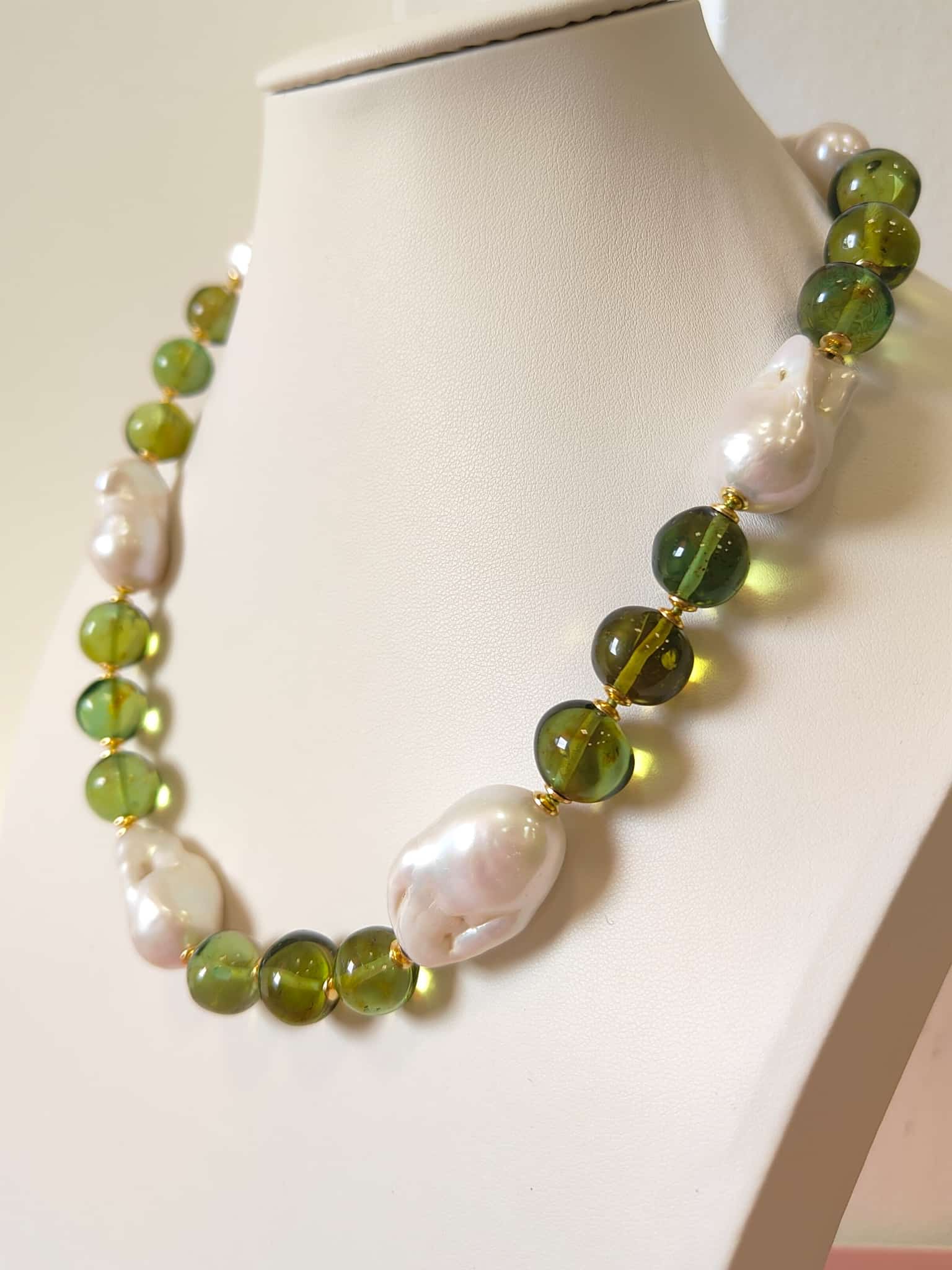 Materiali: ambra verde naturale, perle barocche di acqua dolce