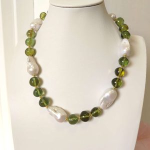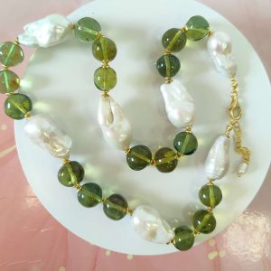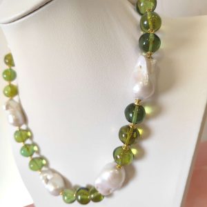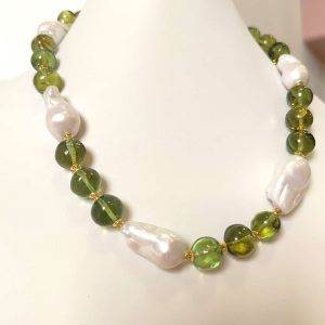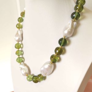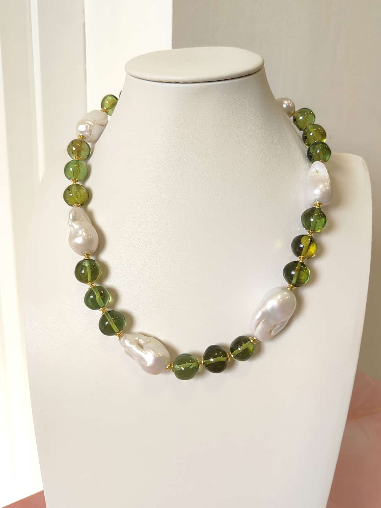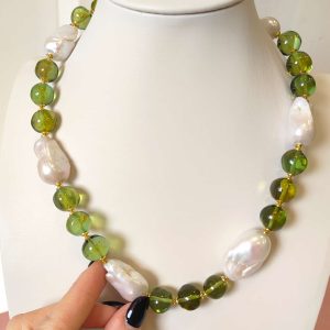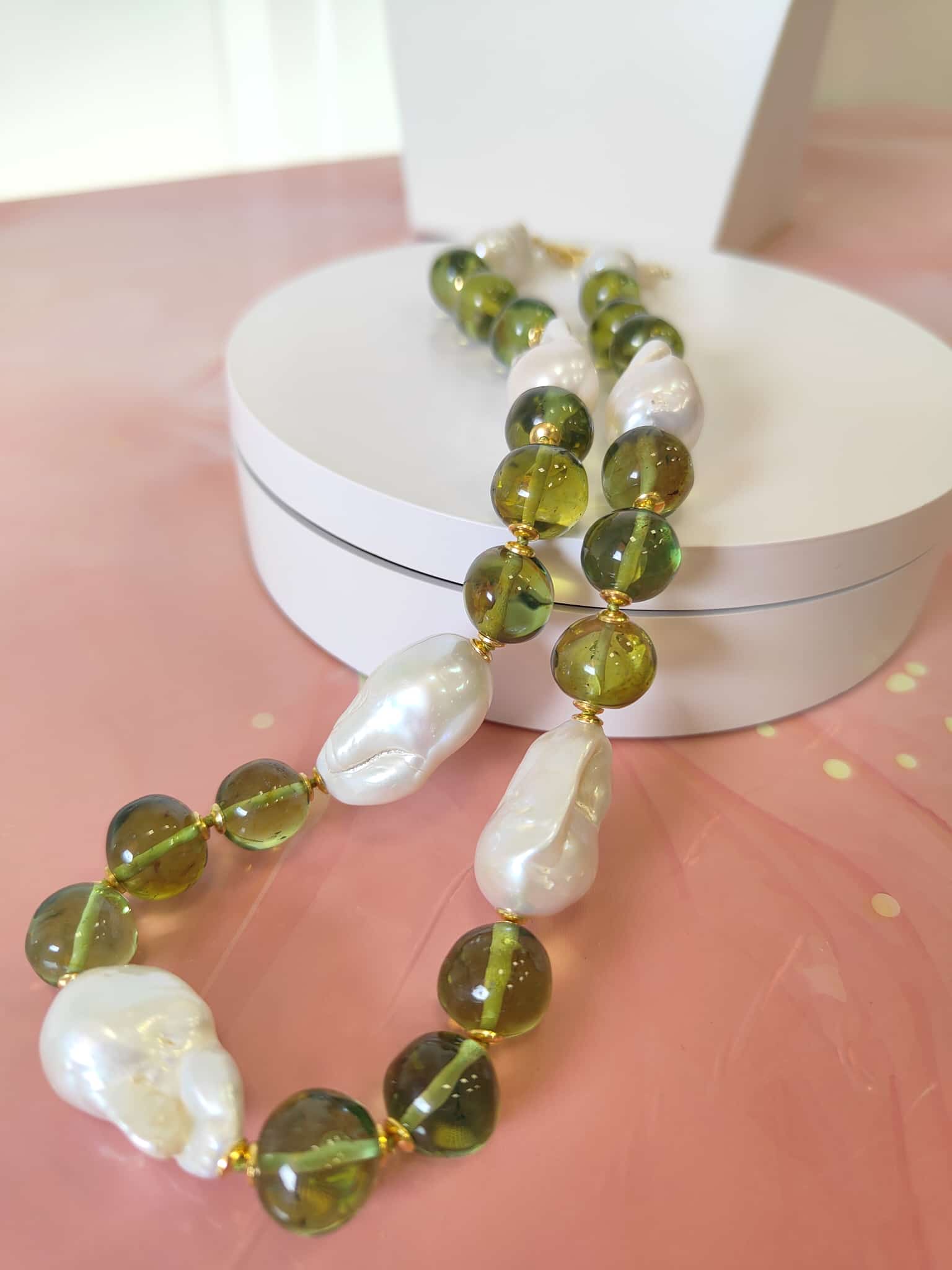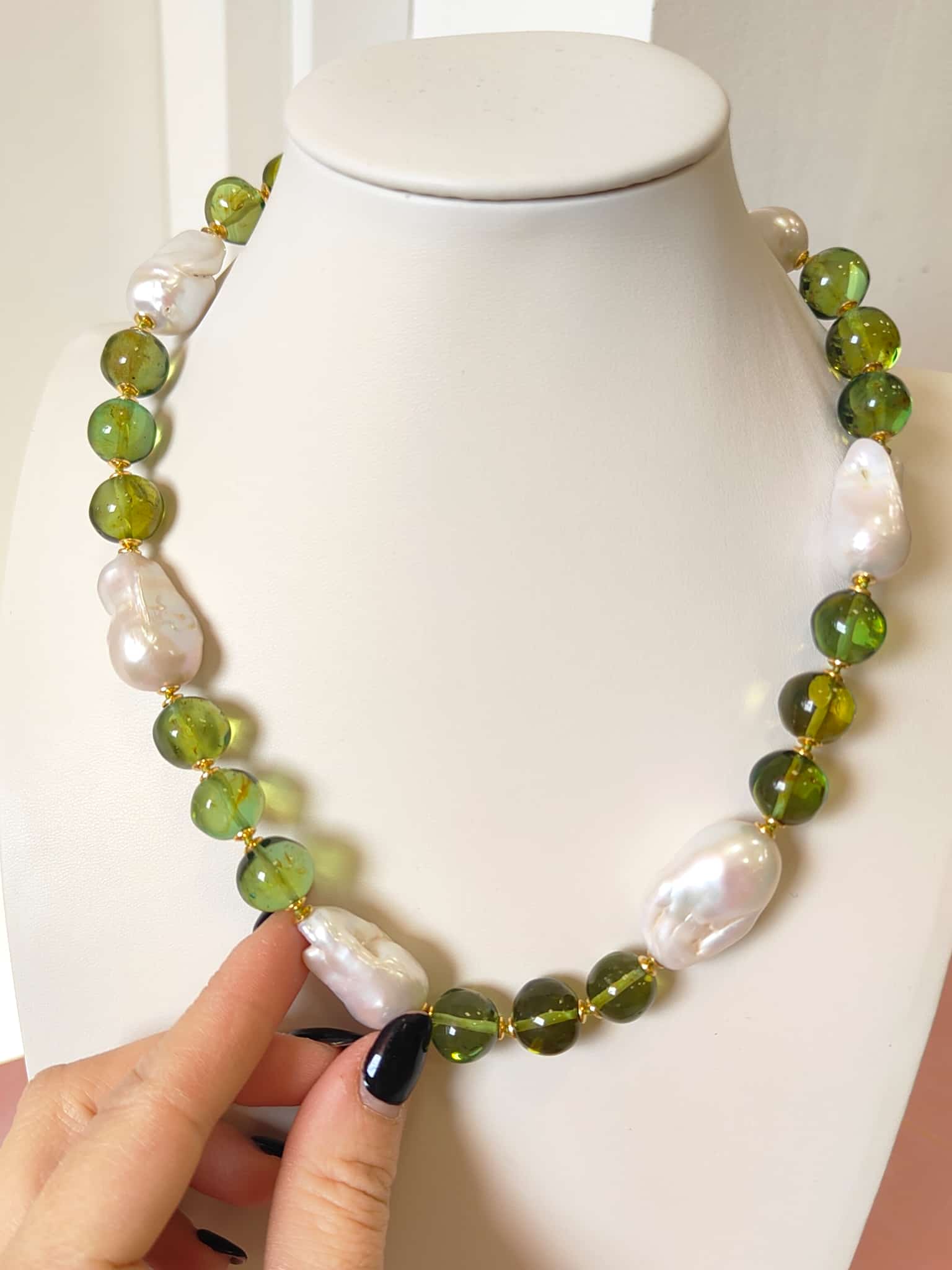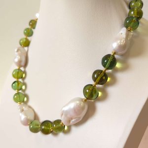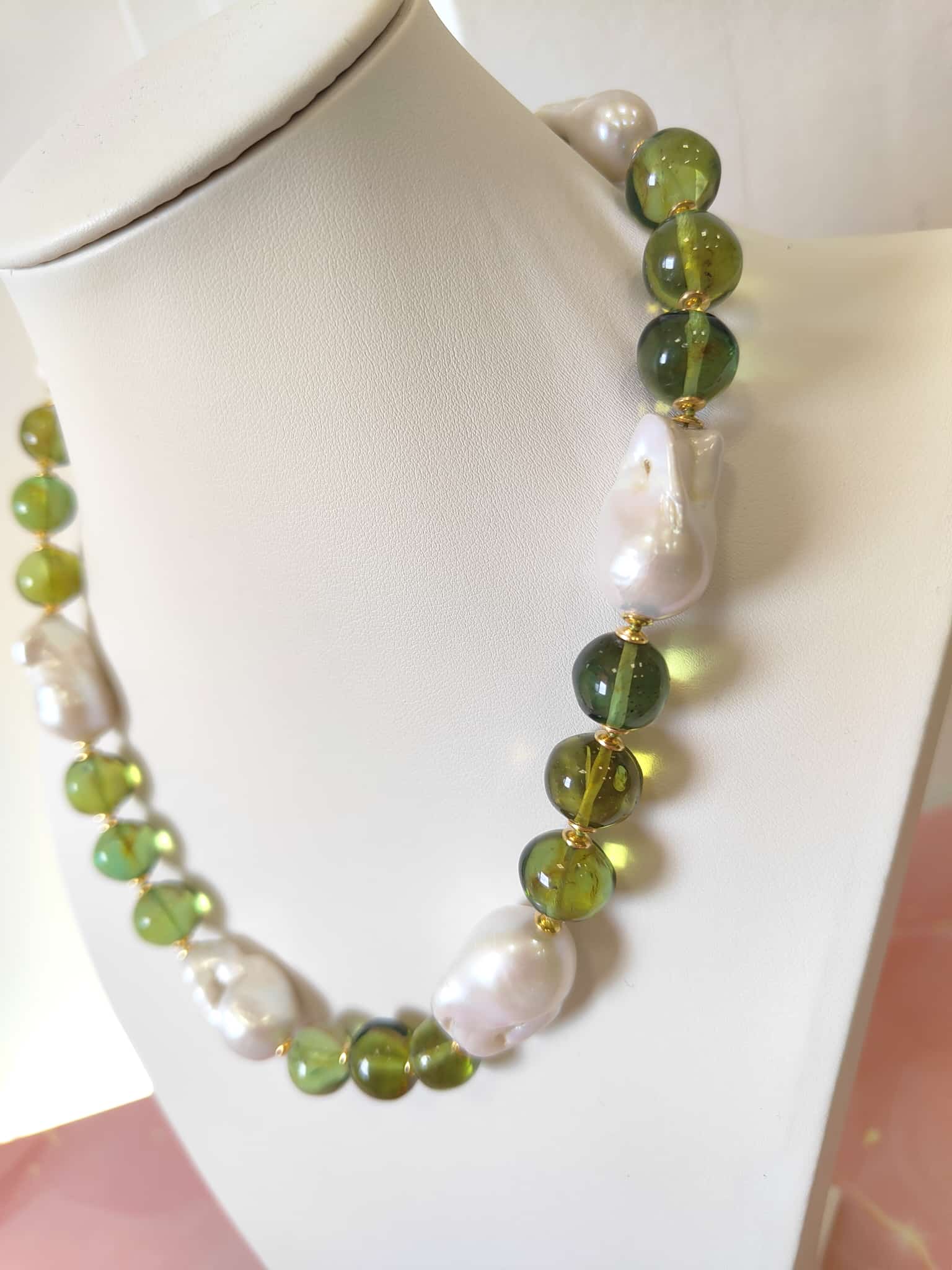 Materiali: ambra verde naturale, perle barocche di acqua dolce