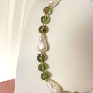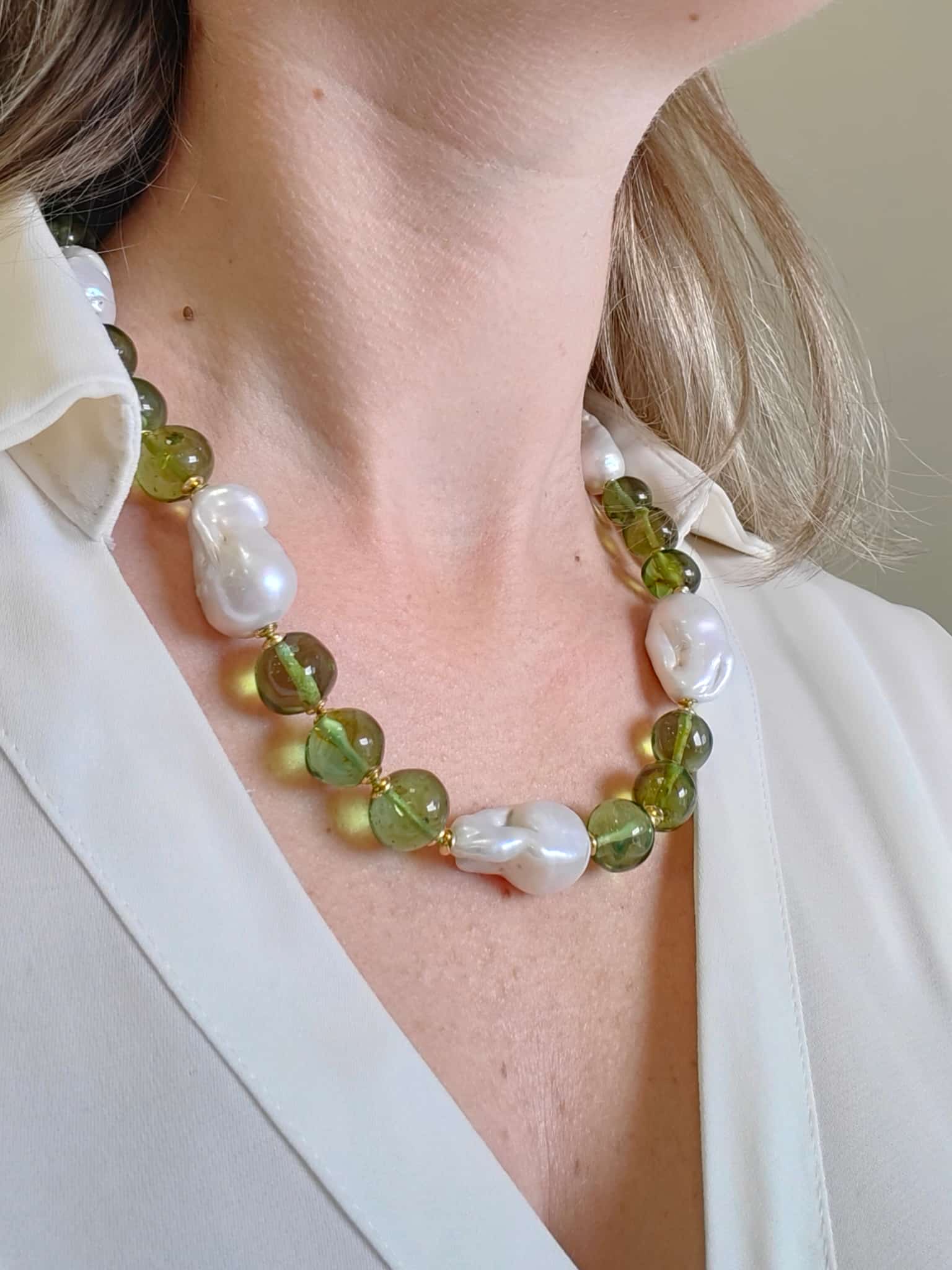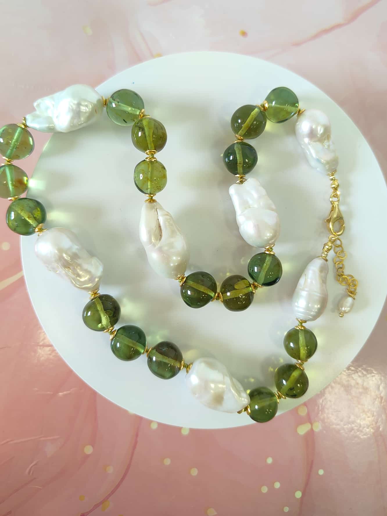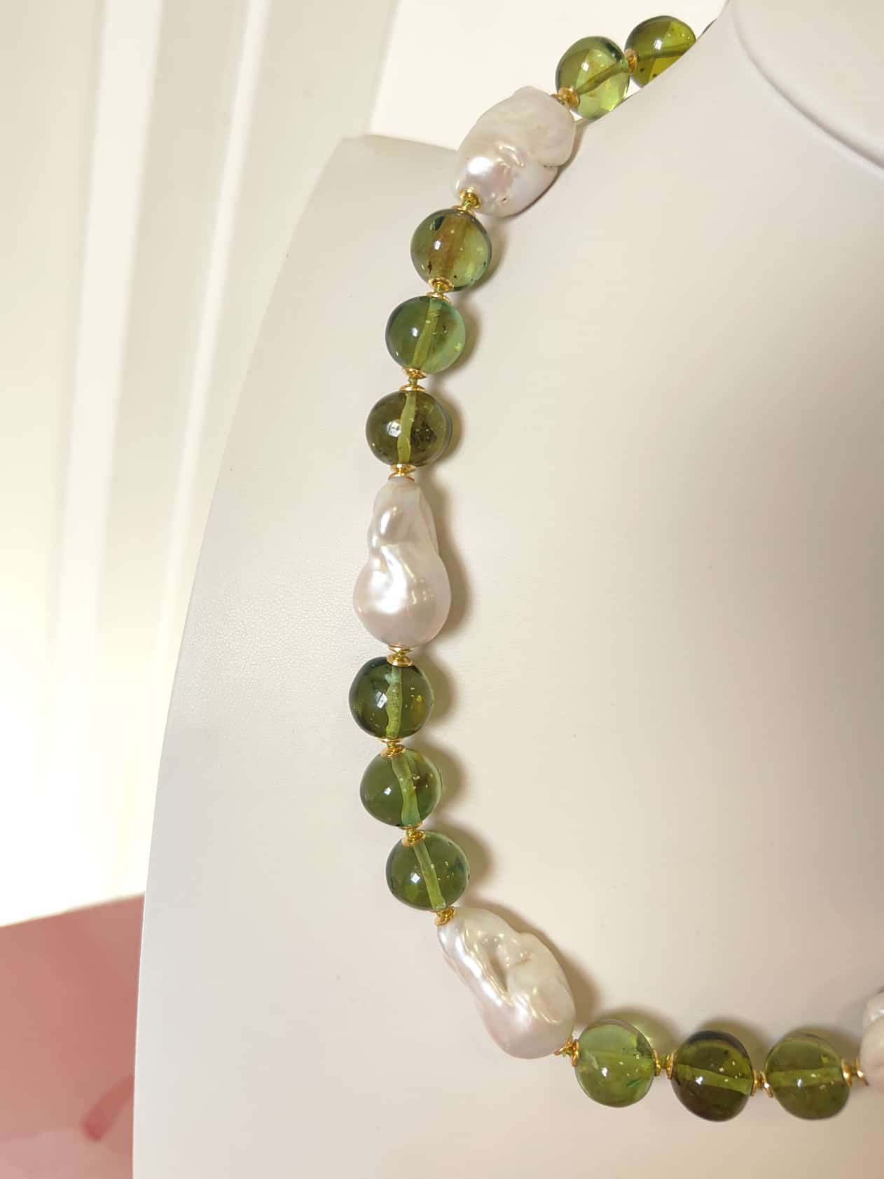 Ogni elemento è scelto con cura. Inoltre, la montatura artigianale valorizza la qualità delle pietre senza appesantirle. La sequenza delle sfere in ambra verde è morbida e regolare, mentre le perle barocche donano un ritmo più naturale. Questo contrasto rende il gioiello elegante, ma anche versatile. Puoi indossarlo ogni giorno oppure abbinarlo a un look più formale.