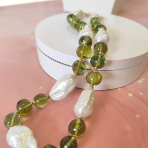 La Collana Perle Ambra Verde è un gioiello pensato per chi ama materiali naturali e dettagli raffinati. Fin dal primo sguardo, la sua armonia tra perle barocche e ambra verde cattura l’attenzione. Le perle, luminose e irregolari, creano movimento. L’ambra, invece, aggiunge trasparenze e riflessi caldi che cambiano con la luce. Il risultato è una collana equilibrata e ricca di carattere.