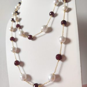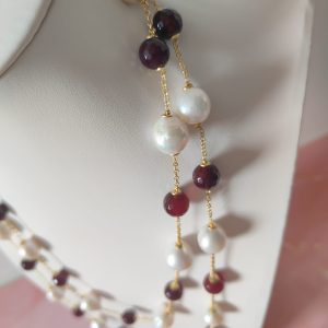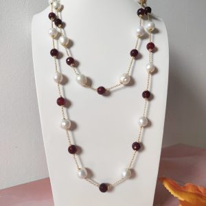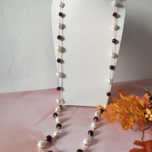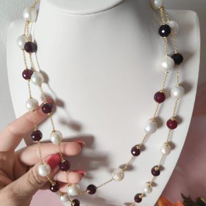 La collana perle e agata borgogna lunga senza chiusura è un accessorio raffinato, pensato per chi ama indossare creazioni artigianali capaci di valorizzare ogni look. Infatti, l’abbinamento tra la luminosità delle perle naturali barocche e la profondità dell’agata borgogna crea un contrasto unico, elegante e sempre attuale.