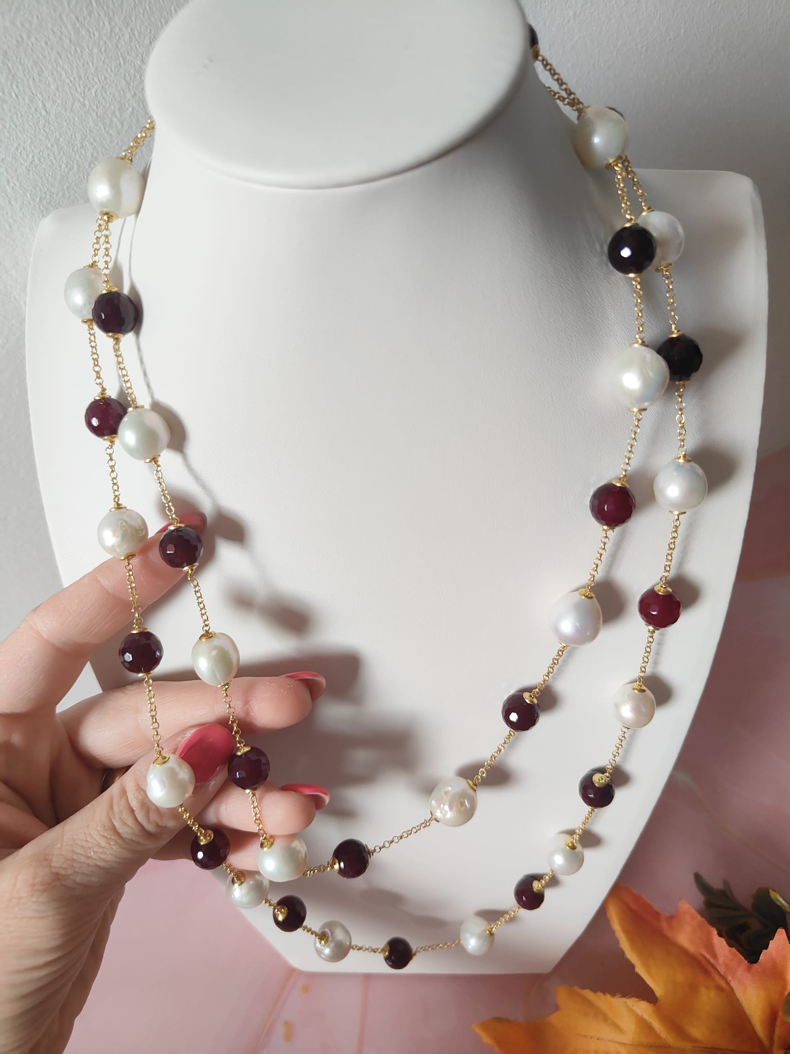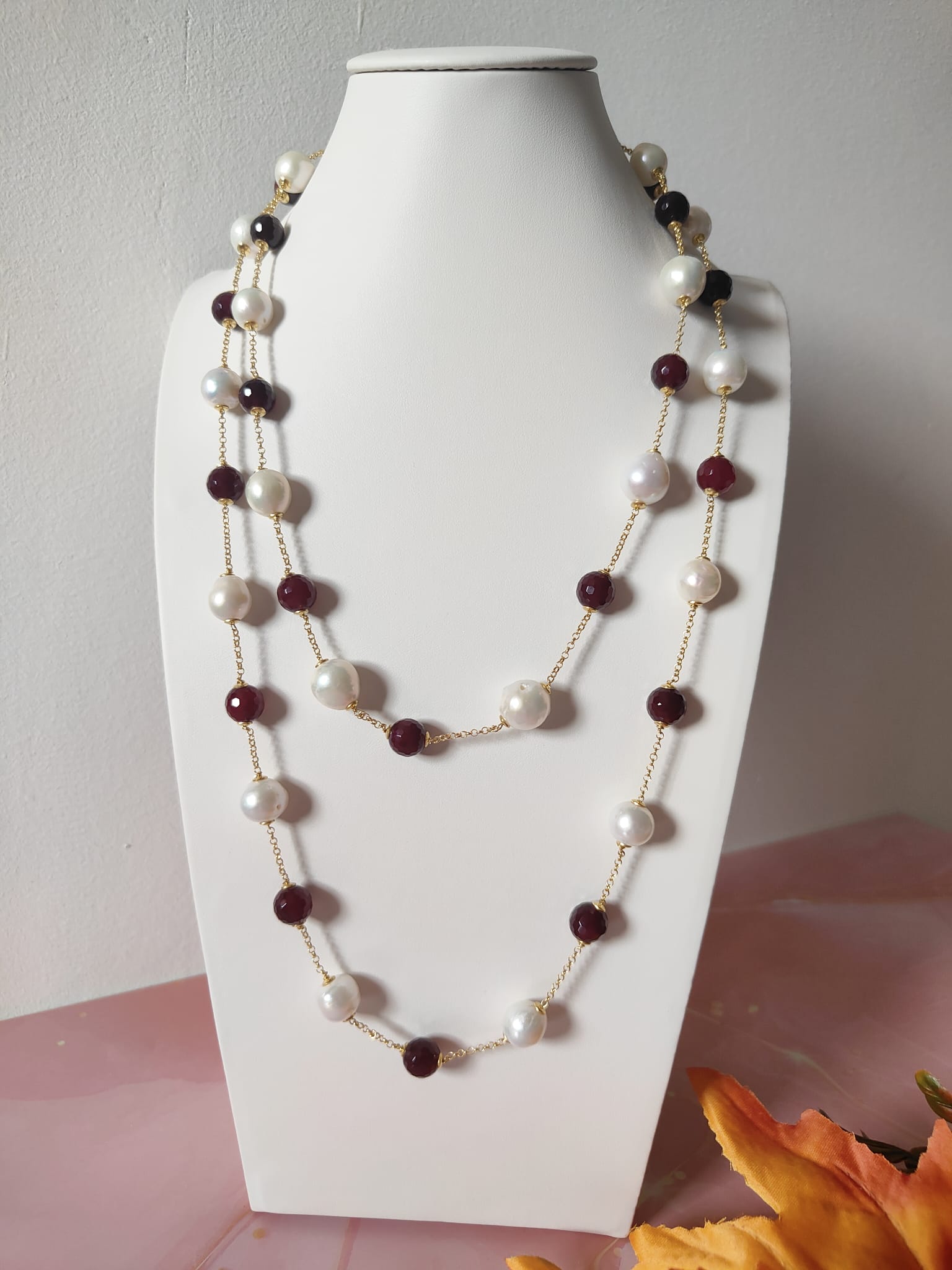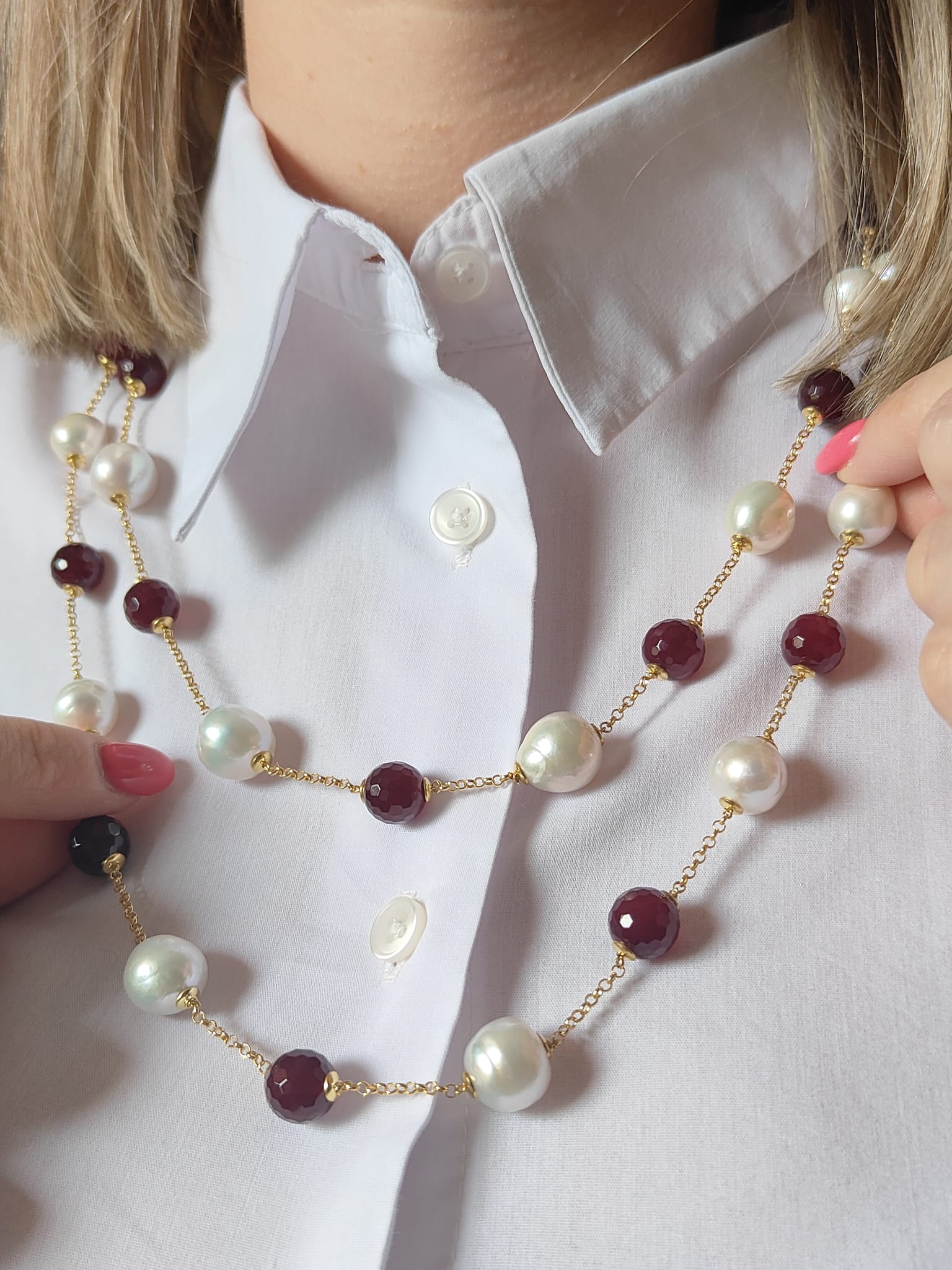 La collana perle e agata borgogna è una creazione che unisce tradizione e modernità, trasformandosi in un gioiello versatile, elegante e senza tempo.