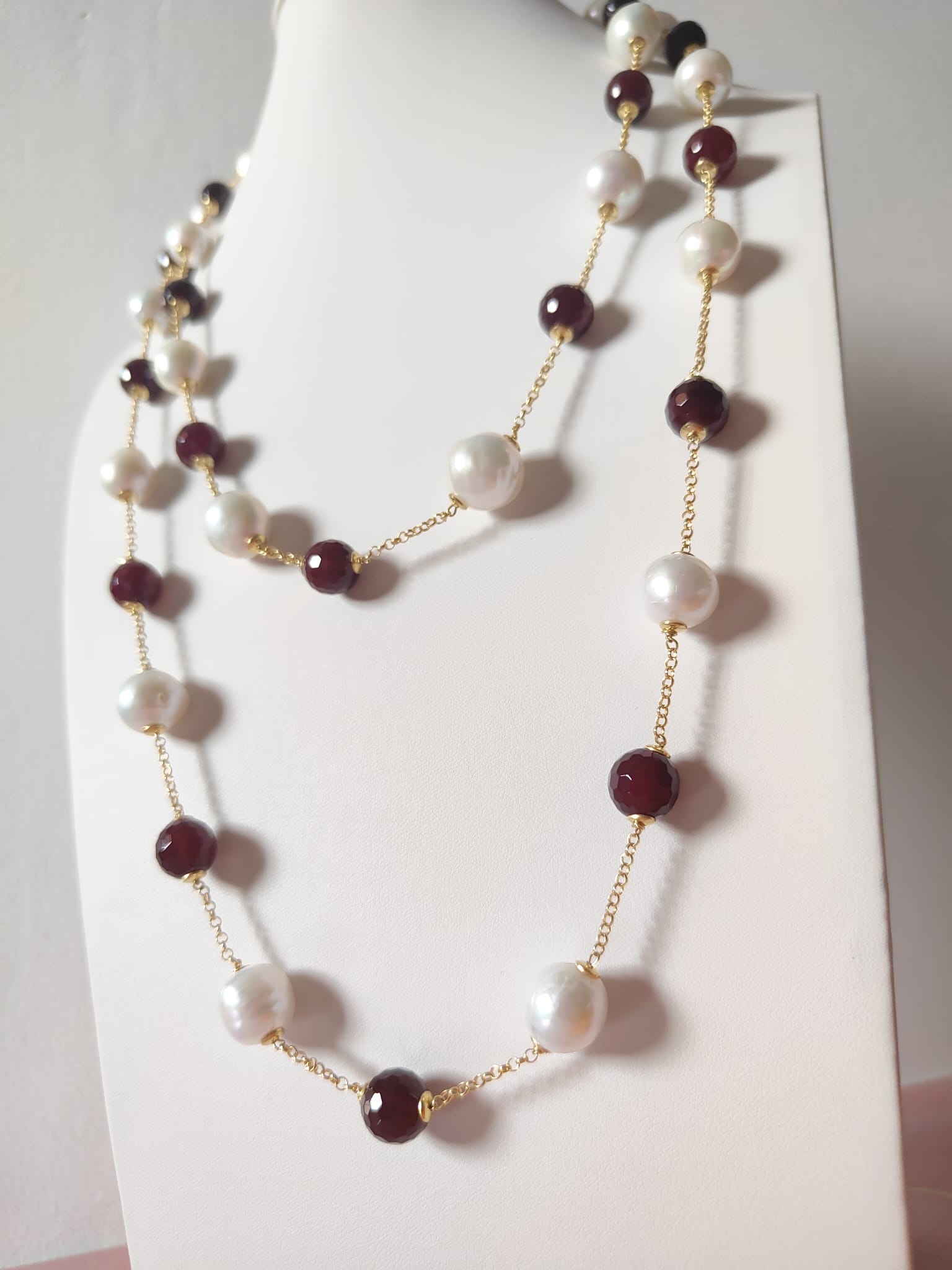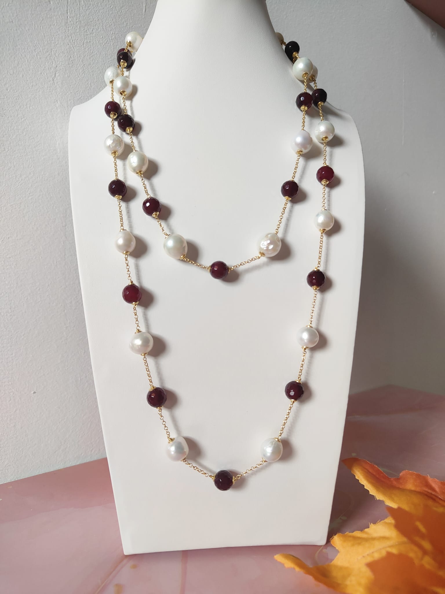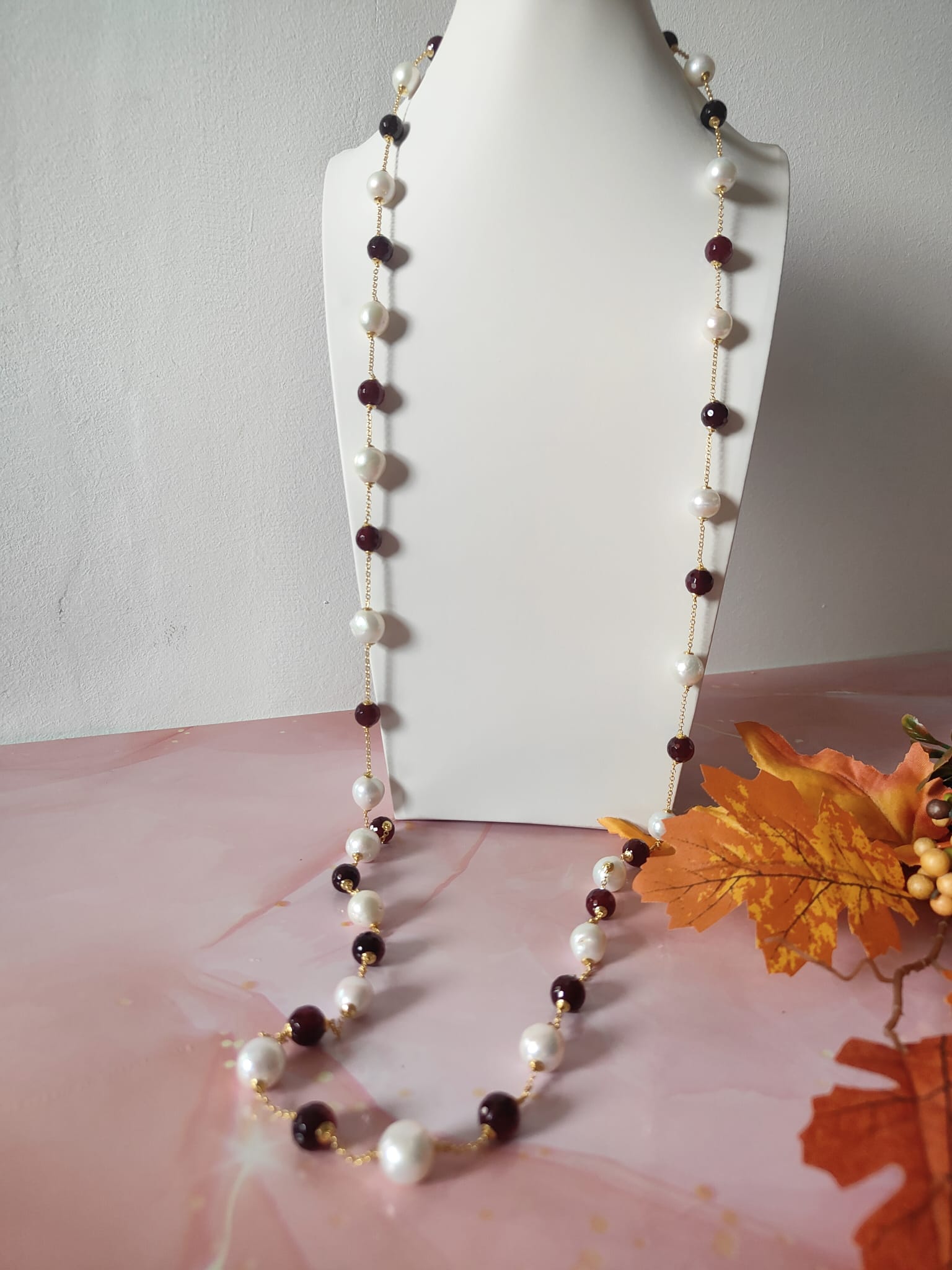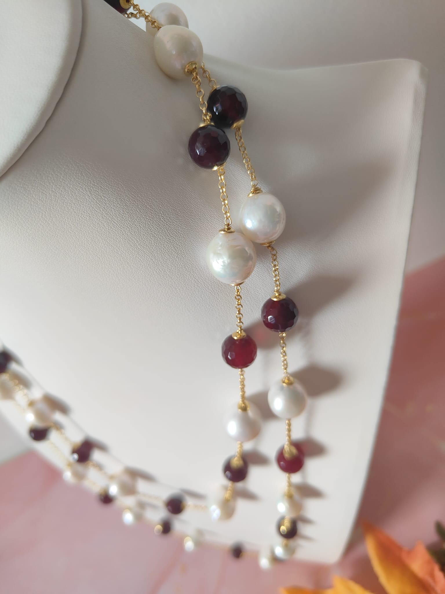 La collana perle e agata borgogna è una creazione che unisce tradizione e modernità, trasformandosi in un gioiello versatile, elegante e senza tempo.