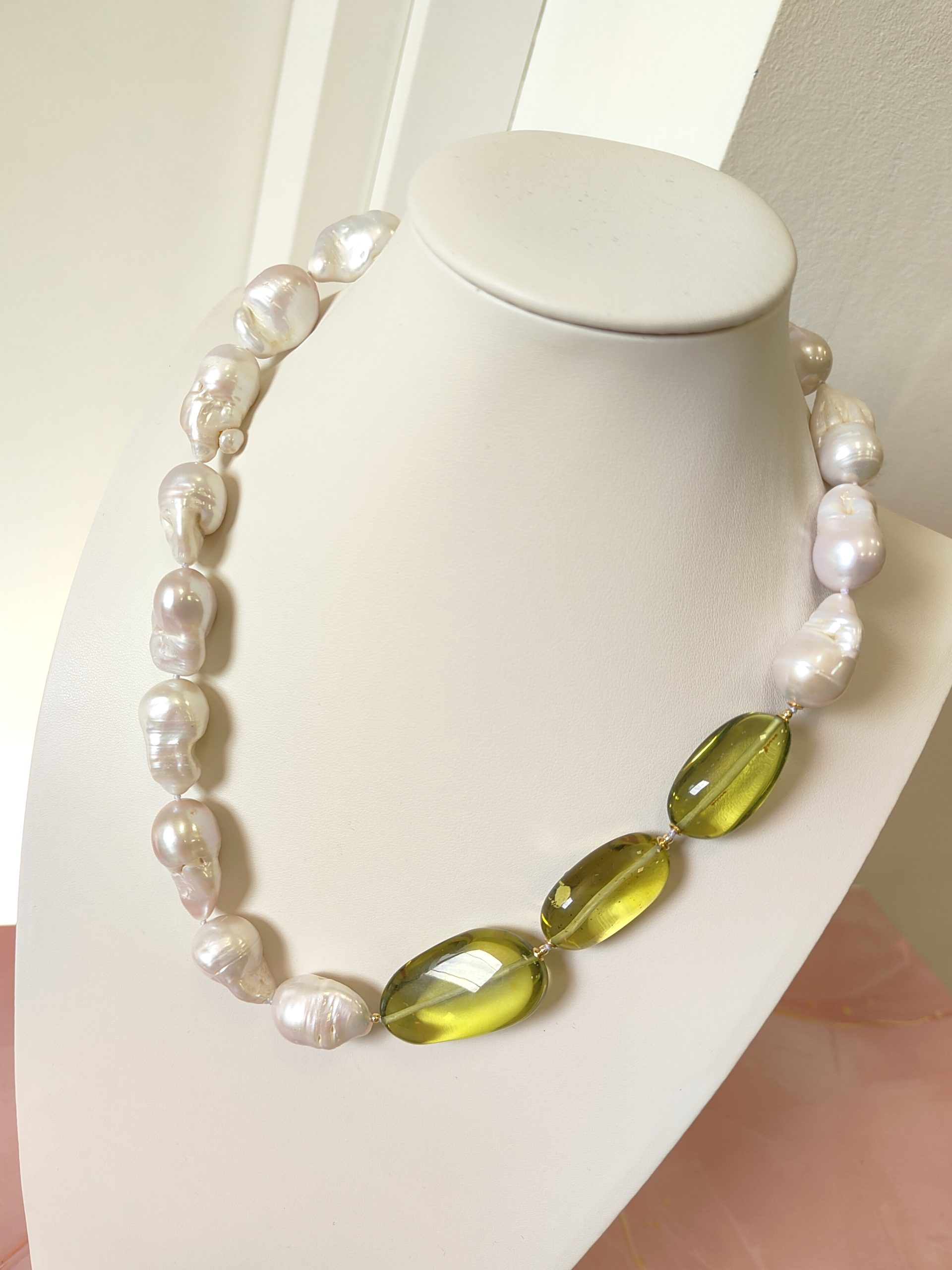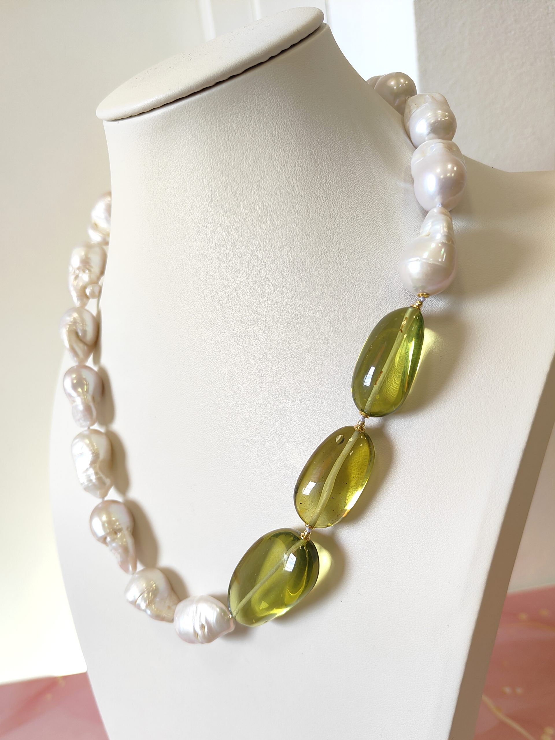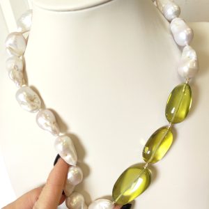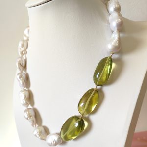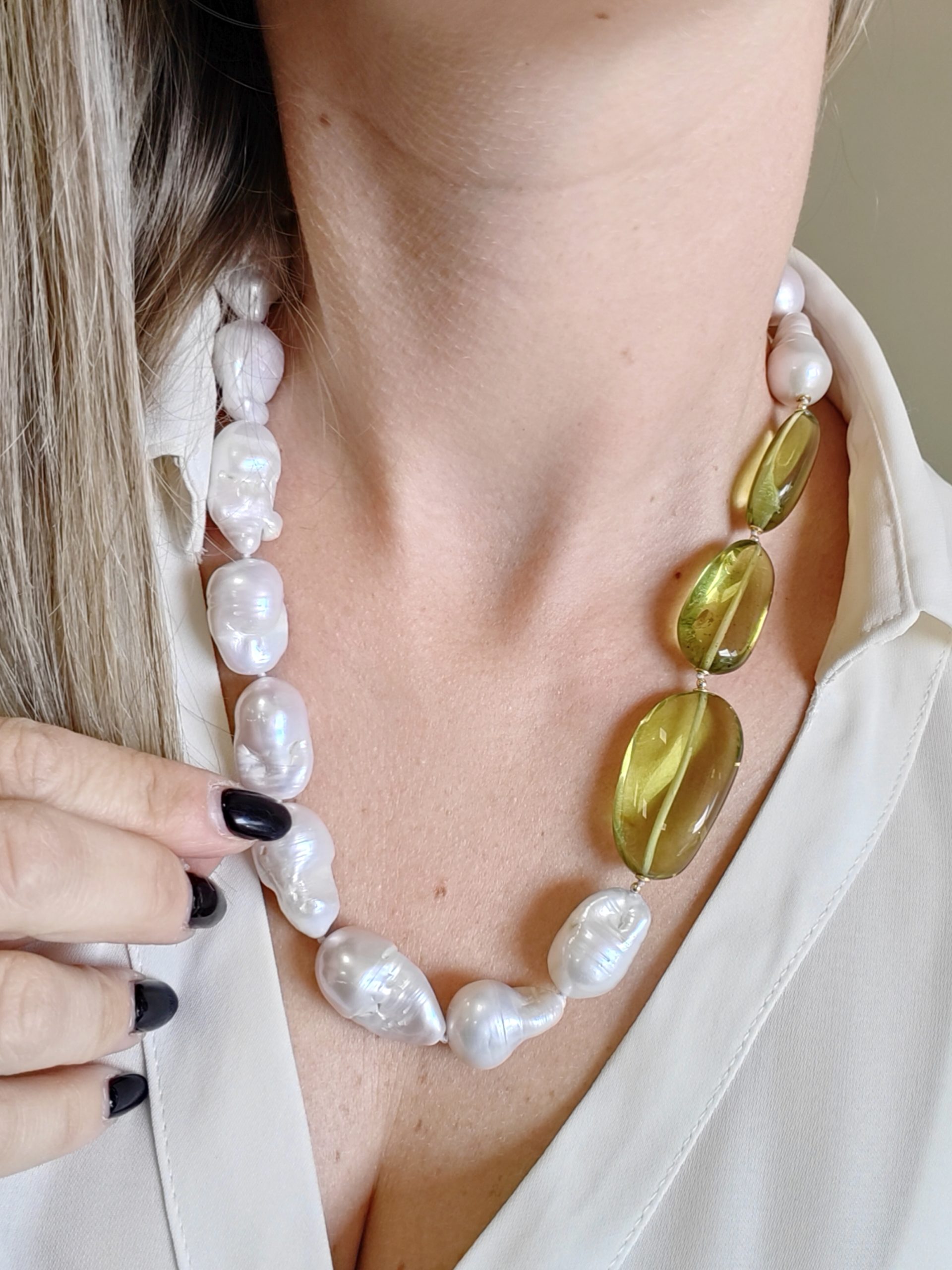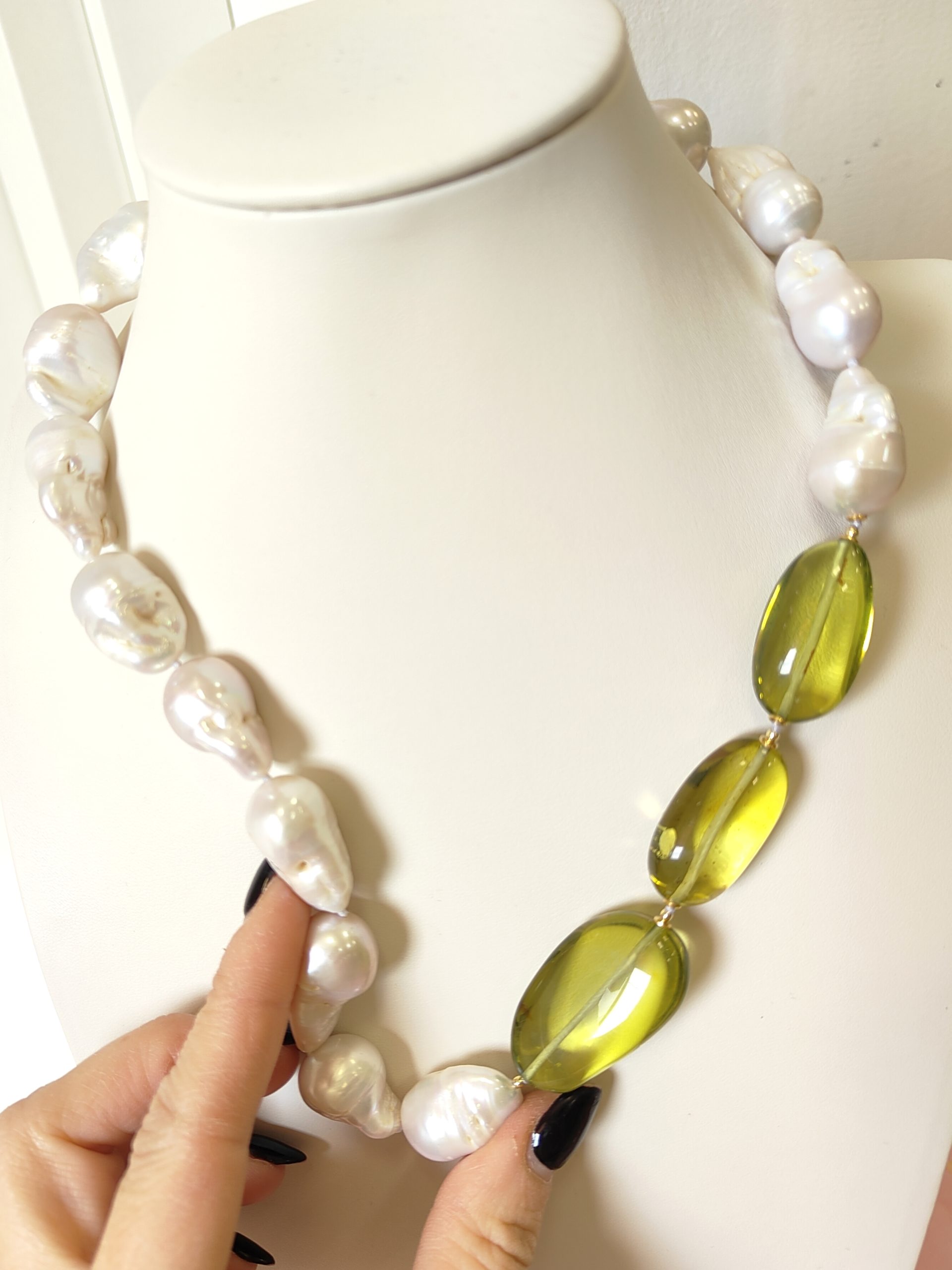 La collana perle e ambra verde è una creazione luminosa e sofisticata, pensata per chi desidera indossare un gioiello dalla bellezza naturale e dallo stile raffinato. Le perle barocche, protagoniste indiscusse di questo modello, sono scelte una ad una per la loro iridescenza, la loro forma organica e il modo in cui catturano la luce, restituendo riflessi morbidi e cangianti. Ogni perla racconta una storia, ogni superficie imperfetta diventa un dettaglio di carattere che rende la collana armoniosa, viva e sorprendente al primo sguardo.
