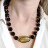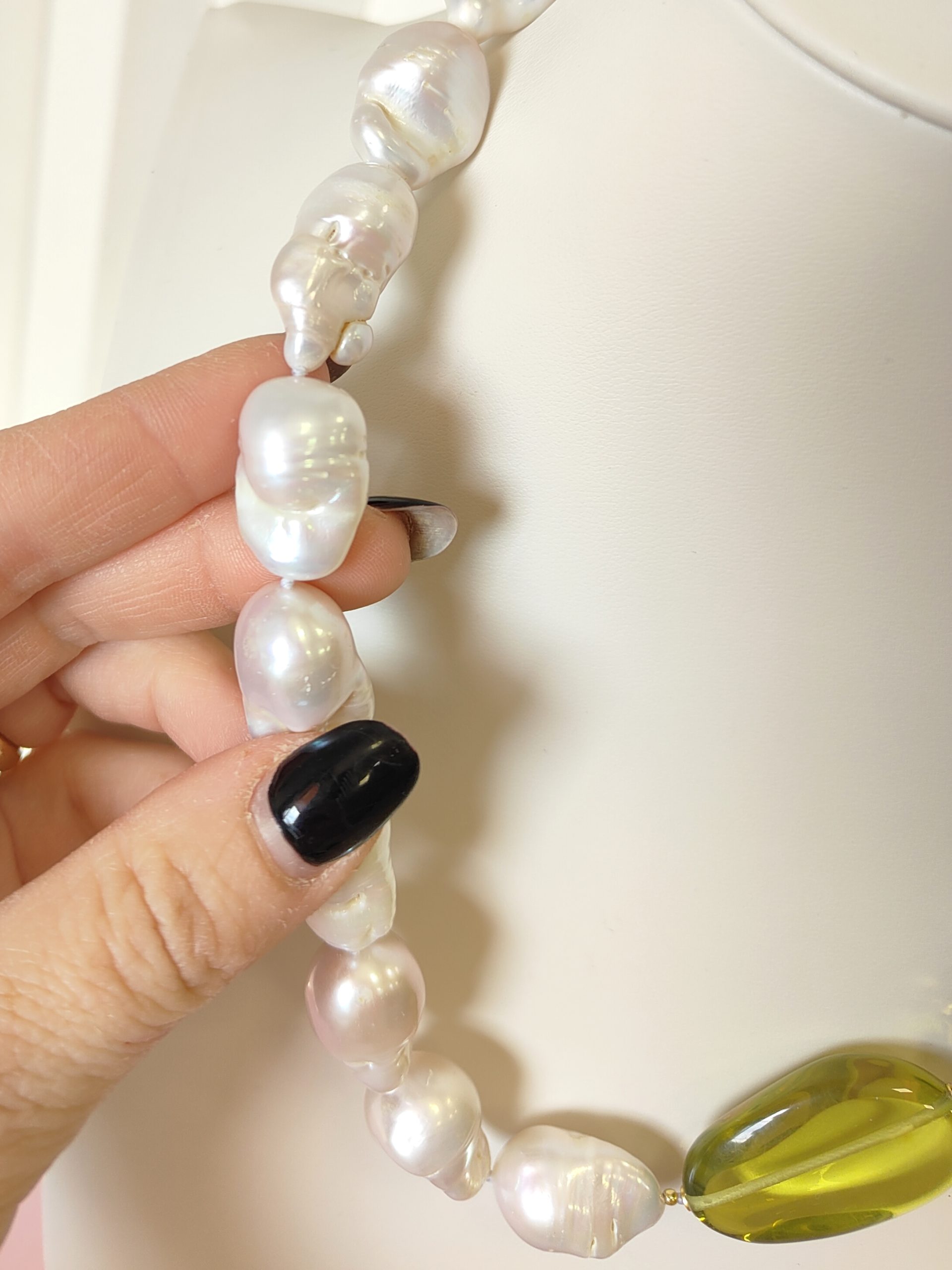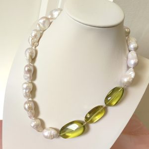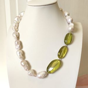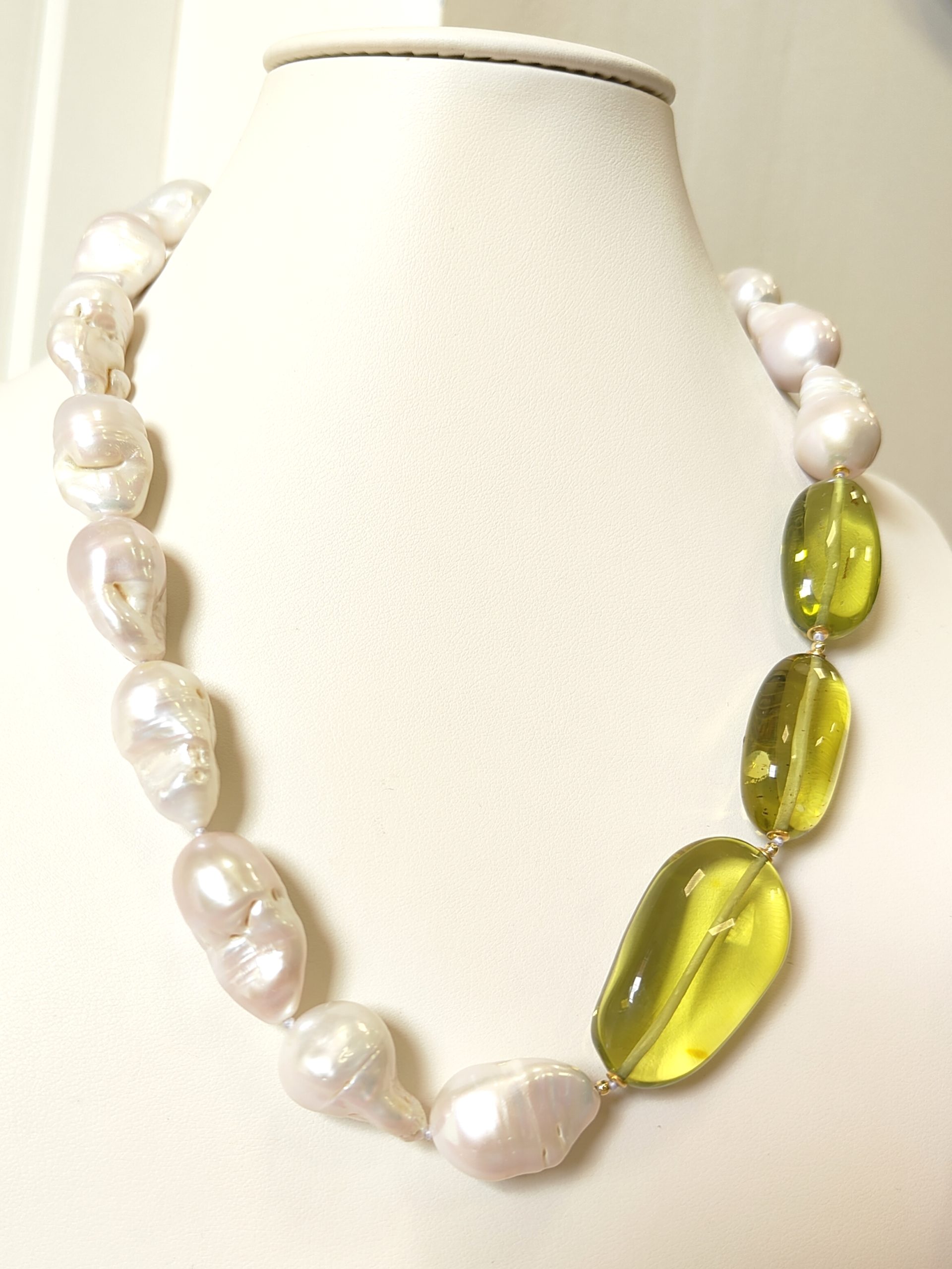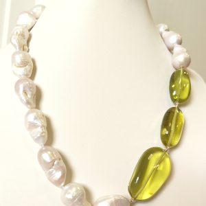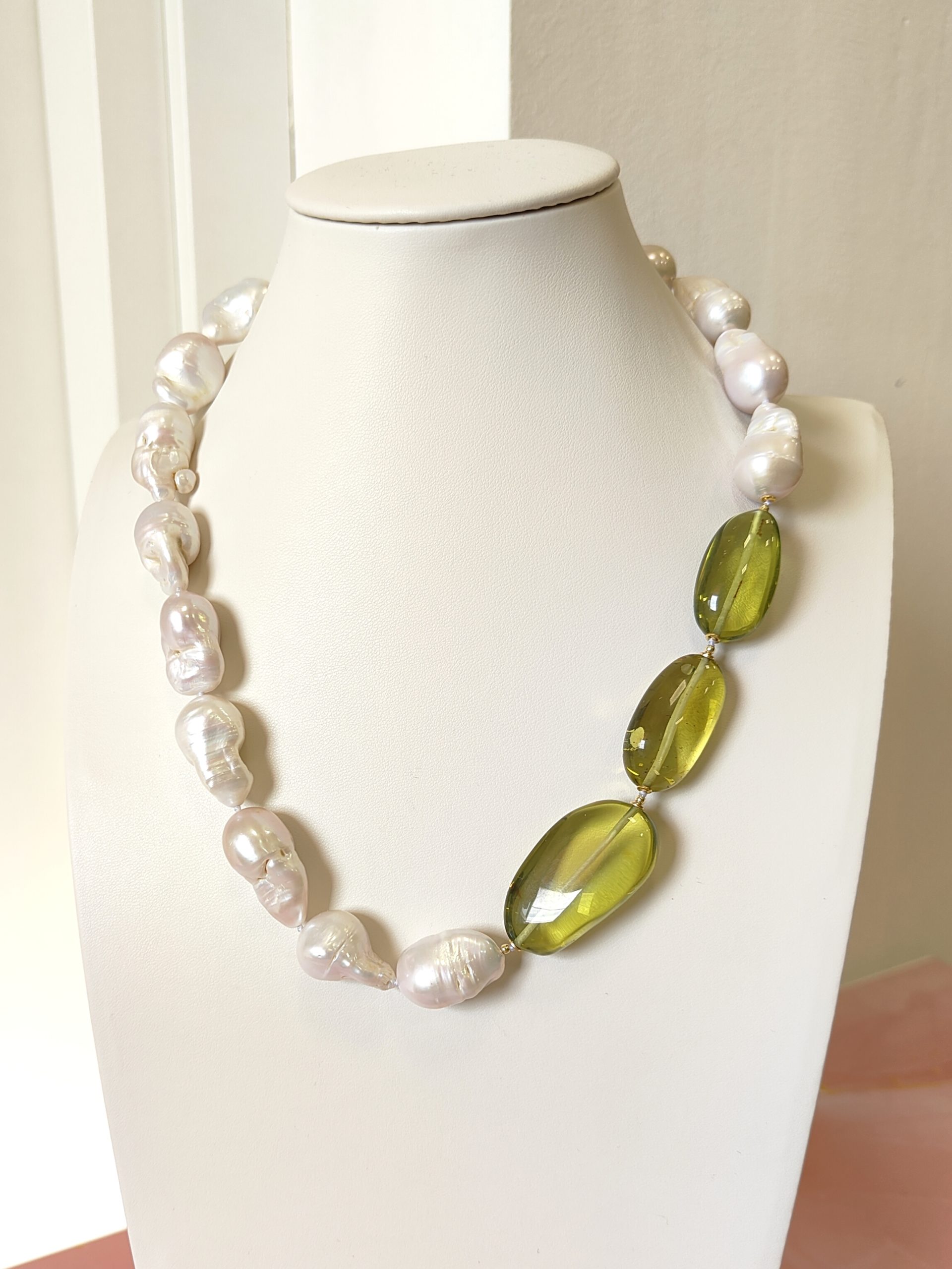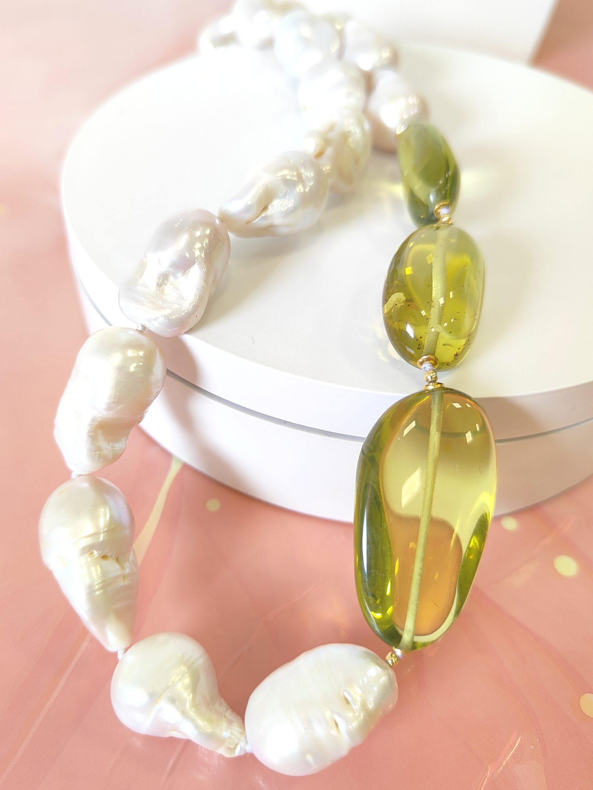 La collana perle e ambra verde è una creazione luminosa e sofisticata, pensata per chi desidera indossare un gioiello dalla bellezza naturale e dallo stile raffinato. Le perle barocche, protagoniste indiscusse di questo modello, sono scelte una ad una per la loro iridescenza, la loro forma organica e il modo in cui catturano la luce, restituendo riflessi morbidi e cangianti. Ogni perla racconta una storia, ogni superficie imperfetta diventa un dettaglio di carattere che rende la collana armoniosa, viva e sorprendente al primo sguardo.