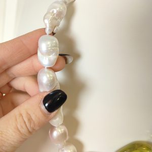 La collana è annodata rigorosamente a mano, una tecnica che offre fluidità alla linea e una qualità artigianale che si percepisce sia nel movimento sia nella resistenza. Sul lato frontale, tre importanti elementi in ambra verde donano un contrasto cromatico spettacolare: il loro colore caldo, trasparente e ricco di riflessi dorati rende il design ancora più originale. L’ambra, con la sua naturale profondità, aggiunge un tocco di energia elegante che si equilibra perfettamente con il candore perlaceo delle barocche.