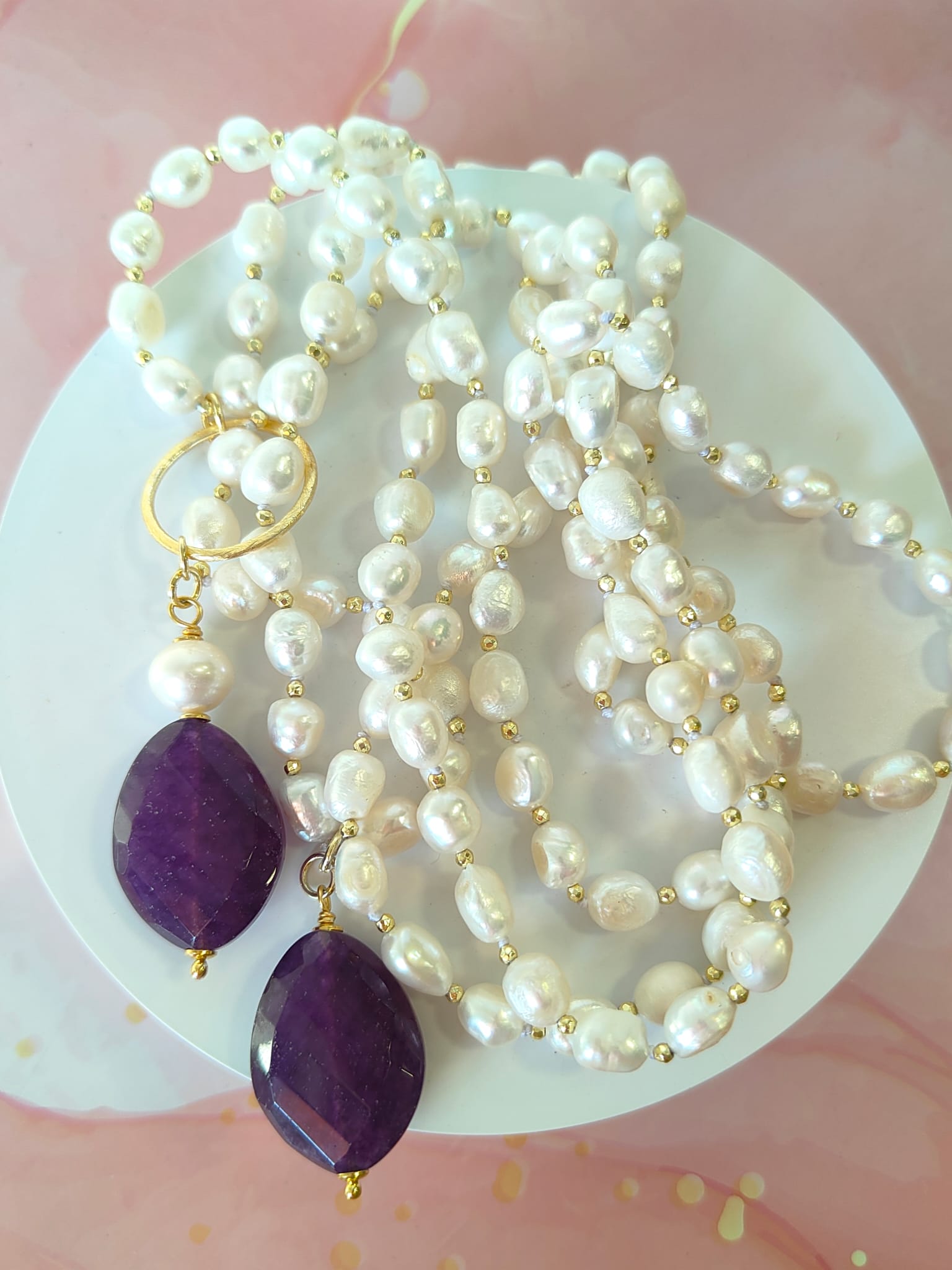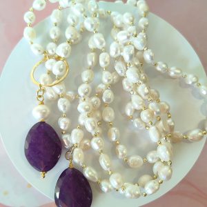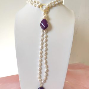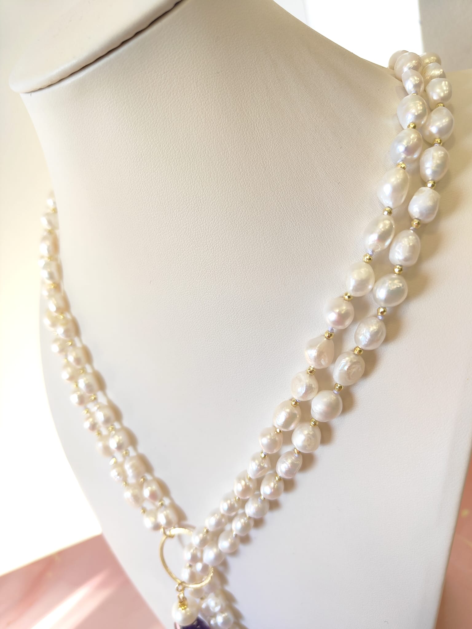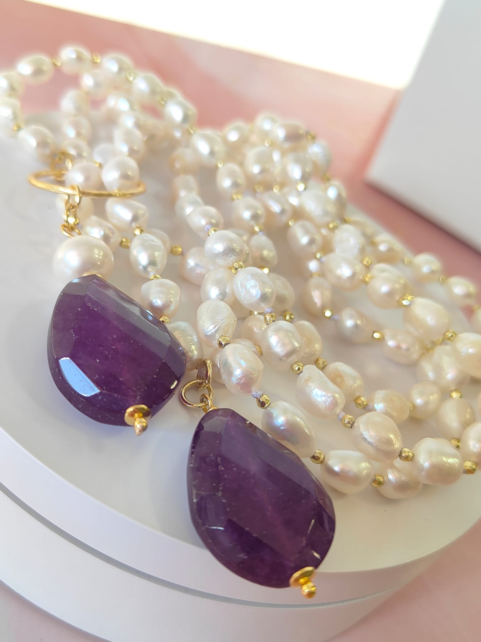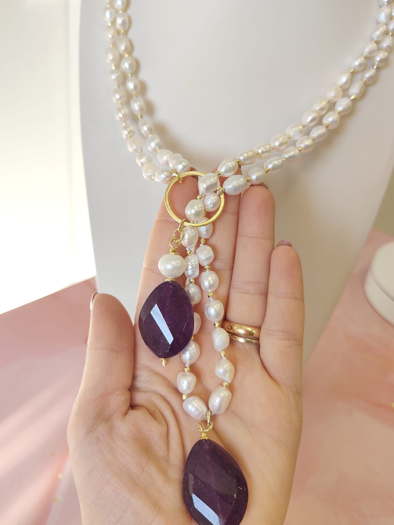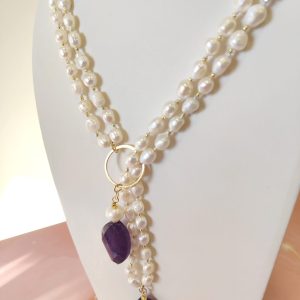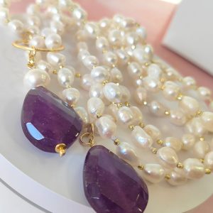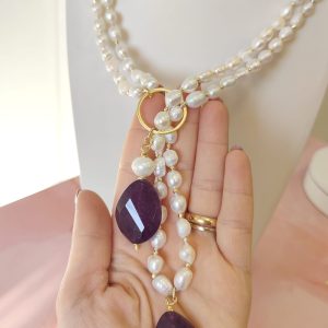 La collana perle e ametista è un gioiello raffinato e scenografico, pensato per chi ama accessori eleganti ma capaci di trasformarsi. Fin dal primo sguardo, il doppio filo di perle naturali colpisce per la sua luminosità morbida e avvolgente. Allo stesso tempo, la disposizione irregolare delle perle racconta il valore della lavorazione artigianale.