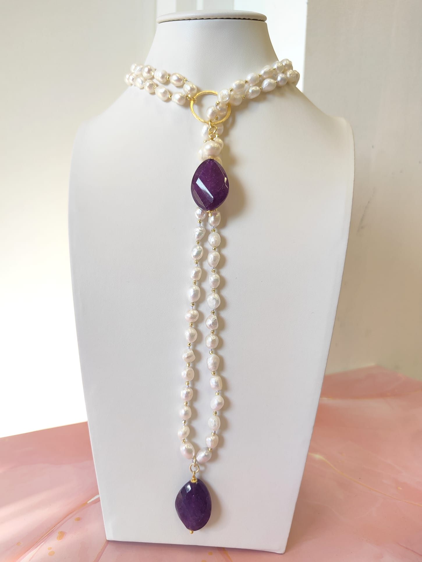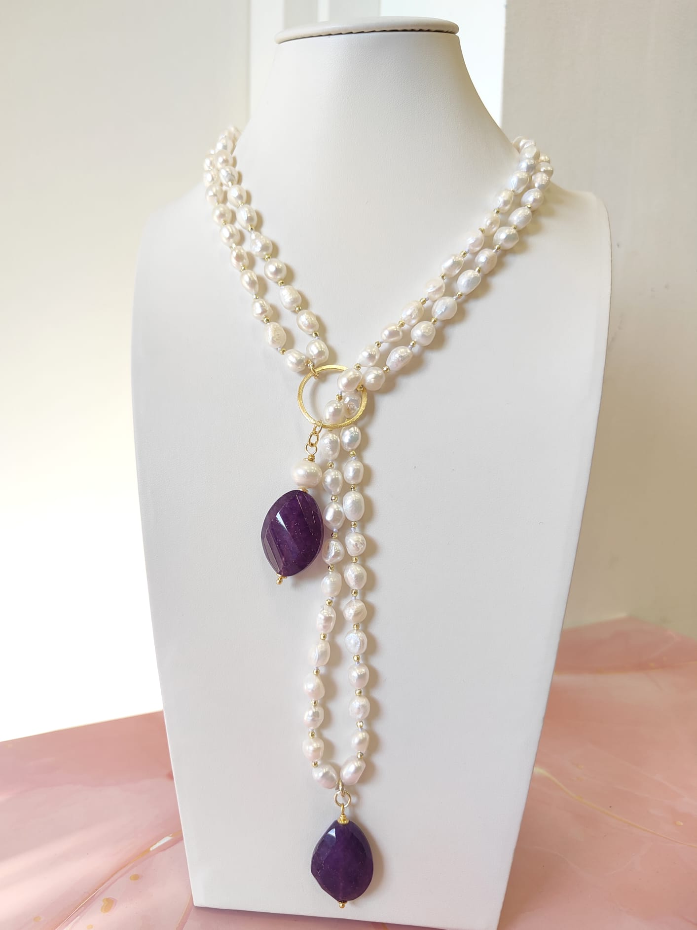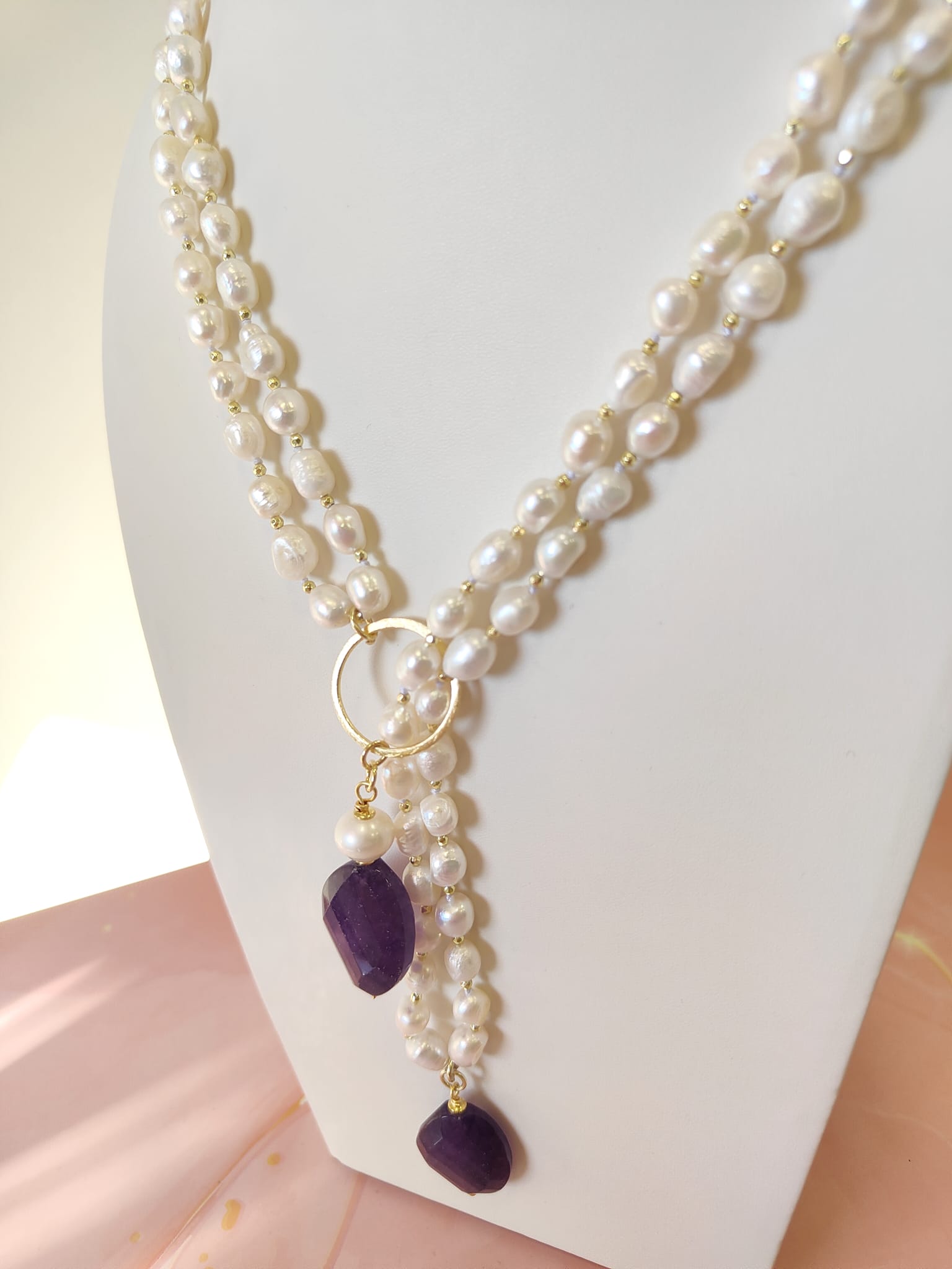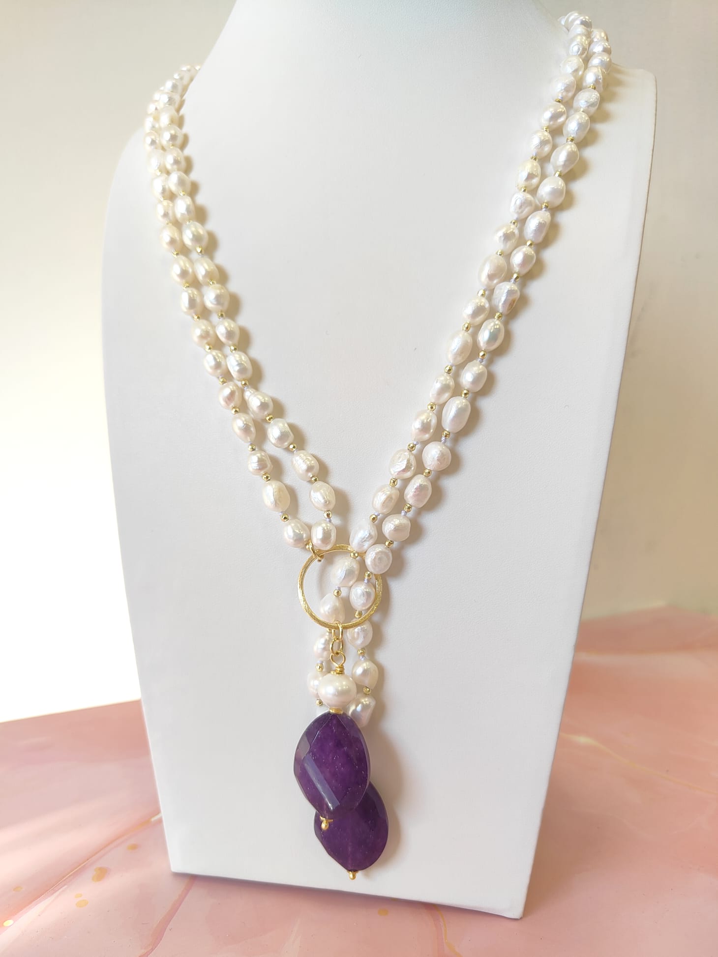La collana perle e ametista è un gioiello raffinato e scenografico, pensato per chi ama accessori eleganti ma capaci di trasformarsi. Fin dal primo sguardo, il doppio filo di perle naturali colpisce per la sua luminosità morbida e avvolgente. Allo stesso tempo, la disposizione irregolare delle perle racconta il valore della lavorazione artigianale.