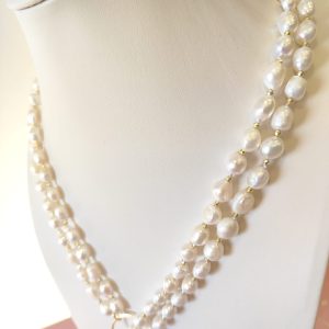 I due fili scorrono paralleli e sono intervallati da piccoli elementi in ematite dorata. In questo modo, la luce viene riflessa con delicatezza e continuità. Inoltre, il contrasto tra il bianco perlato e le note dorate dona profondità visiva, rendendo la collana armoniosa e mai eccessiva. Ogni perla presenta leggere differenze, che ne sottolineano l’autenticità e il carattere unico.