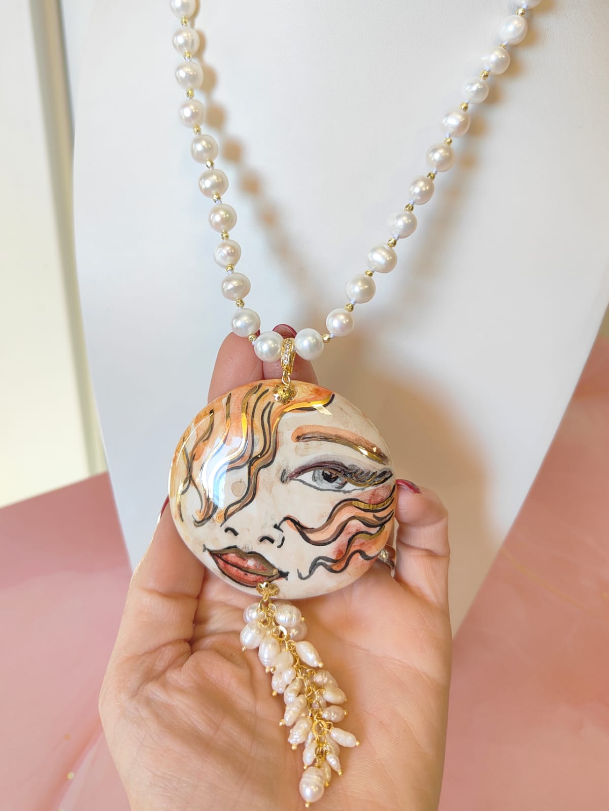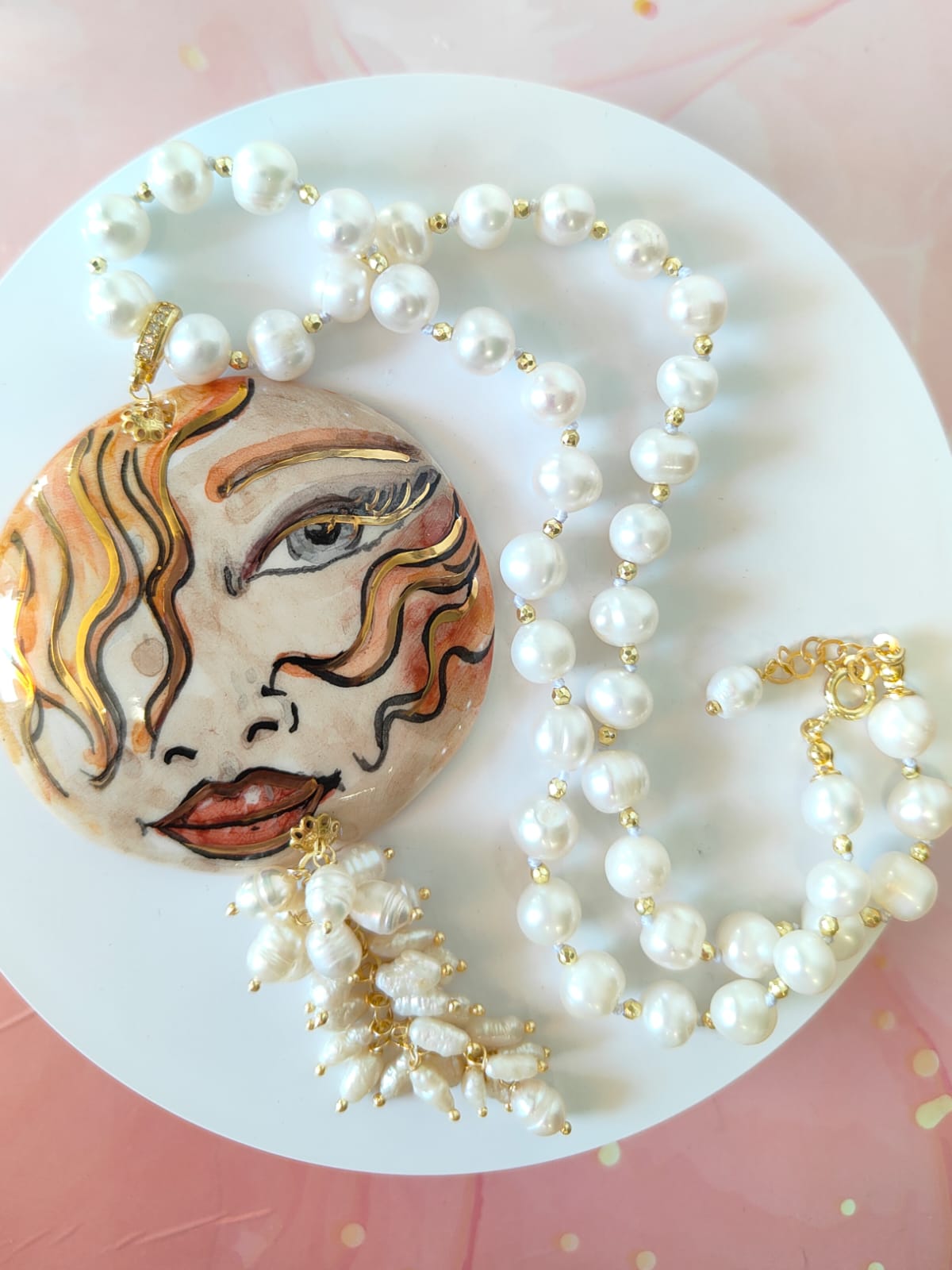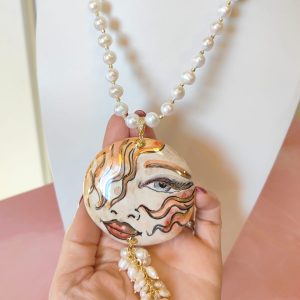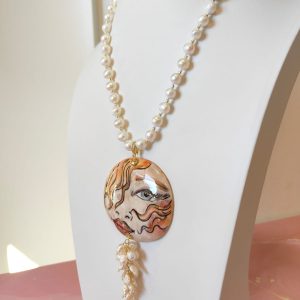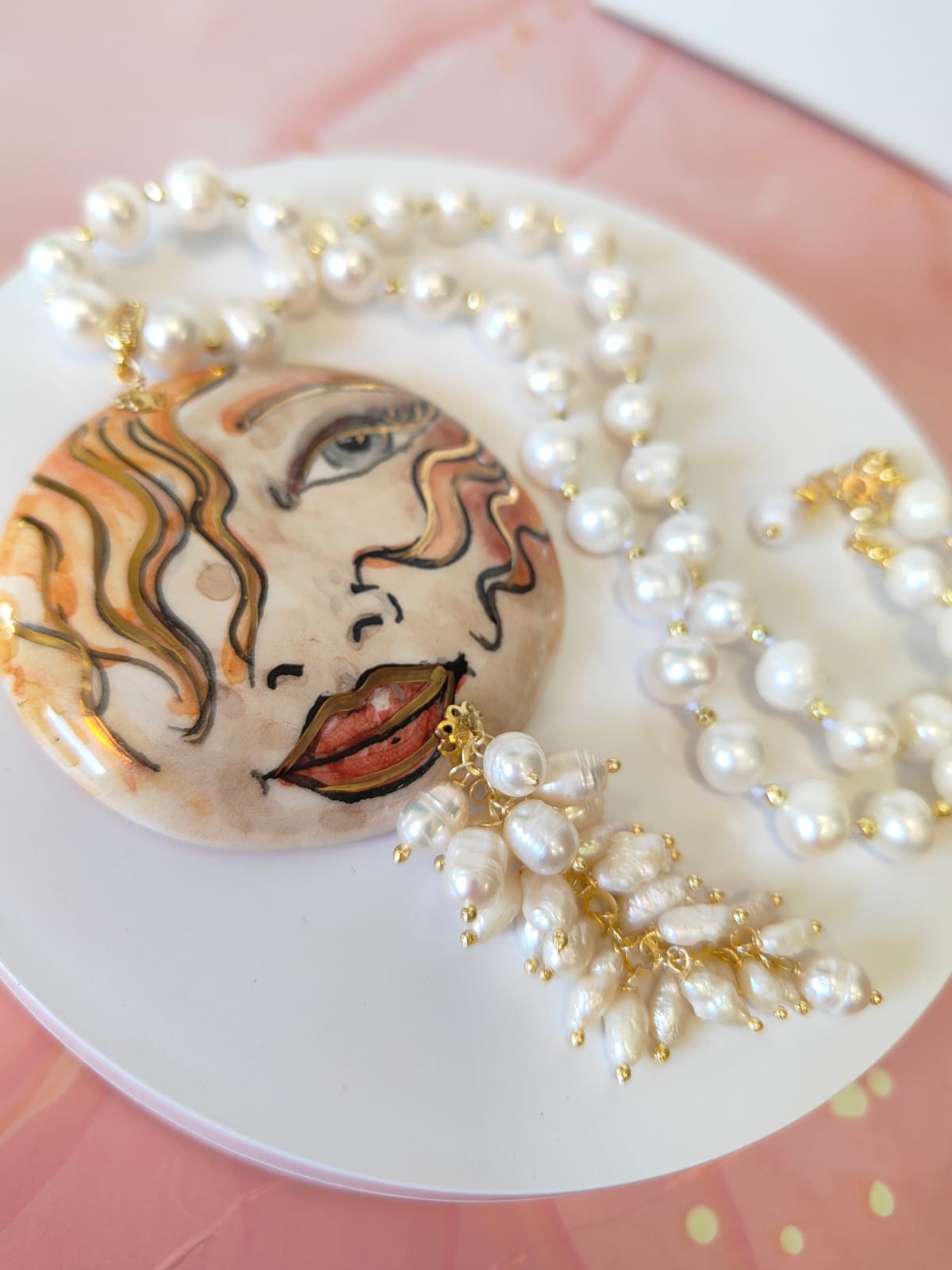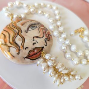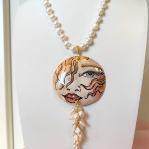 Al centro, il grande ciondolo in ceramica dipinta a mano diventa protagonista assoluto: un volto femminile dai tratti intensi e sognanti, definito da pennellate calde e dettagli dorati che donano movimento e personalità. È un ciondolo che sembra un piccolo dipinto da indossare, capace di trasformare anche l’outfit più semplice in qualcosa di ricercato e unico. A completare la scena, un elegante grappolo di perle che scende sotto il ciondolo, creando movimento, volume e un raffinato gioco di luce ad ogni passo.