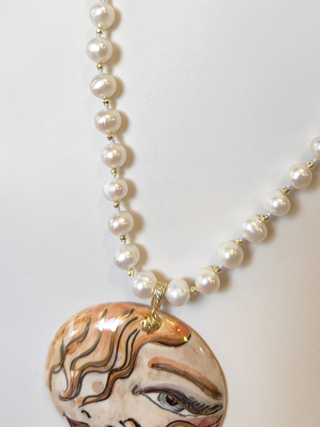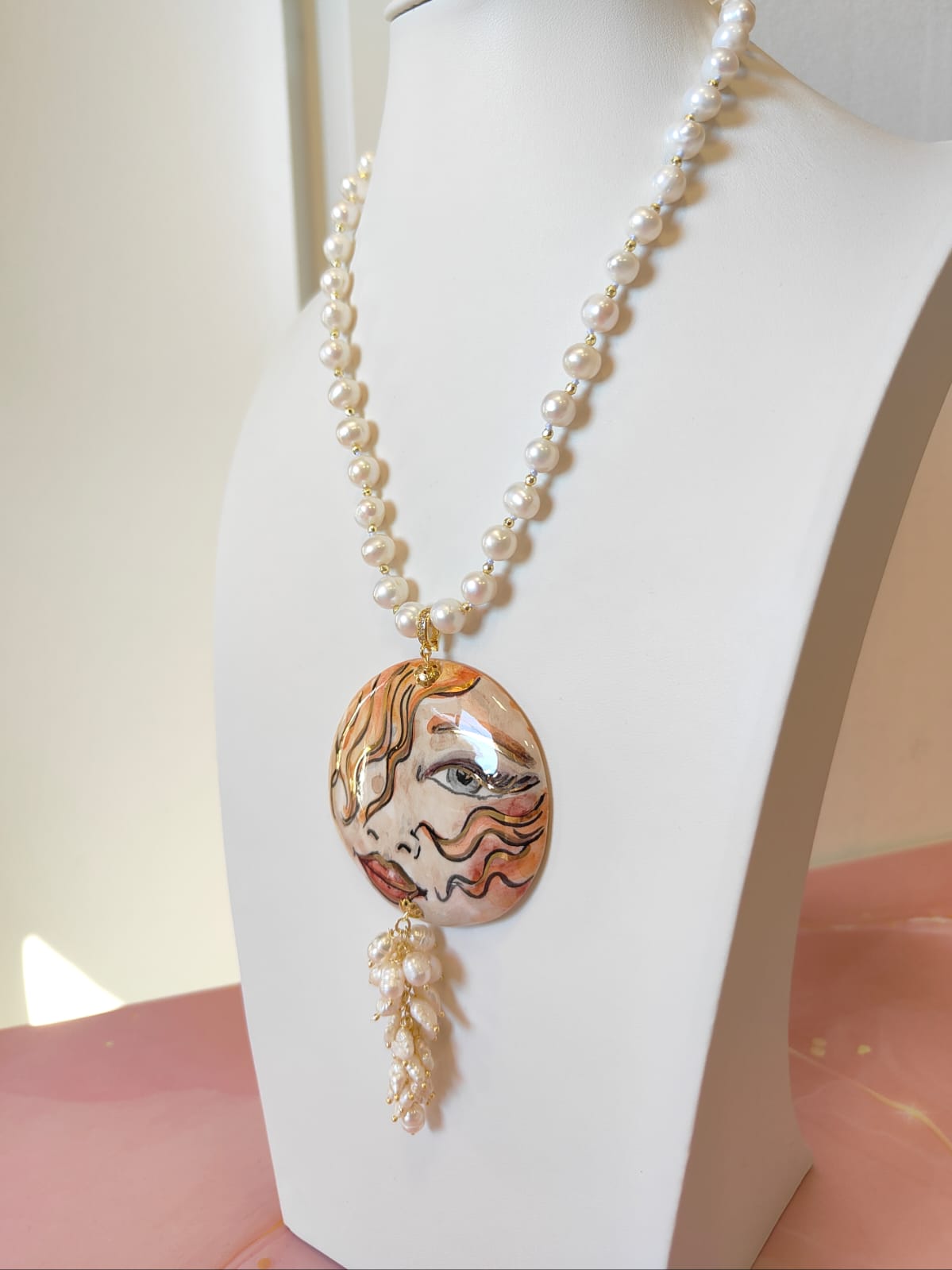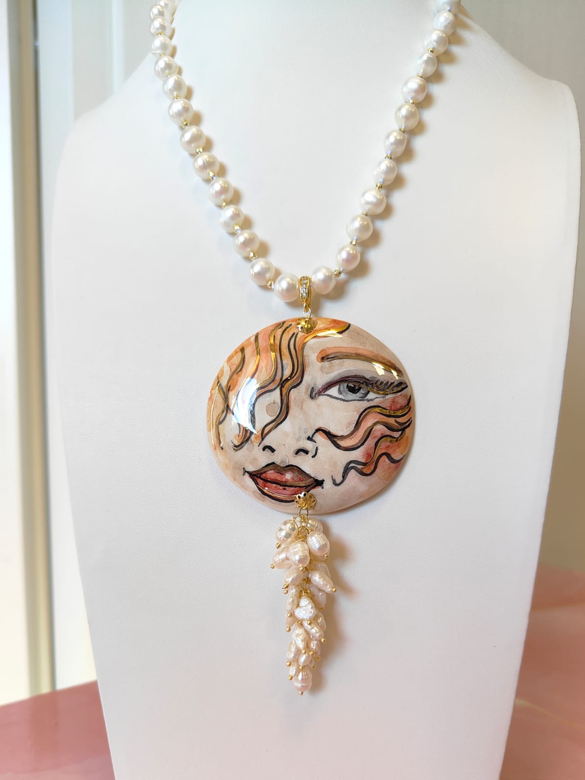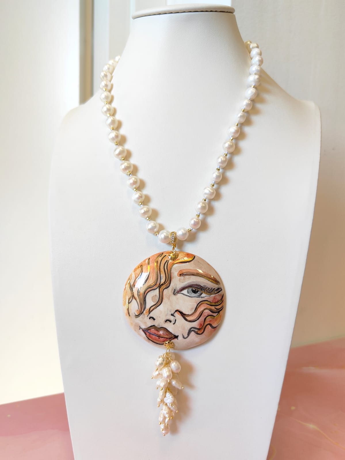 Al centro, il grande ciondolo in ceramica dipinta a mano diventa protagonista assoluto: un volto femminile dai tratti intensi e sognanti, definito da pennellate calde e dettagli dorati che donano movimento e personalità. È un ciondolo che sembra un piccolo dipinto da indossare, capace di trasformare anche l’outfit più semplice in qualcosa di ricercato e unico. A completare la scena, un elegante grappolo di perle che scende sotto il ciondolo, creando movimento, volume e un raffinato gioco di luce ad ogni passo.