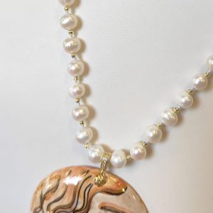 La collana perle e ceramica dipinta nasce per chi ama indossare un gioiello che racconti qualcosa: un dettaglio che non si limita a brillare, ma che parla attraverso forme, colori e piccoli contrasti preziosi. Le perle, con la loro luminosità morbida e naturale, creano una linea elegante e senza tempo, mentre i delicati inserti in ematite dorata aggiungono una nota calda e sofisticata, come un filo di luce che accompagna lo sguardo lungo tutta la collana.