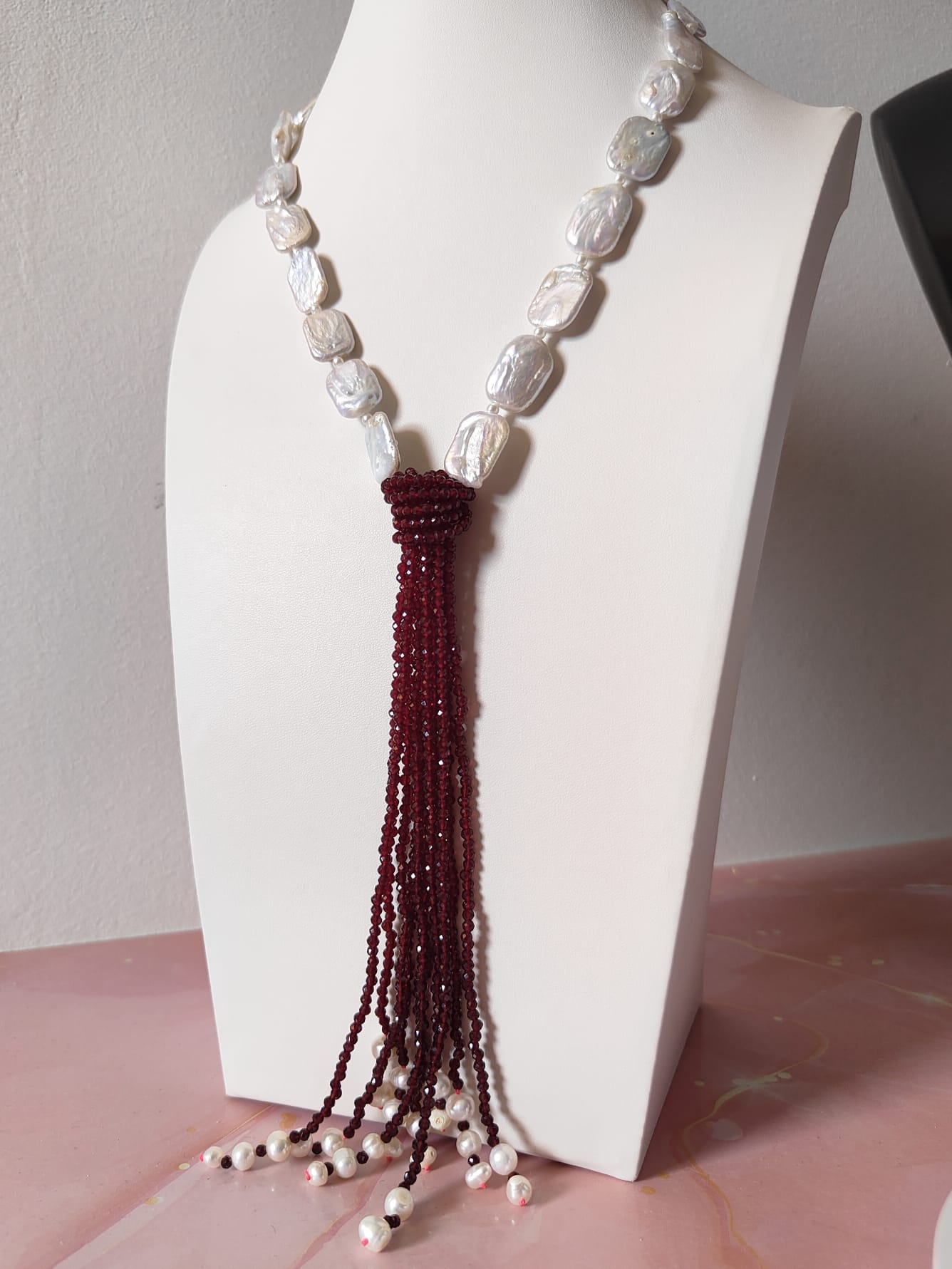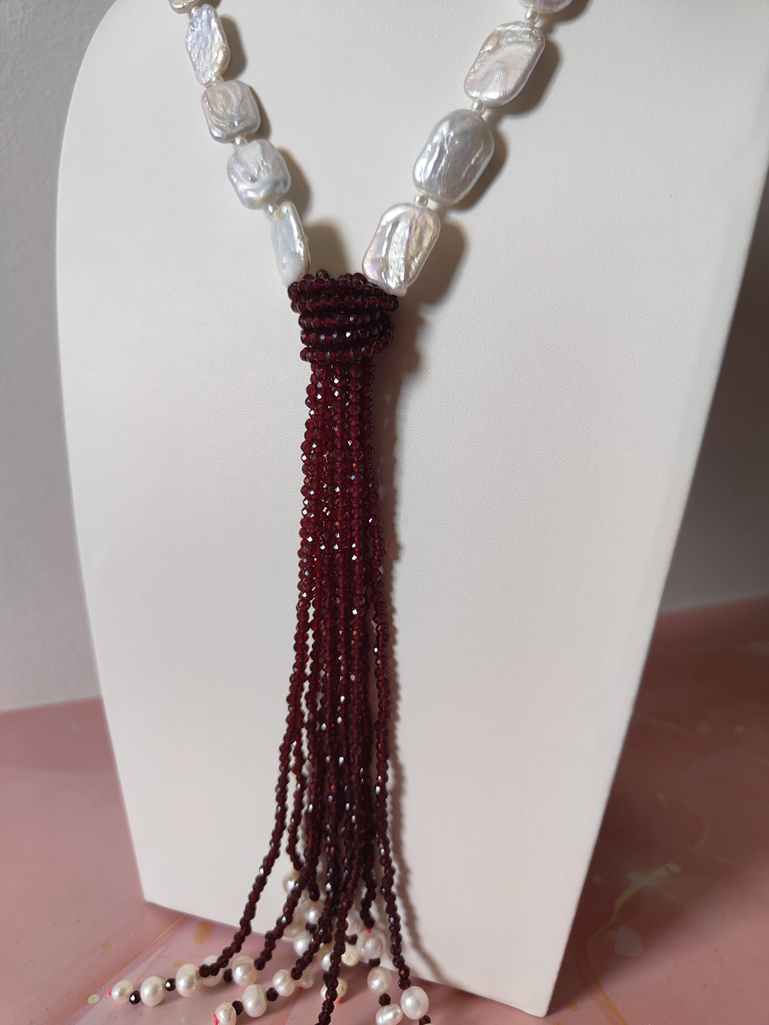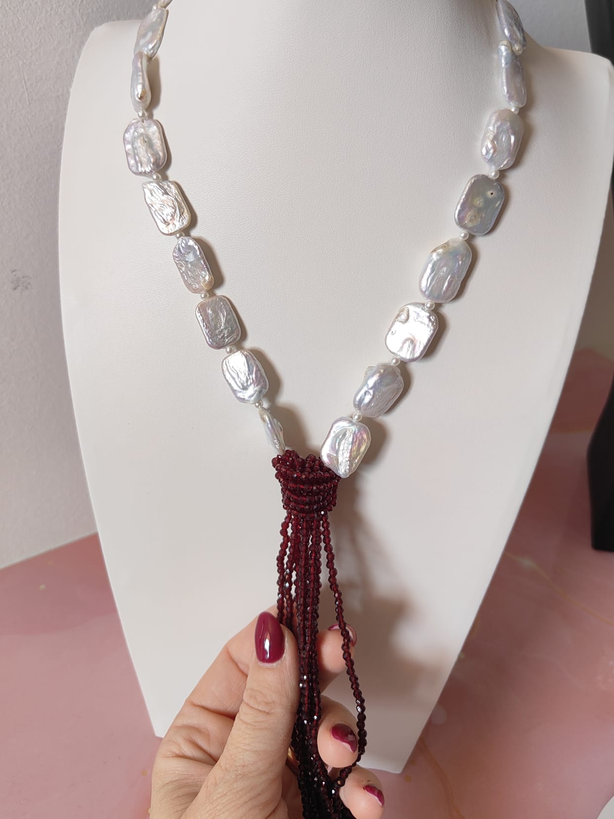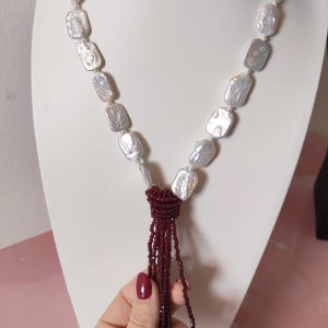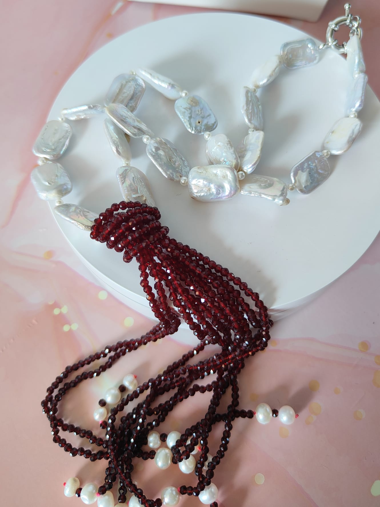 Le perle naturali, con la loro superficie irregolare e le sfumature madreperlacee, diffondono una luminosità delicata e raffinata. Ogni perla è selezionata con attenzione, rendendo ogni collana diversa e irripetibile. Il contrasto con i cristalli bordeaux, intensi e vibranti, dona profondità e carattere, creando un equilibrio armonico tra classicità e modernità.