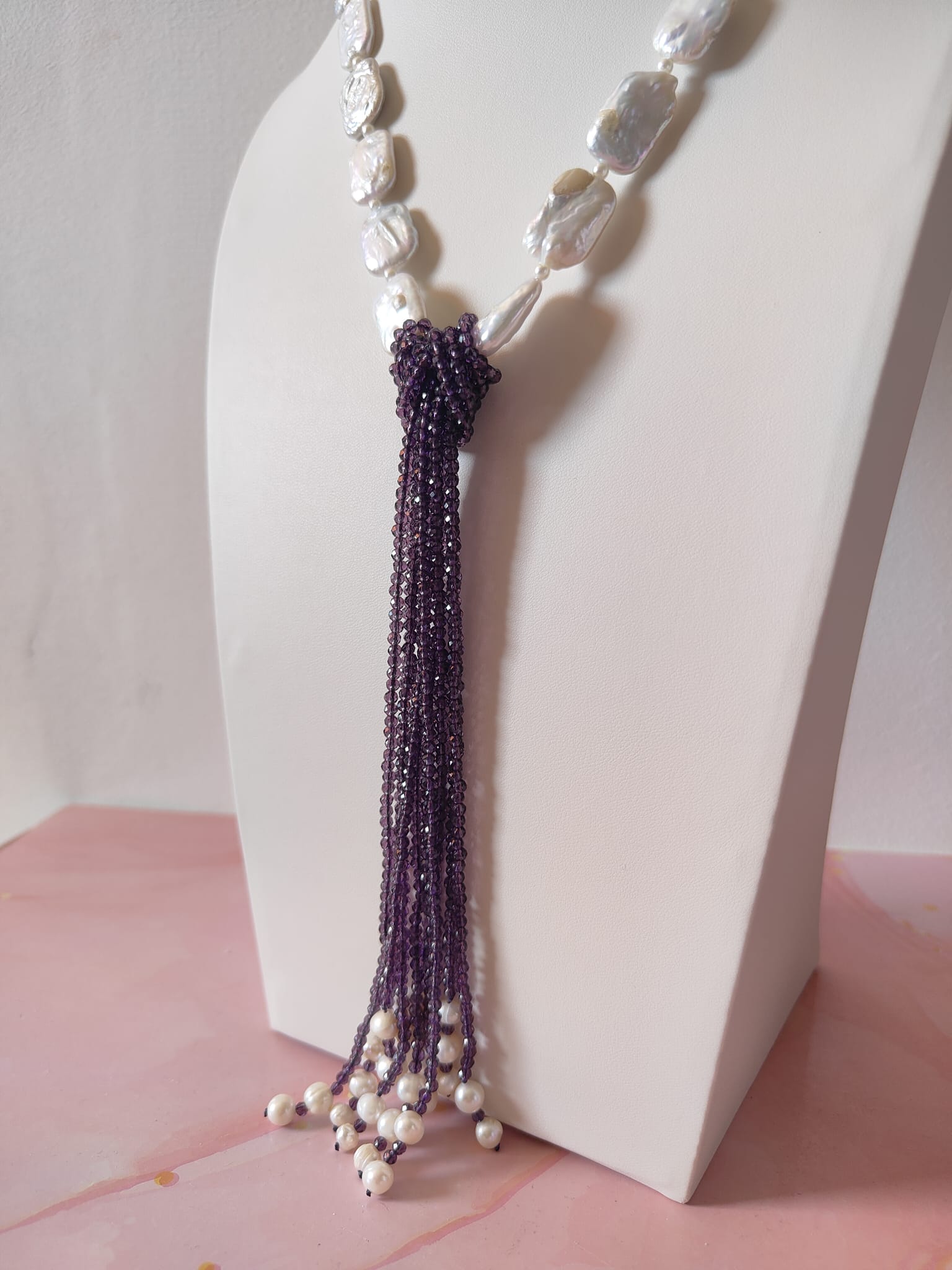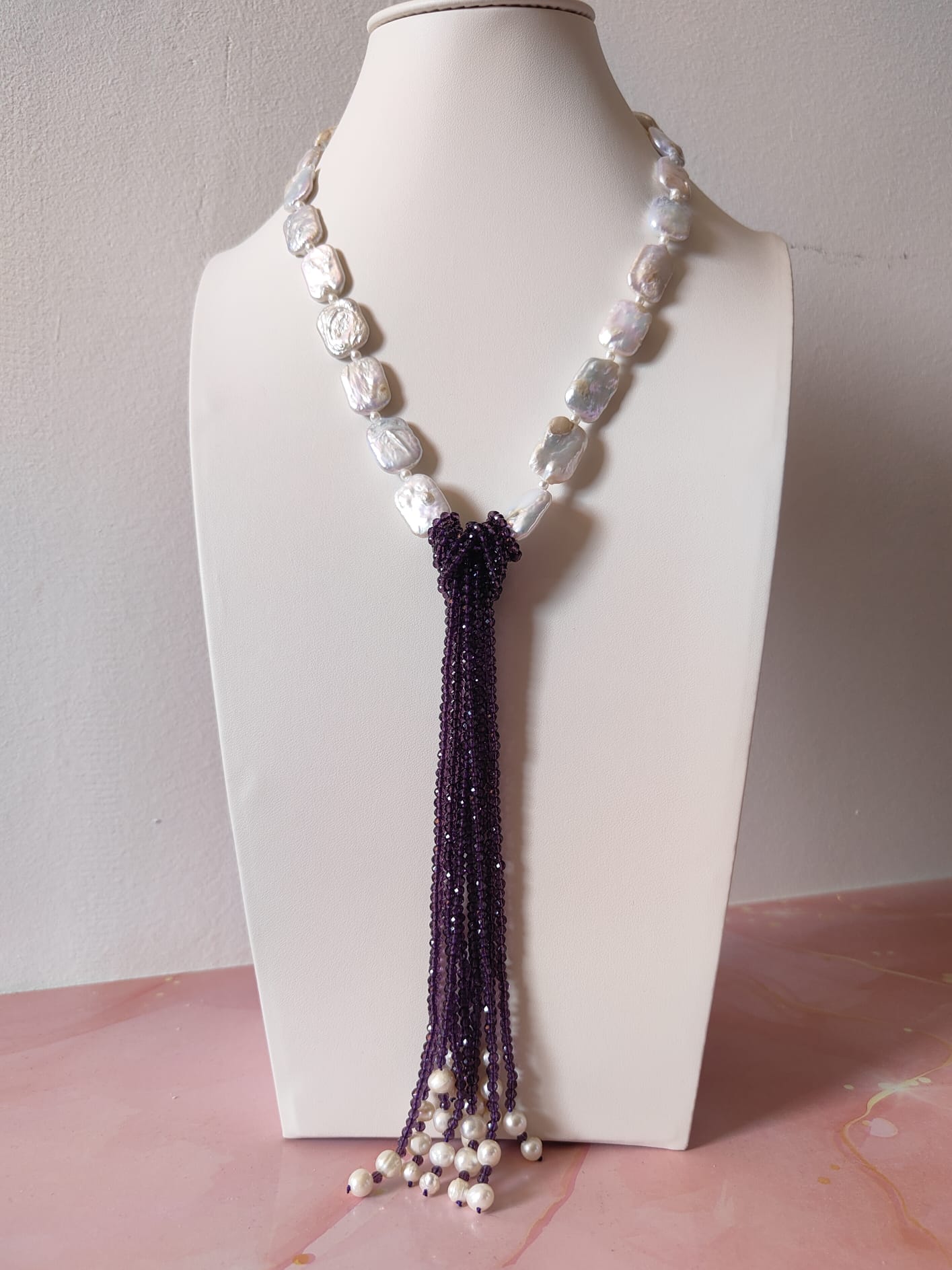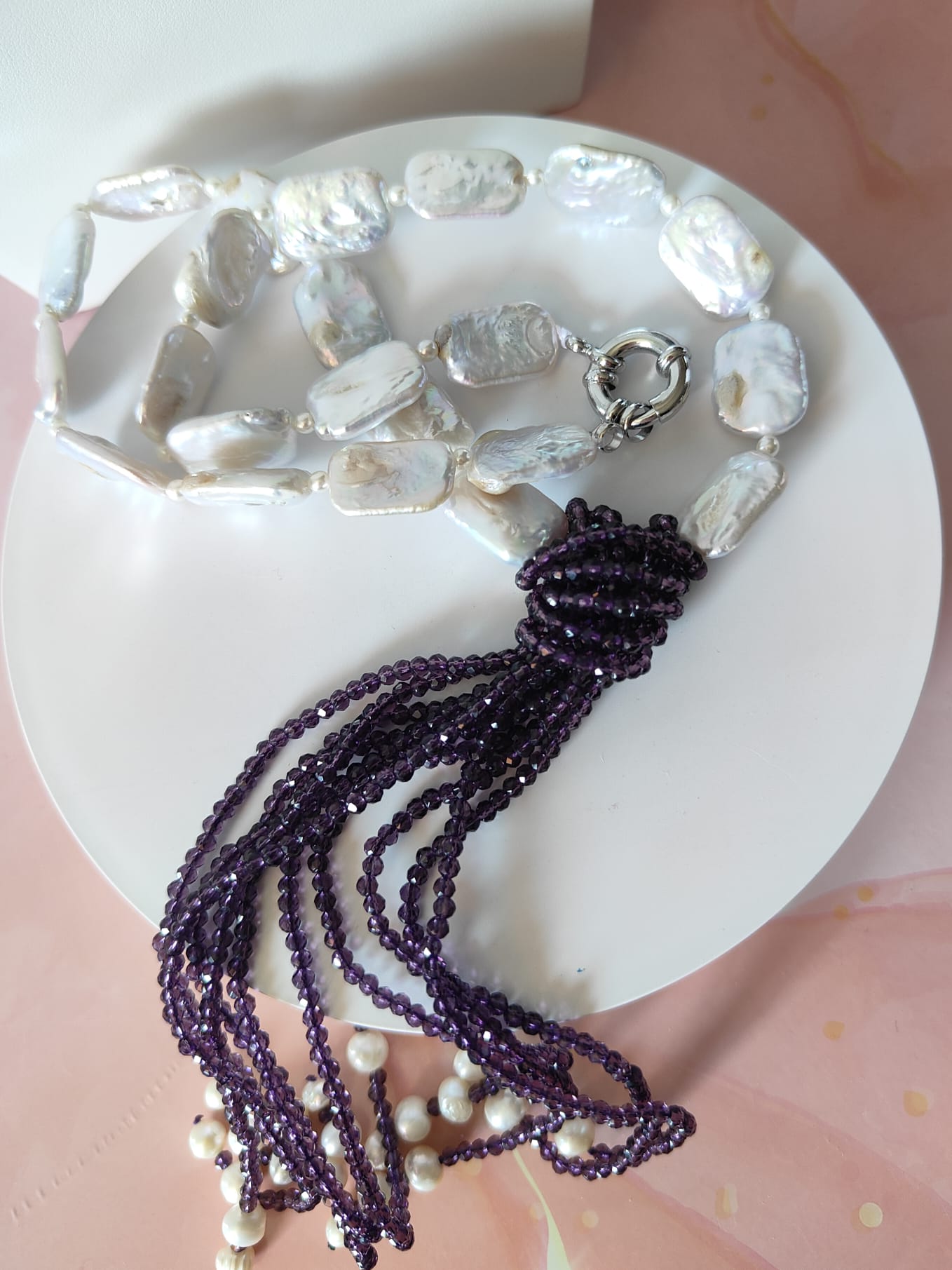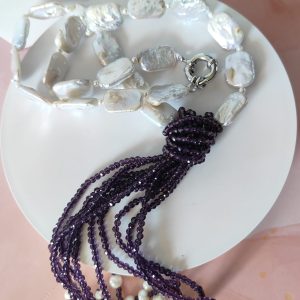 Materiali: perle naturali irregolari, cristalli viola sfaccettati, acciaio