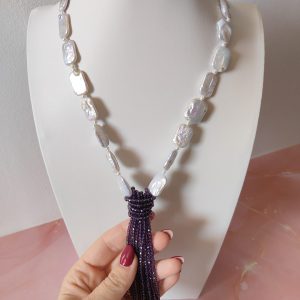La collana perle e cristalli viola è una creazione unica che unisce eleganza e personalità in un perfetto equilibrio di forme e colori. Il bianco iridescente delle perle naturali si fonde con l’intensità vellutata dei cristalli viola, dando vita a un gioiello che cattura lo sguardo e riflette la luce con grazia.