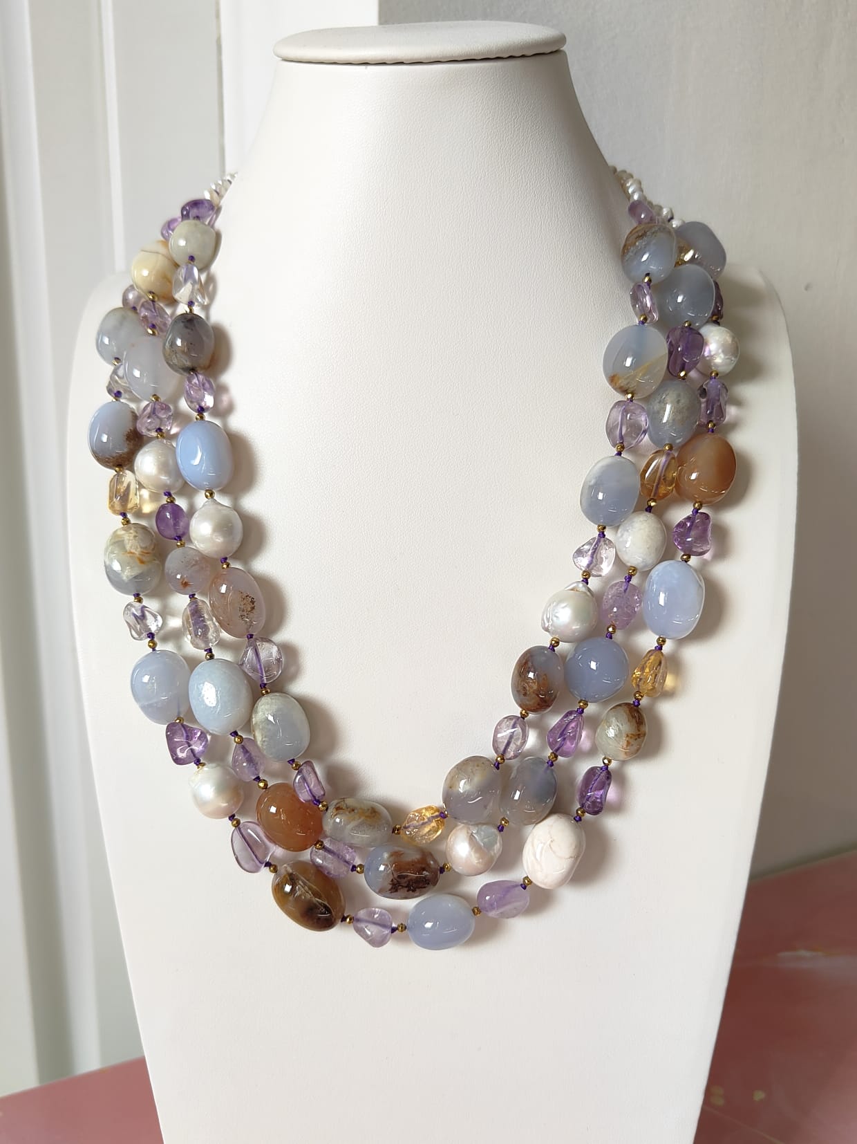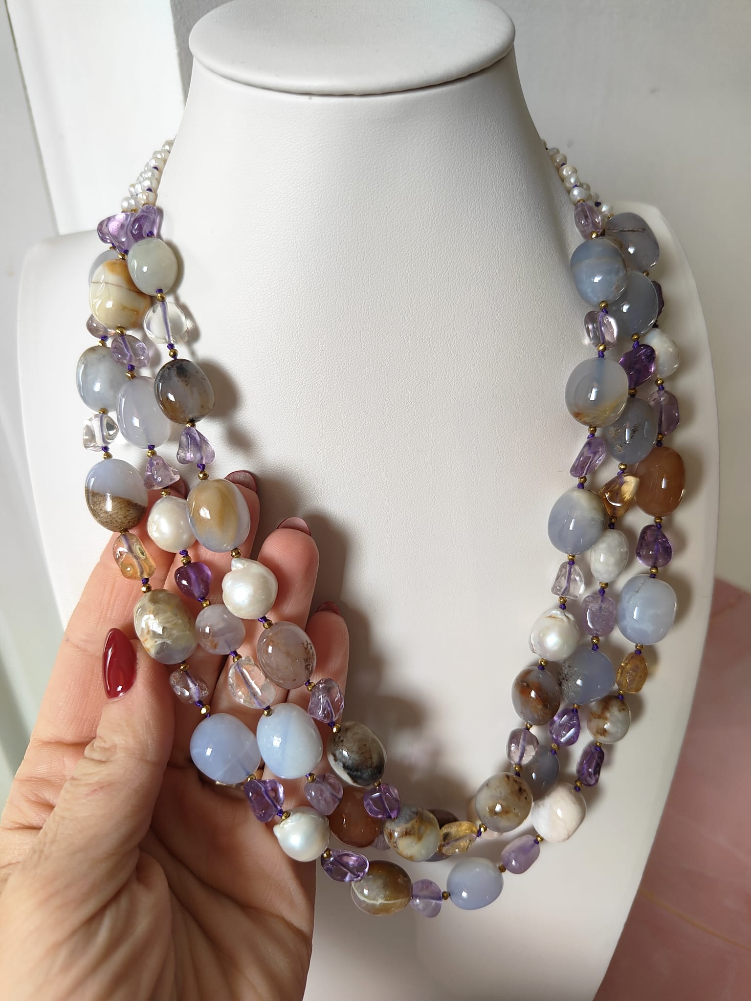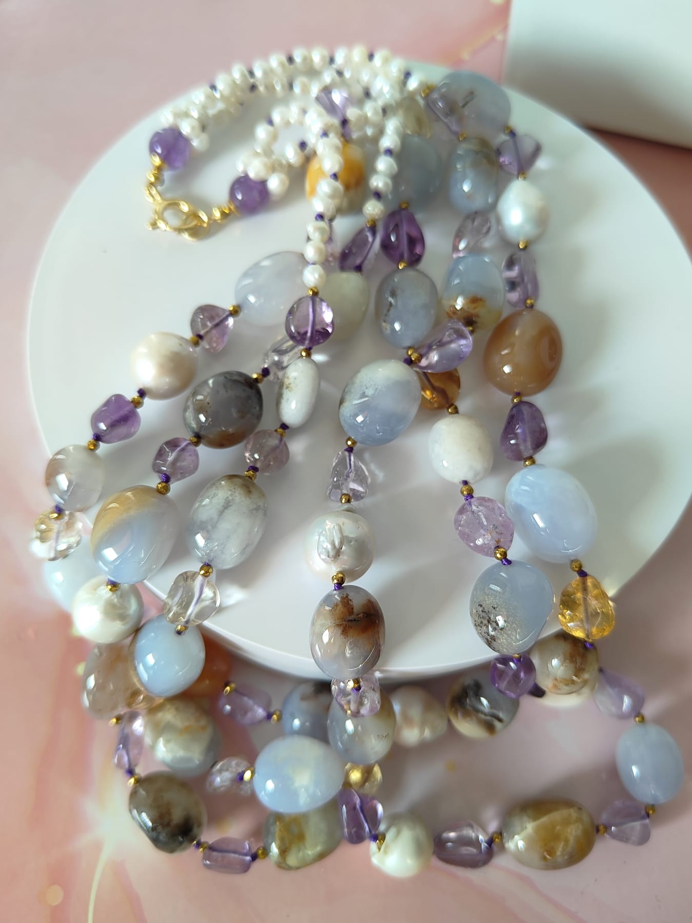 Il protagonista è il calcedonio, riconoscibile dalle sue sfumature azzurro-lattee e dal carattere morbido e vellutato, affiancato da ametiste dai toni lavanda, quarzo citrino dalle note dorate, agata naturale con venature terrose e perle d’acqua dolce dalla lucentezza cremosa. Ogni pietra porta con sé un disegno irripetibile, una piccola storia minerale che rende l’insieme ancora più ricco di fascino.