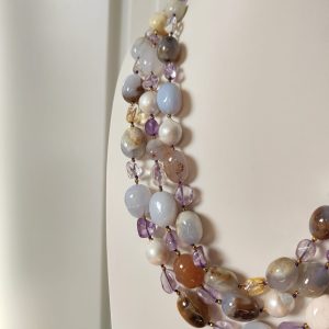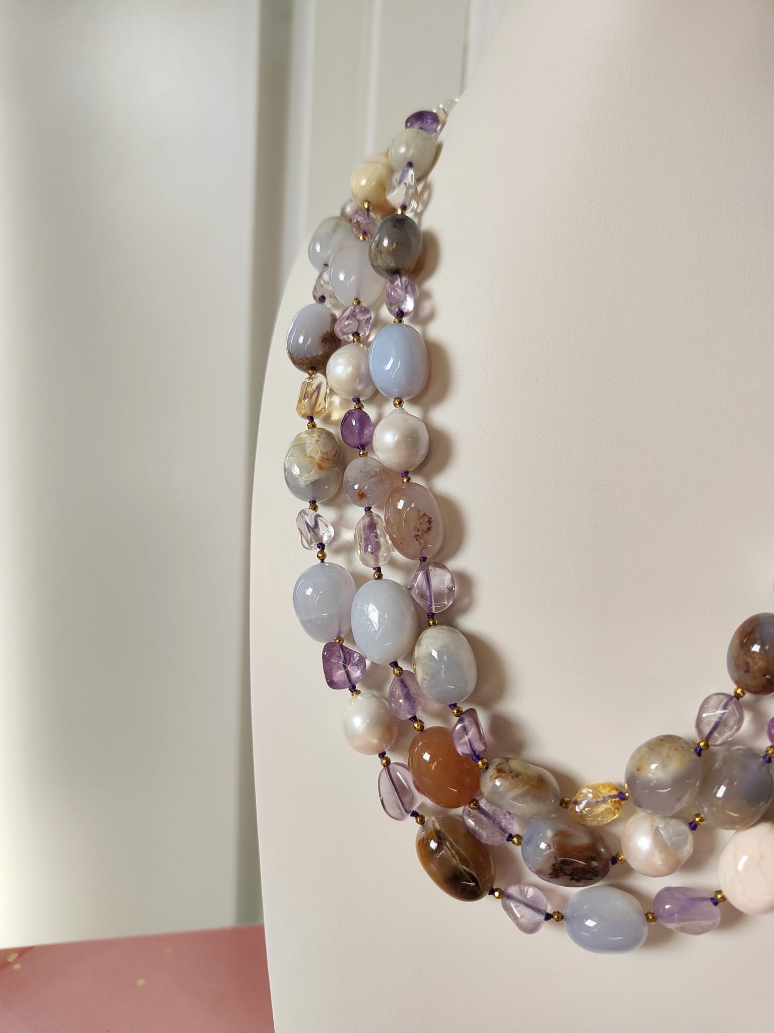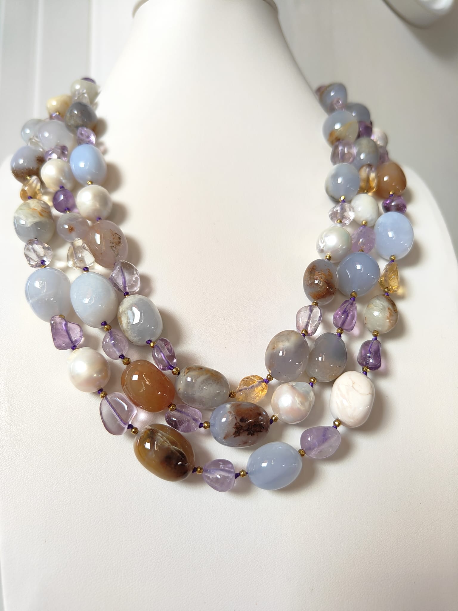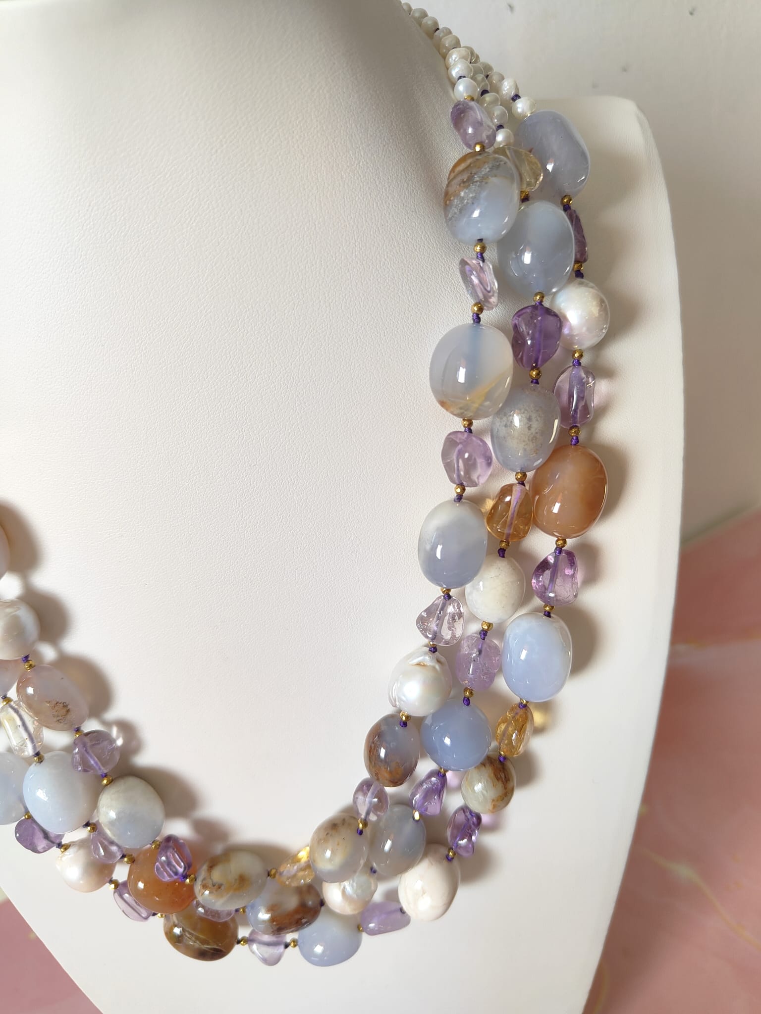 Il protagonista è il calcedonio, riconoscibile dalle sue sfumature azzurro-lattee e dal carattere morbido e vellutato, affiancato da ametiste dai toni lavanda, quarzo citrino dalle note dorate, agata naturale con venature terrose e perle d’acqua dolce dalla lucentezza cremosa. Ogni pietra porta con sé un disegno irripetibile, una piccola storia minerale che rende l’insieme ancora più ricco di fascino.