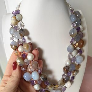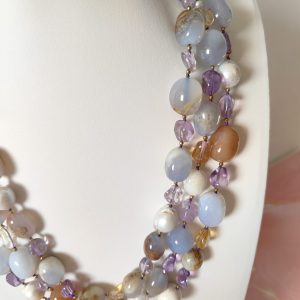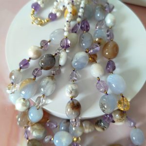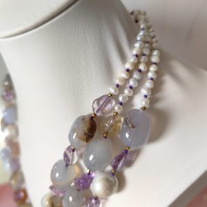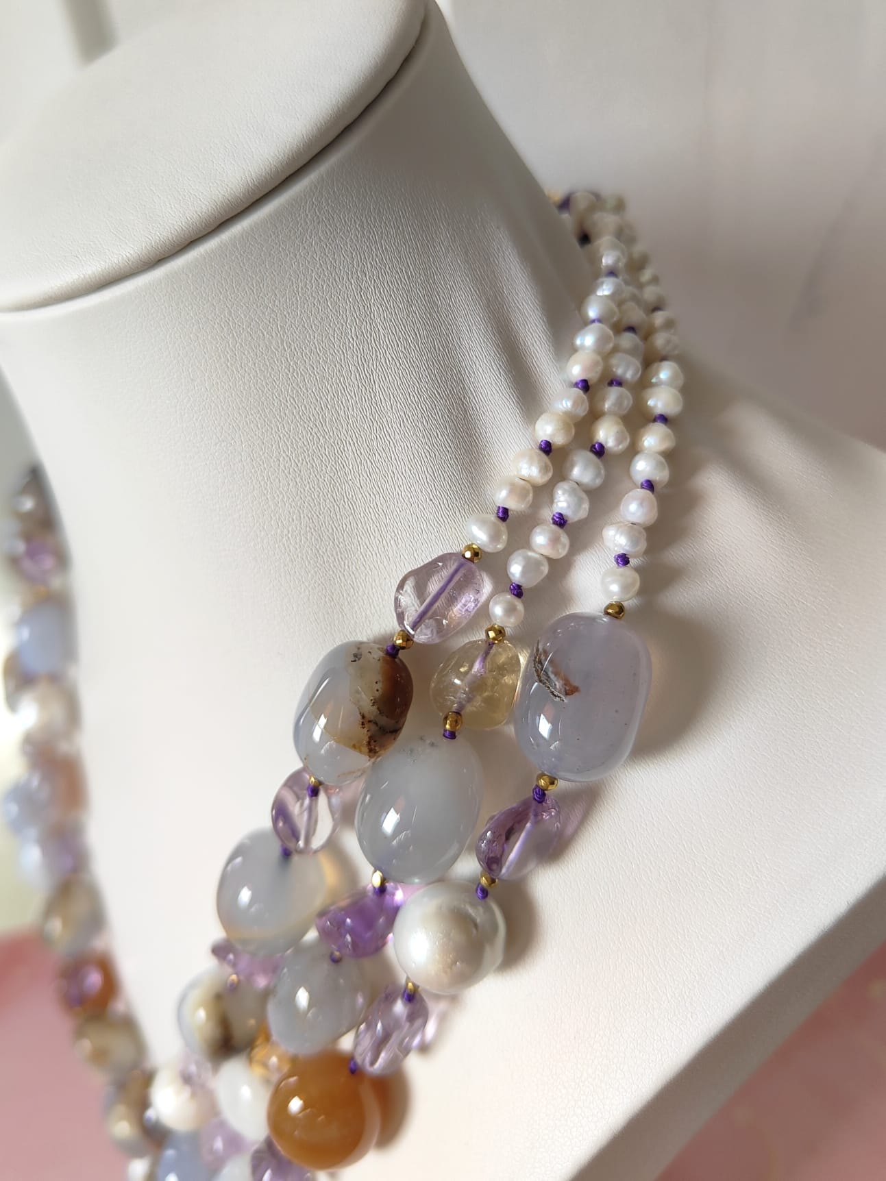 Materiali principali: calcedonio, ametista, quarzo citrino, agata naturale, perle d’acqua dolce