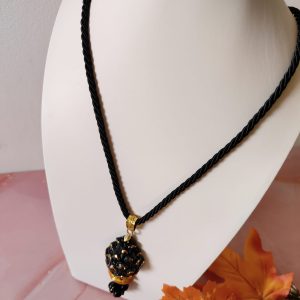 La collana è composta da un elegante cordoncino intrecciato nero, morbido ma resistente, che valorizza il pendente senza appesantirlo. Questa scelta di design conferisce un aspetto moderno e al tempo stesso tradizionale, permettendo al gioiello di adattarsi facilmente a diversi stili e occasioni. Inoltre, la chiusura in acciaio garantisce praticità e durata nel tempo.
