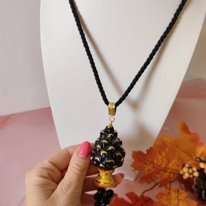 La collana pigna nera è un gioiello che racchiude fascino, tradizione e artigianato siciliano. La pigna, simbolo di abbondanza e prosperità, è qui realizzata in ceramica di Caltagirone e dipinta a mano con dettagli dorati che la rendono preziosa e unica. Il colore nero intenso, impreziosito da riflessi luminosi, dona al gioiello uno stile deciso e intramontabile.