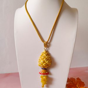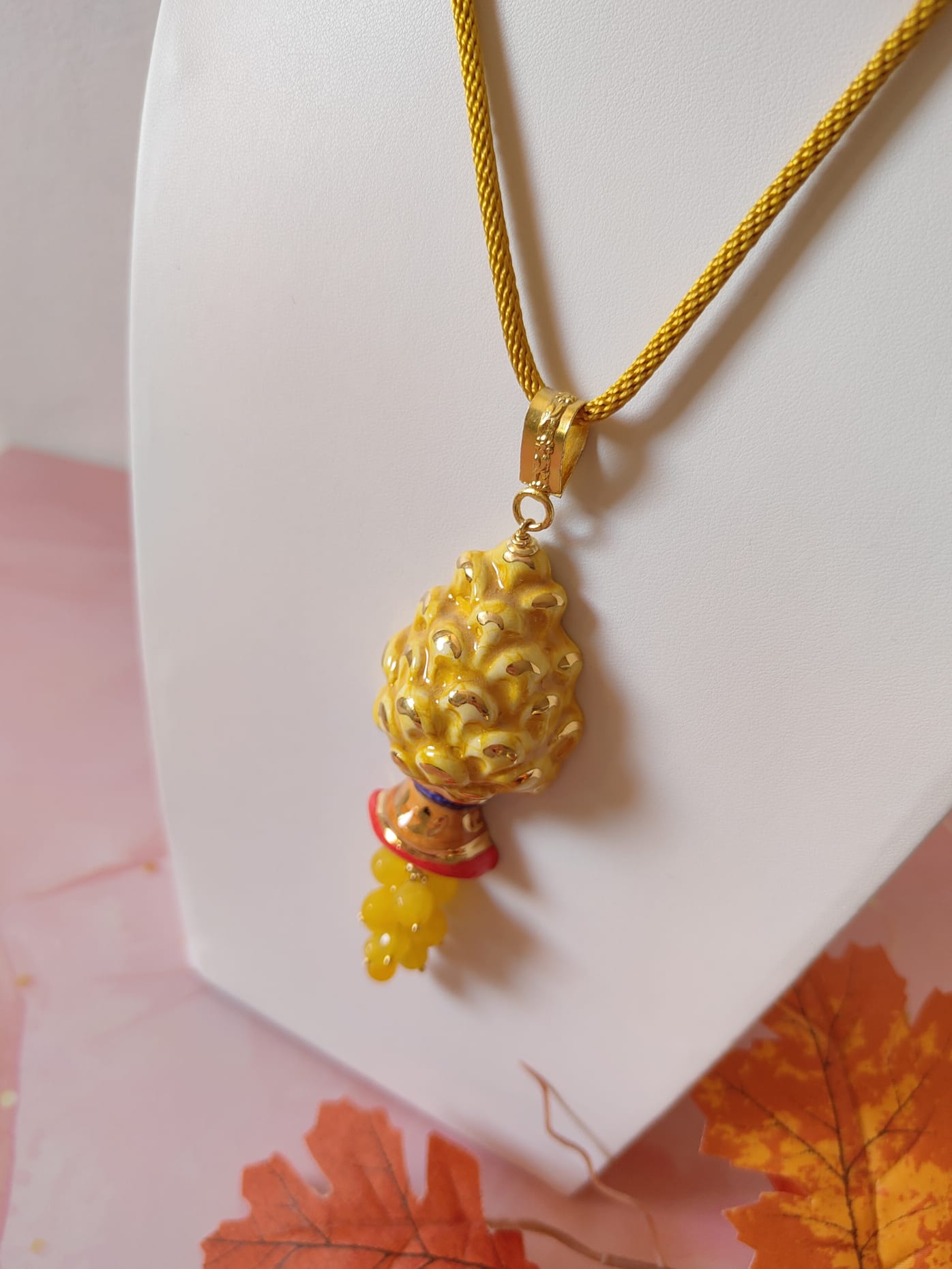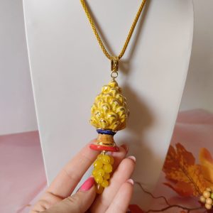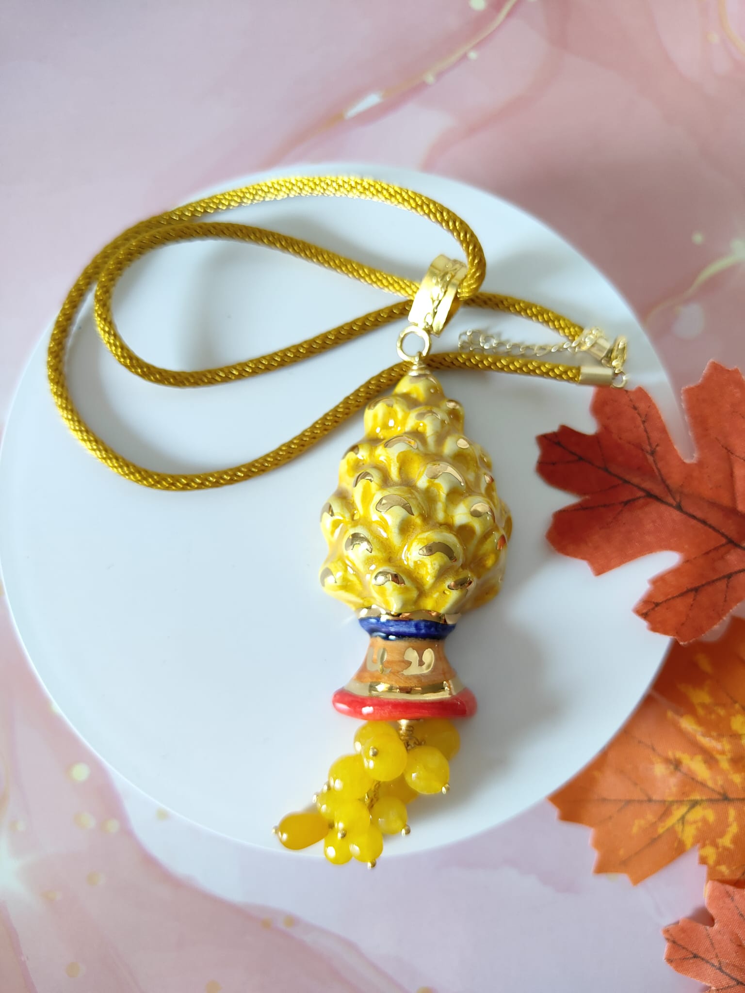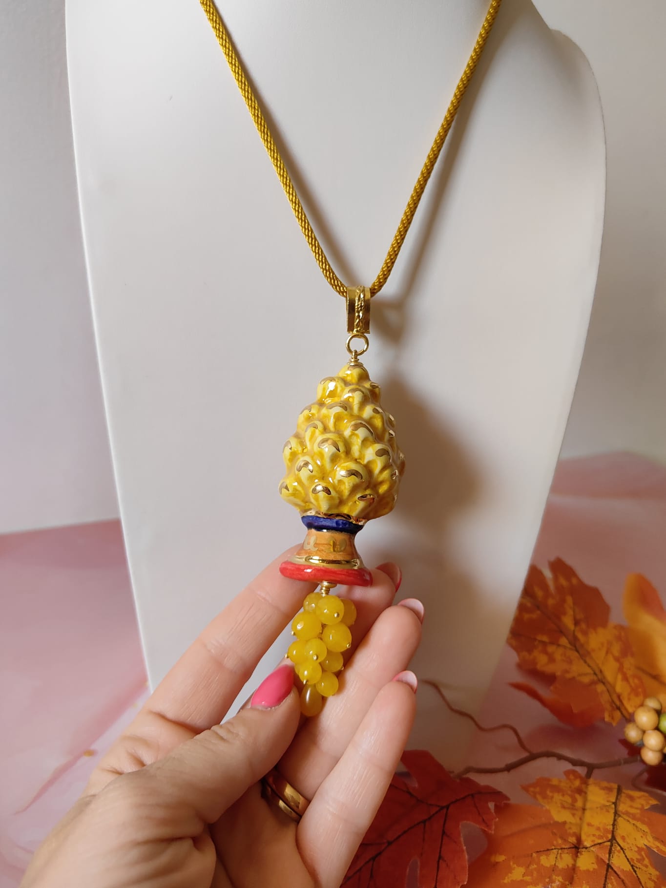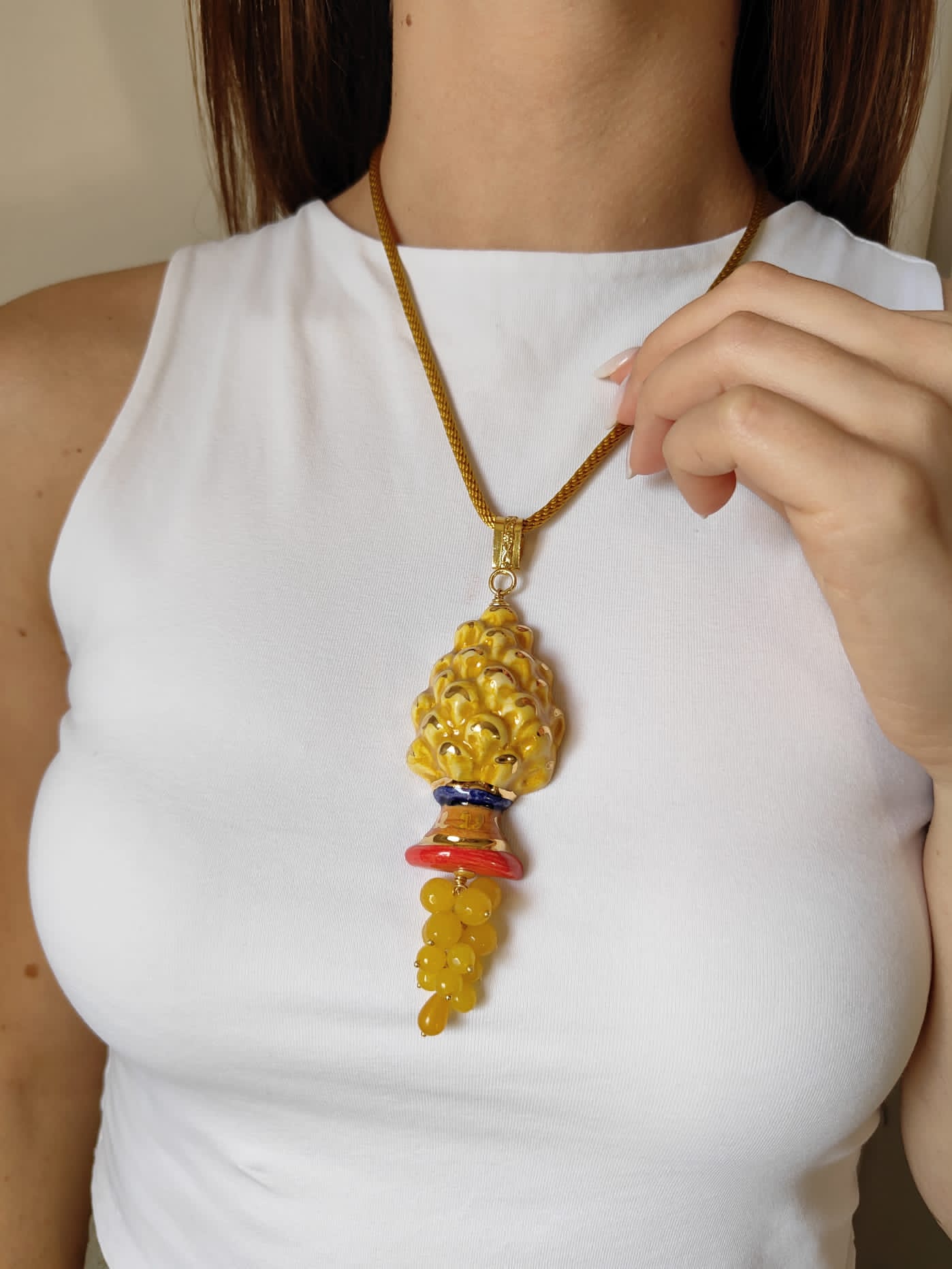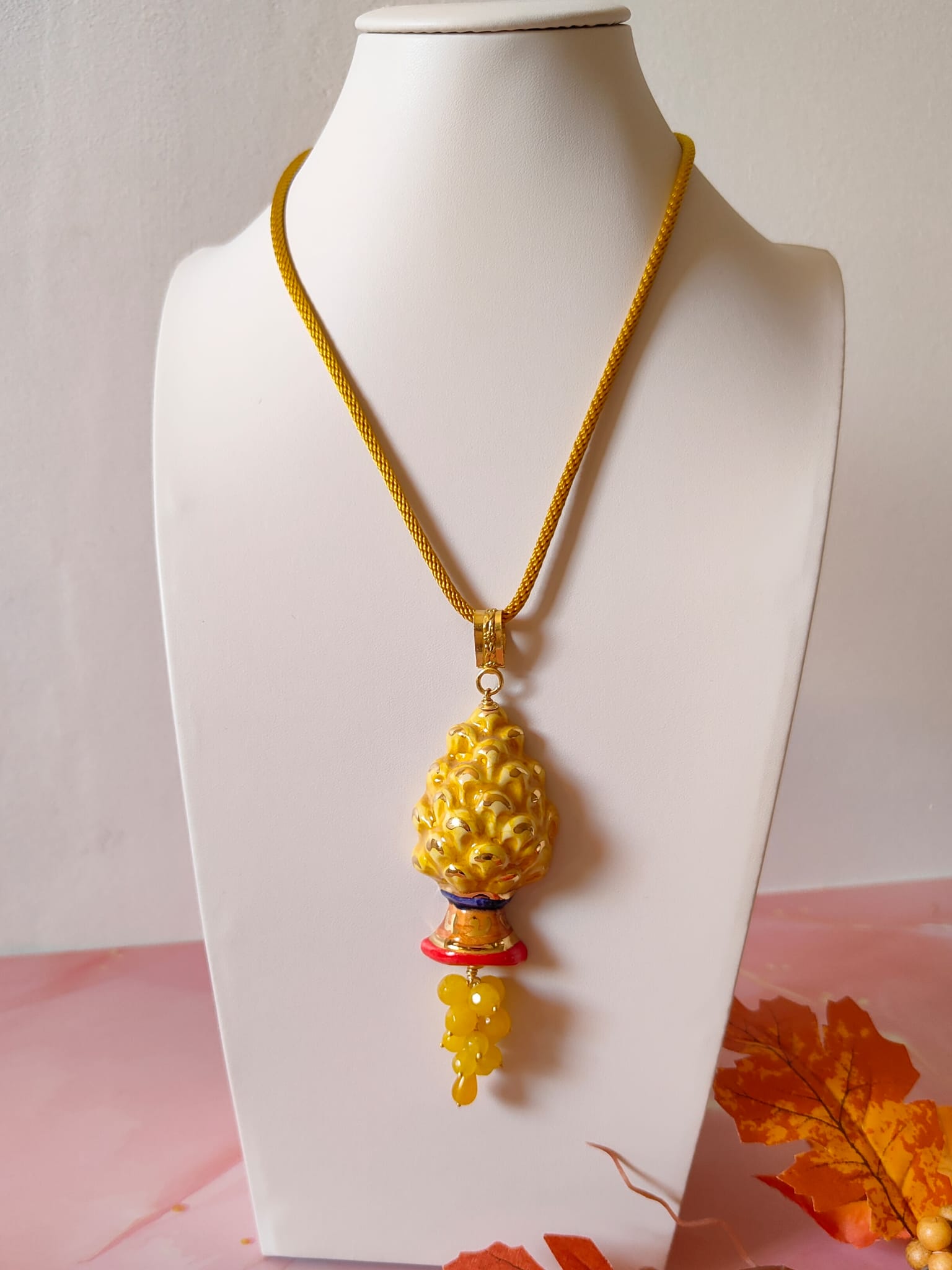 Il pendente è realizzato in ceramica di Caltagirone, plasmata e dipinta interamente a mano. La pigna, con la sua vivace tonalità gialla e dettagli smaltati, rappresenta l’energia del sole siciliano e l’abbondanza della natura mediterranea. Inoltre, ogni creazione artigianale è leggermente diversa dall’altra, perciò nessuna collana sarà mai identica a un’altra.