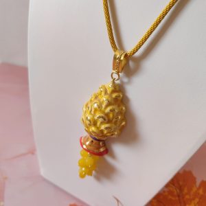 Alla base della ceramica pende un grappolo di giada gialla naturale, pietra che simboleggia gioia e vitalità. Le sfere lucenti creano movimento e brillantezza, arricchendo il ciondolo con un tocco raffinato e armonico. Così, la collana diventa un perfetto equilibrio tra tradizione e design contemporaneo.
