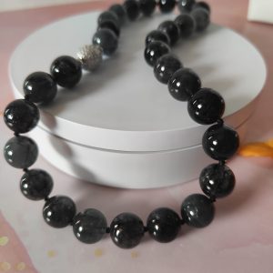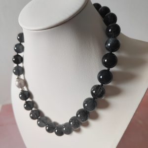 Indossata, la collana trasmette carattere e stile: le sfere scure, con le loro venature luminose, donano profondità e mistero, mentre la lucentezza dei zirconi introduce un contrasto sofisticato. Perfetta per chi ama distinguersi con dettagli ricercati, la collana si adatta sia a look eleganti da sera sia ad abbinamenti più quotidiani, conferendo sempre un tocco di unicità.