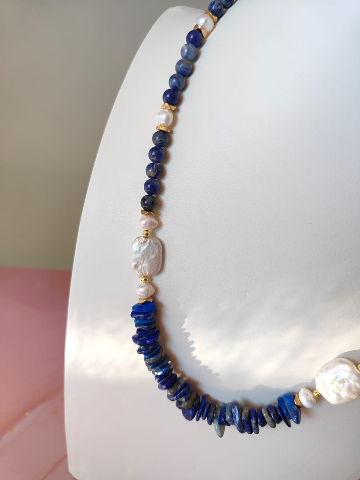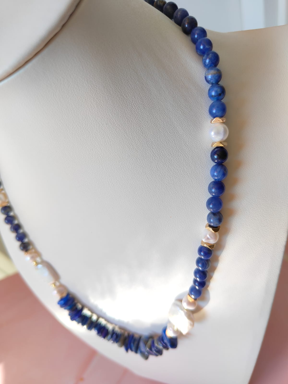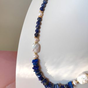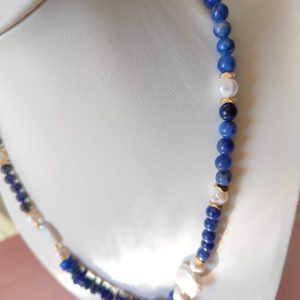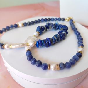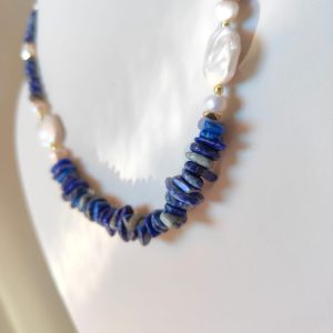 Questa collana può essere indossata con abiti semplici per aggiungere un dettaglio ricercato, oppure abbinata a capi scuri per amplificare il contrasto cromatico delle pietre blu. Perfetta anche in layering con collane dorate e accessori a tema marino.