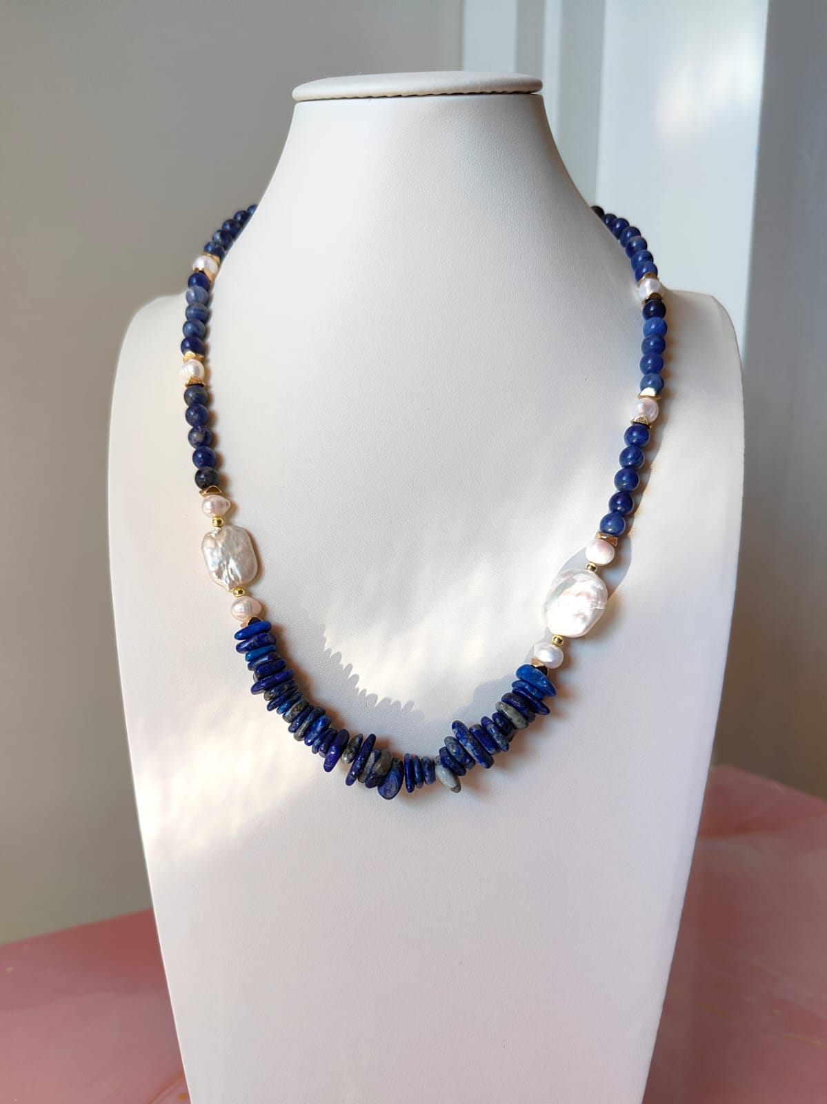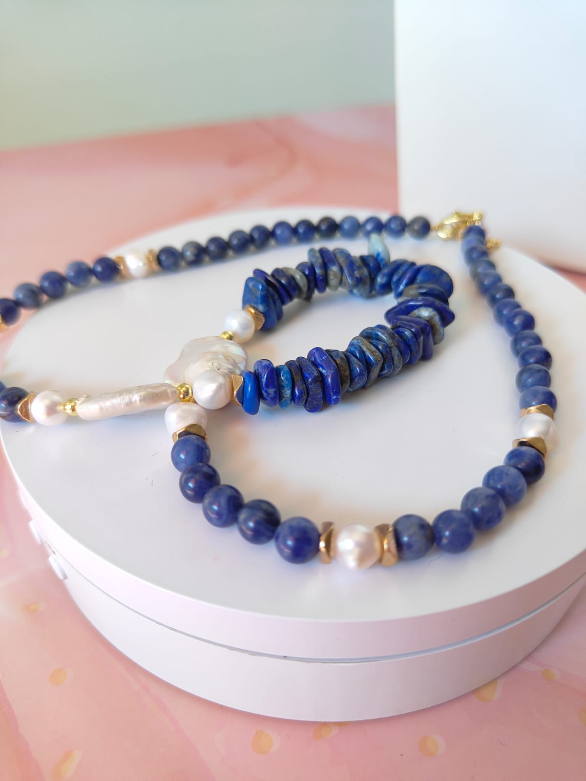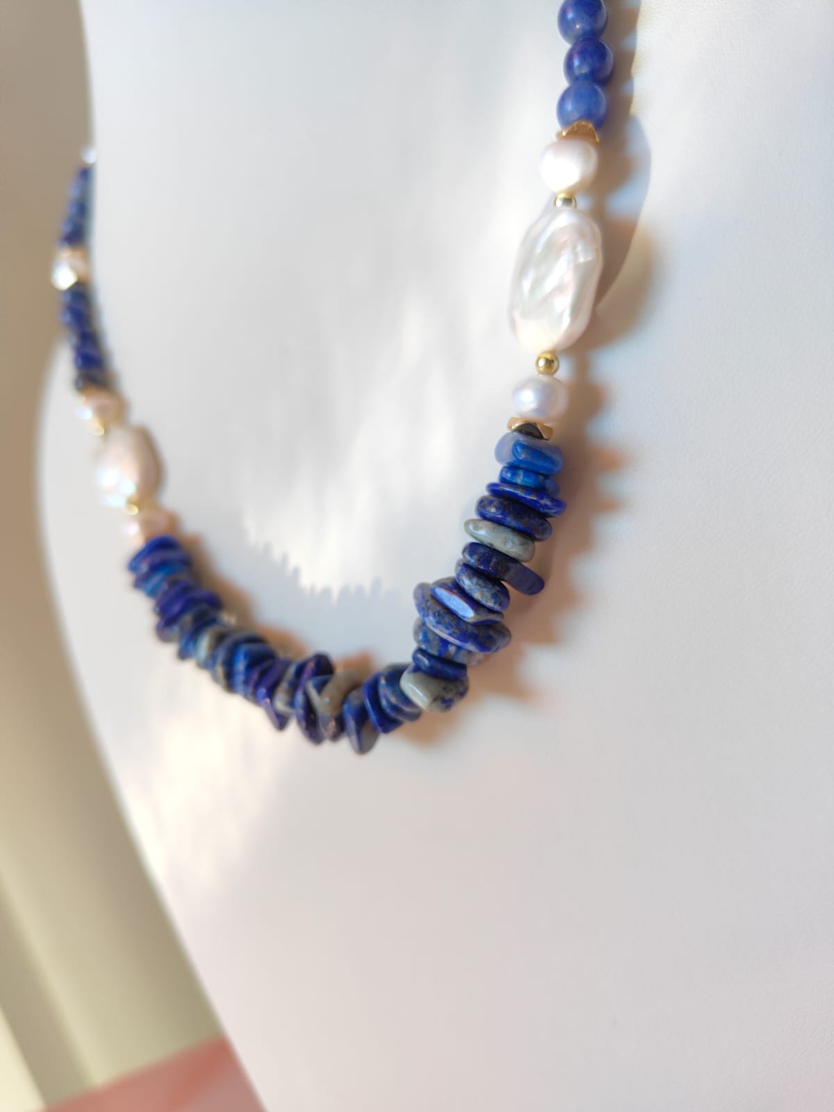 Questa collana può essere indossata con abiti semplici per aggiungere un dettaglio ricercato, oppure abbinata a capi scuri per amplificare il contrasto cromatico delle pietre blu. Perfetta anche in layering con collane dorate e accessori a tema marino.