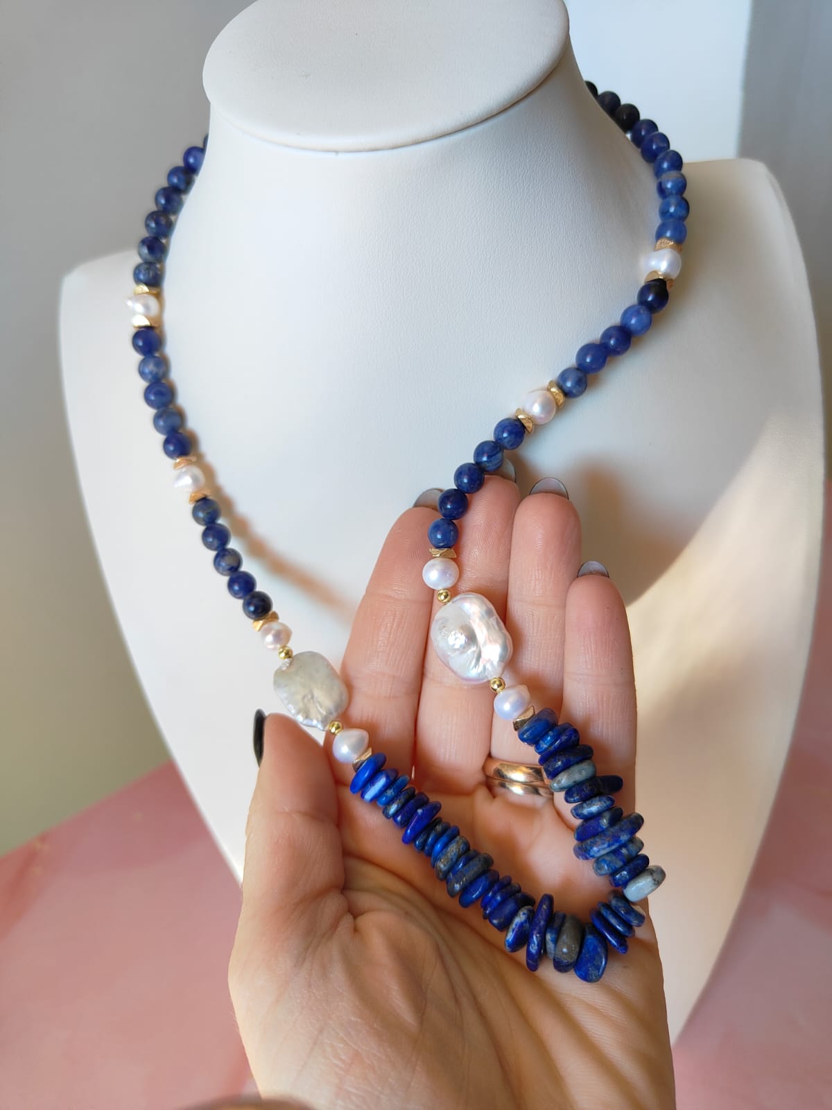 La Collana Sodalite Perle nasce dall’incontro armonioso tra le sfumature blu profonde della sodalite e la lucentezza setosa delle perle naturali. La pietra, riconoscibile per i suoi toni blu notte con venature più chiare e lievi sfumature bianche, dona a questo gioiello un carattere intenso e contemporaneo, perfetto per chi ama accessori eleganti ma non convenzionali. La sequenza alterna sfere levigate e elementi più irregolari, creando un ritmo visivo dinamico, mentre le perle aggiungono un contrasto delicato e luminoso. La frase collana sodalite perle sintetizza lo spirito del gioiello: un equilibrio di materiali naturali e raffinati che risaltano su qualunque outfit.