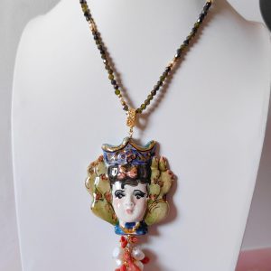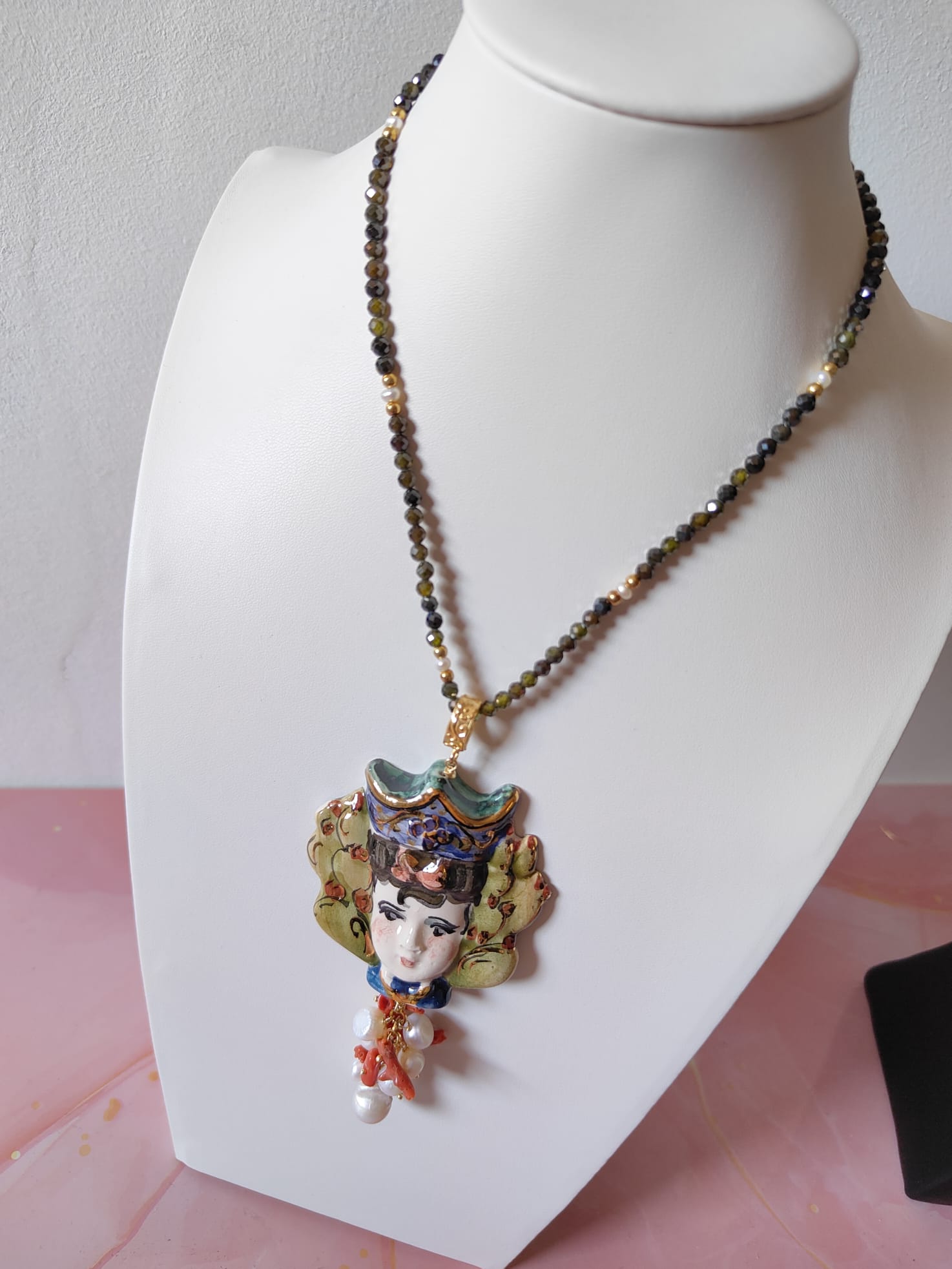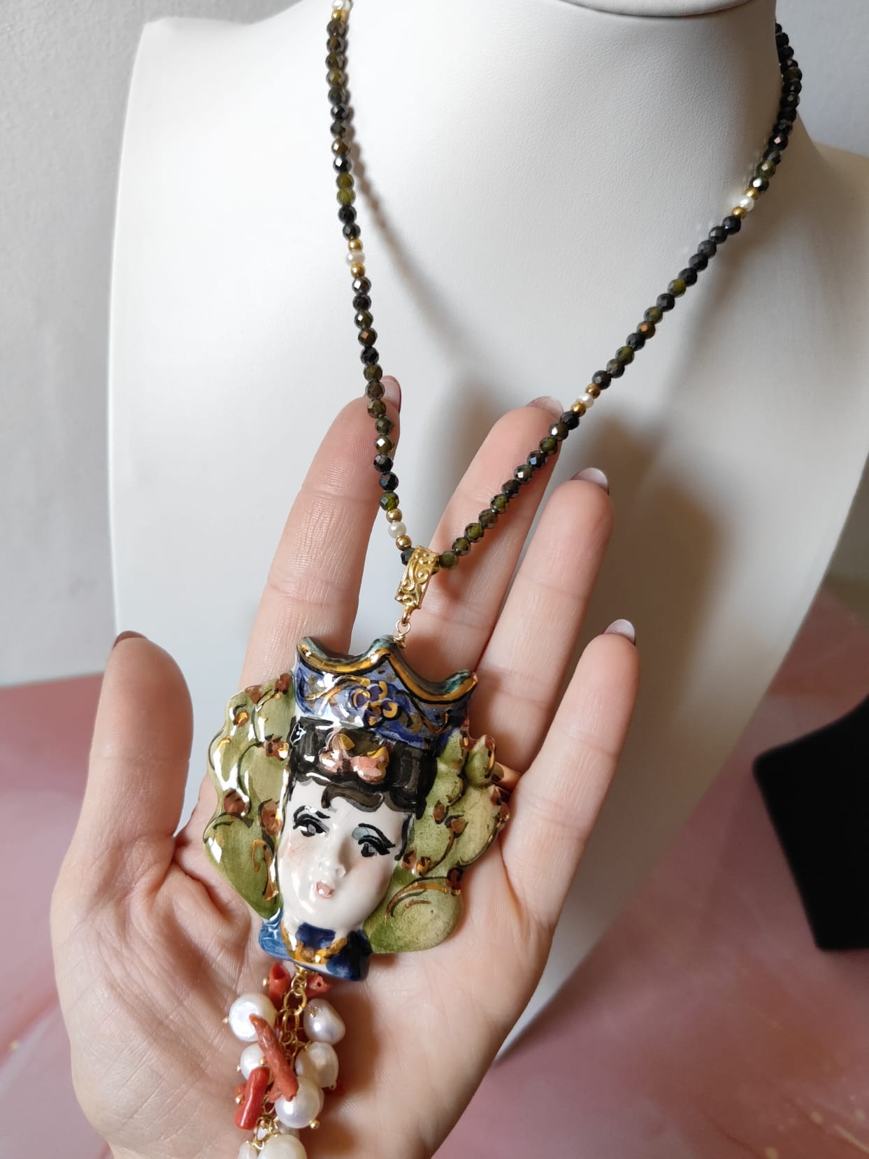 Il girocollo è composto da splendide pietre di tormalina naturale sfaccettata, che riflettono la luce con delicate sfumature di verde, oro e nero. Le perline, unite da piccoli inserti dorati, creano un ritmo armonioso che accompagna lo sguardo verso il magnifico ciondolo: una testa di moro in ceramica di Caltagirone, modellata e dipinta interamente a mano.