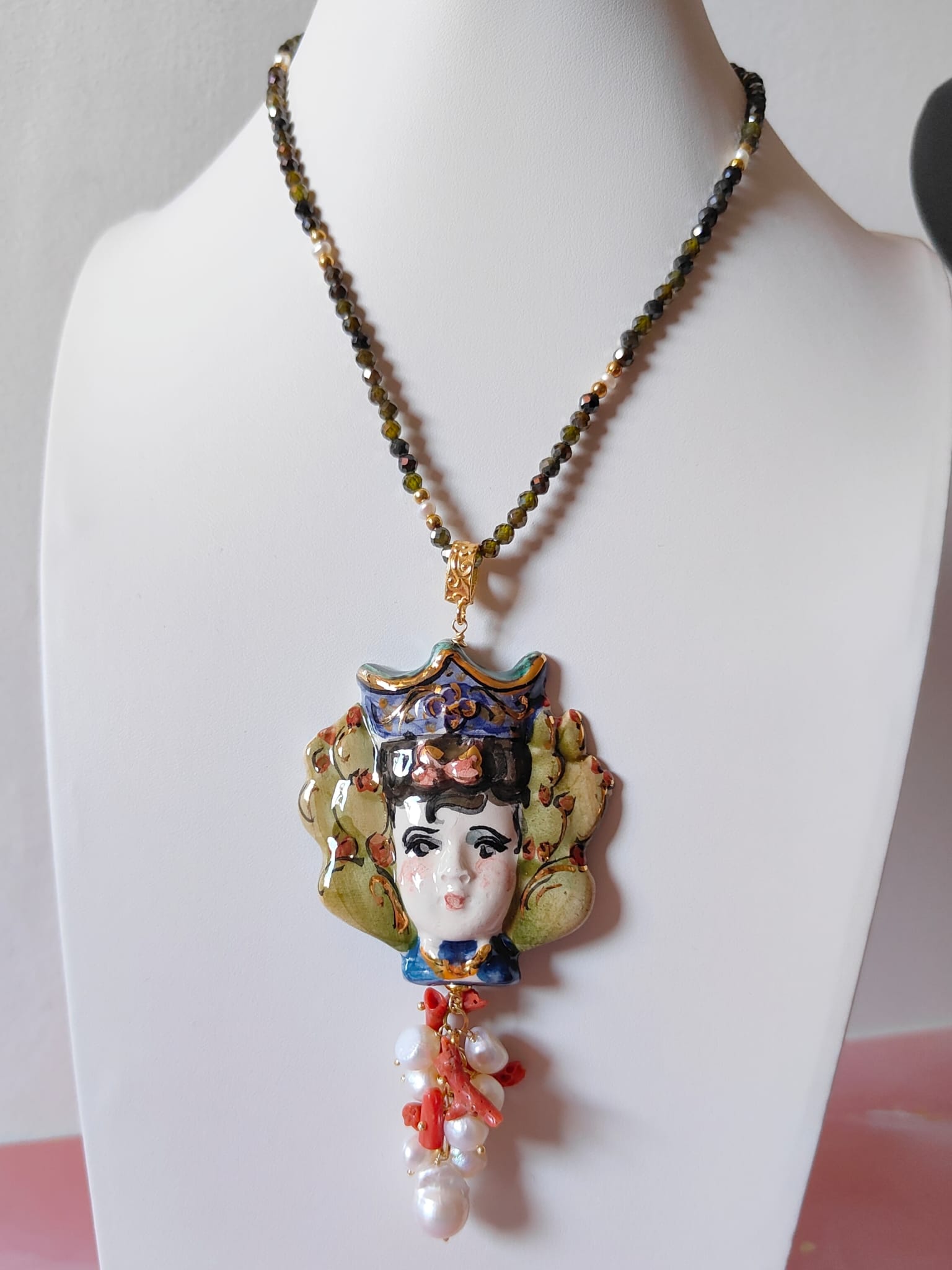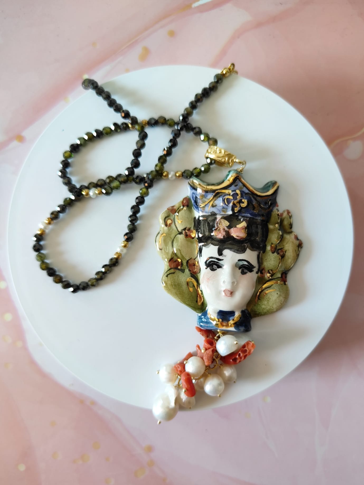 Il volto, dai tratti delicati e regali, è incorniciato da foglie e dettagli decorativi dipinti con smalti lucidi e riflessi dorati. Ogni pennellata racconta la maestria degli artigiani siciliani, custodi di un sapere antico. Alla base del ciondolo si trova un raffinato grappolo composto da perle naturali e rami di corallo grezzo, simboli di purezza e vitalità. Insieme, creano un contrasto elegante e luminoso.